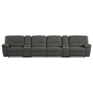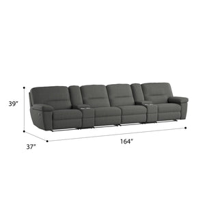 With an updated take on the traditional recliner sofa, the Alberta marries old fashioned comfort with current style. Contemporary charcoal gray, piped edging, and a modern approach to pillow tufting all come together to create this transitional set. Convenient handles tucked between the cushions allows the middle seast to also recline. Two consoles with stainless steel cupholders turn this sofa into the home theater must-have. The modular design of the Alberta allows the console, armless chair, and armless recliner to fit where you need it and the comfort will ensure it is everyone’s favorite place to be.