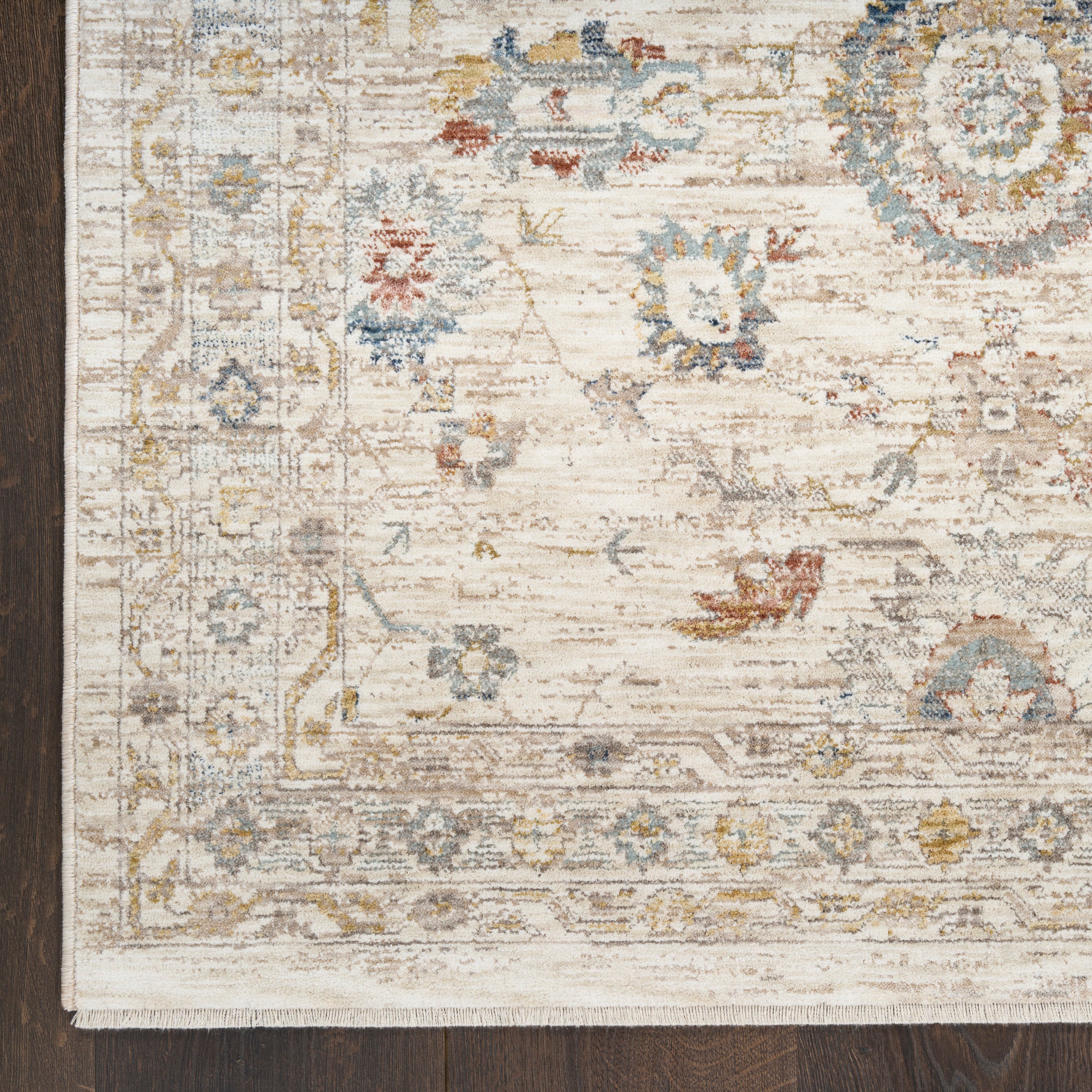 Invite a cozy, cottage-themed vibe to your decor with this vintage-style ivory multicolor rug from the Antique Fusion collection. The dainty floral pattern is complemented by artful distressing and short fringe edges, making it a great addition to farmhouse and cottagecore decor.