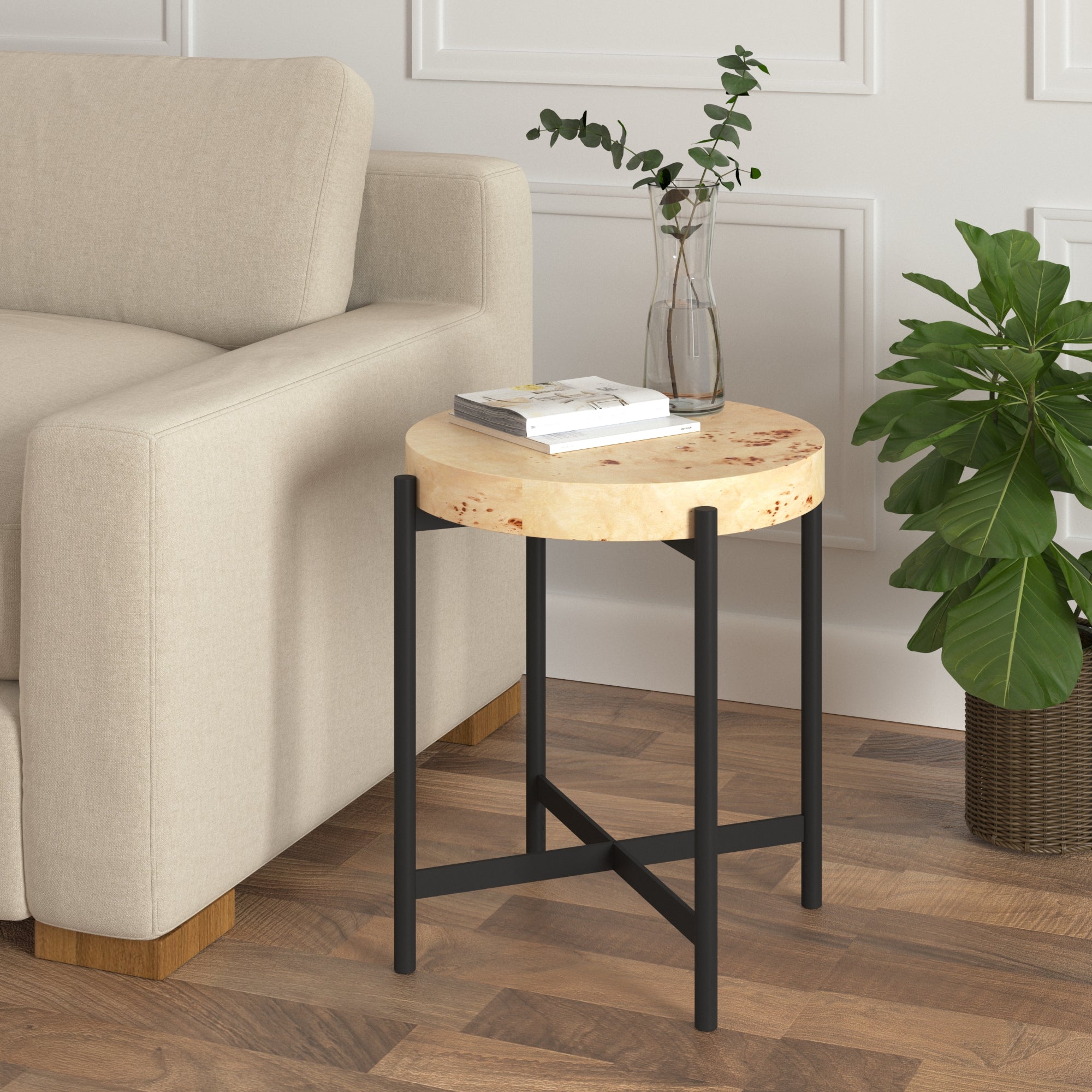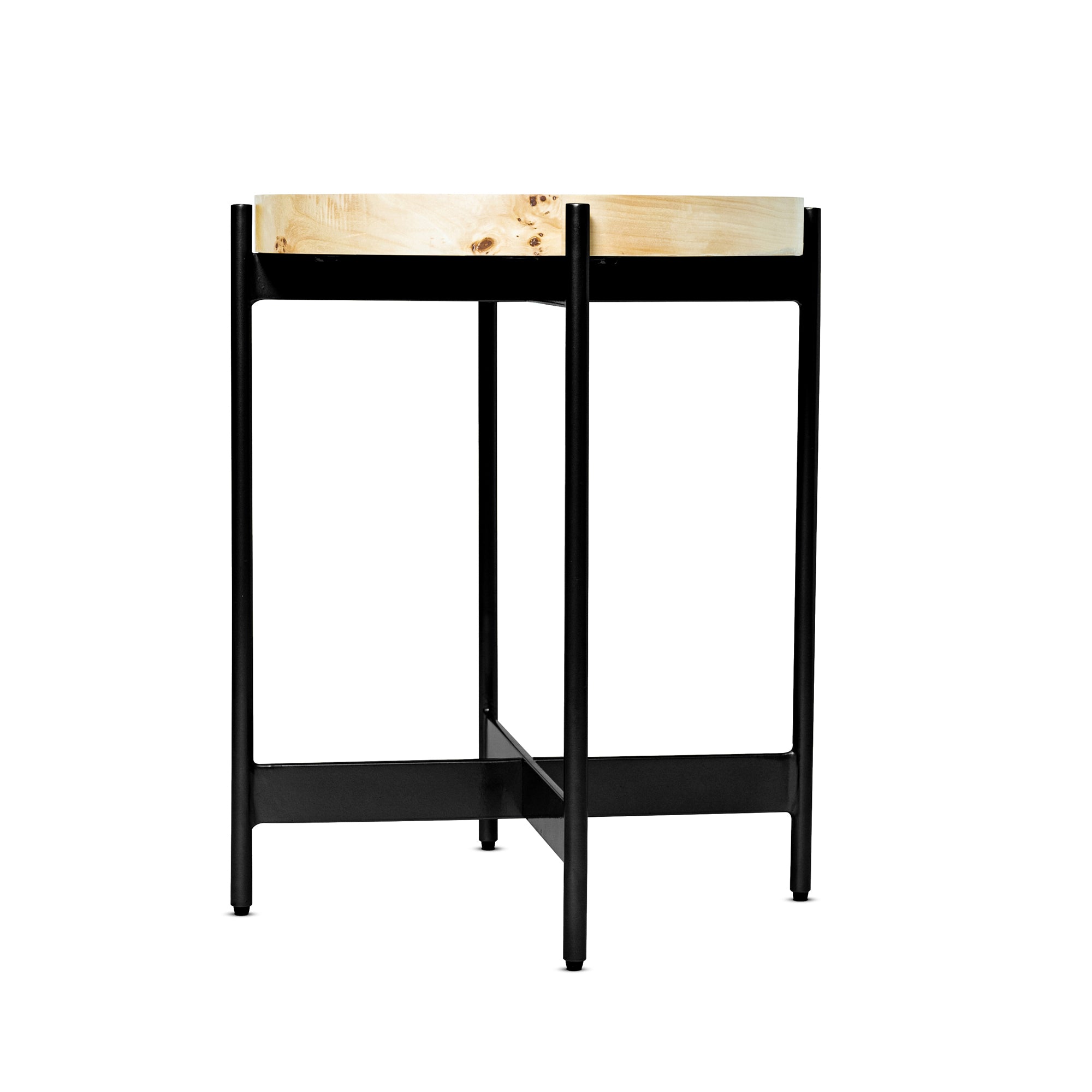 Introducing our Oren Hand-Made Burl Wood Side Table, a fusion of craftsmanship and style. Handcrafted in India, this side table embodies transitional, casual, and bohemian aesthetics. Burl veneer is an intricate grain pattern that is derived from the external knots or growths on the trees when they have experienced some type of trauma or injury. Though derived from trauma, they add a unique beauty to each piece. Its solid build guarantees stability, making it a perfect choice for your living room or guest room. Versatile and decorative, it functions seamlessly as both a side and end table. Elevate your space with this exquisite piece of furniture that effortlessly complements any interior.