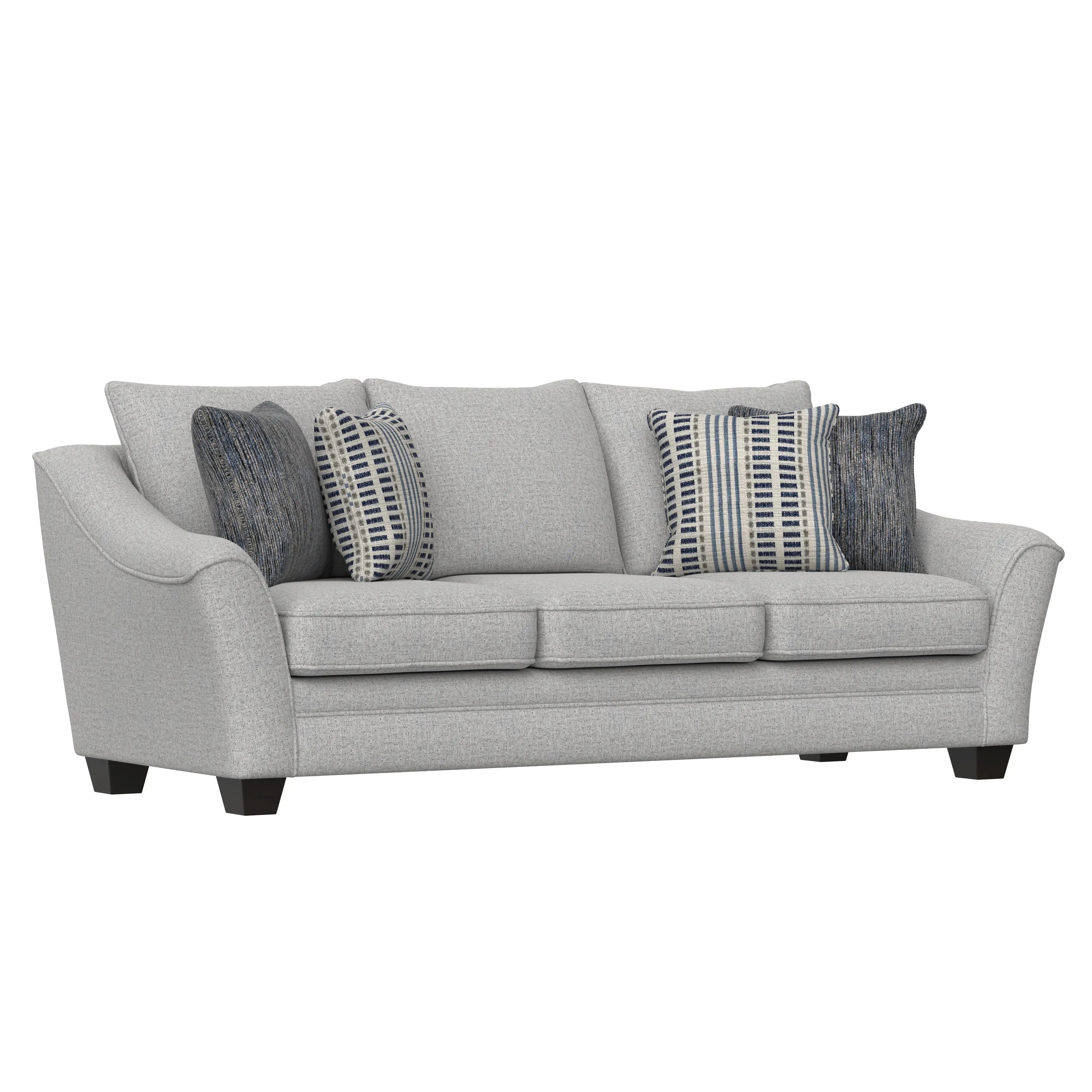 Understated flair and cozy chenille fabric wait for you in the Casey Collection. The classic contemporary frame is updated with flared arms accentuated by welting for a subtle saddle shape. Pillow-shaped back cushions blend the casual appeal of a scatterback with the tidiness of a more traditional box cushion. Upholstered in soft light gray with flecks of dark gray for added depth, the Casey Collection includes a sofa, loveseat, and chair, accompanied by an accent oval ottoman featuring hidden castors. Flip the top from cushioned upholstery to a dark wood tray to discover hidden storage. Complete the look by tossing on the included accent pillows in a blue and gray geometric print and a textured stripe in shades of navy. With Casey, every moment is a home run in comfort.