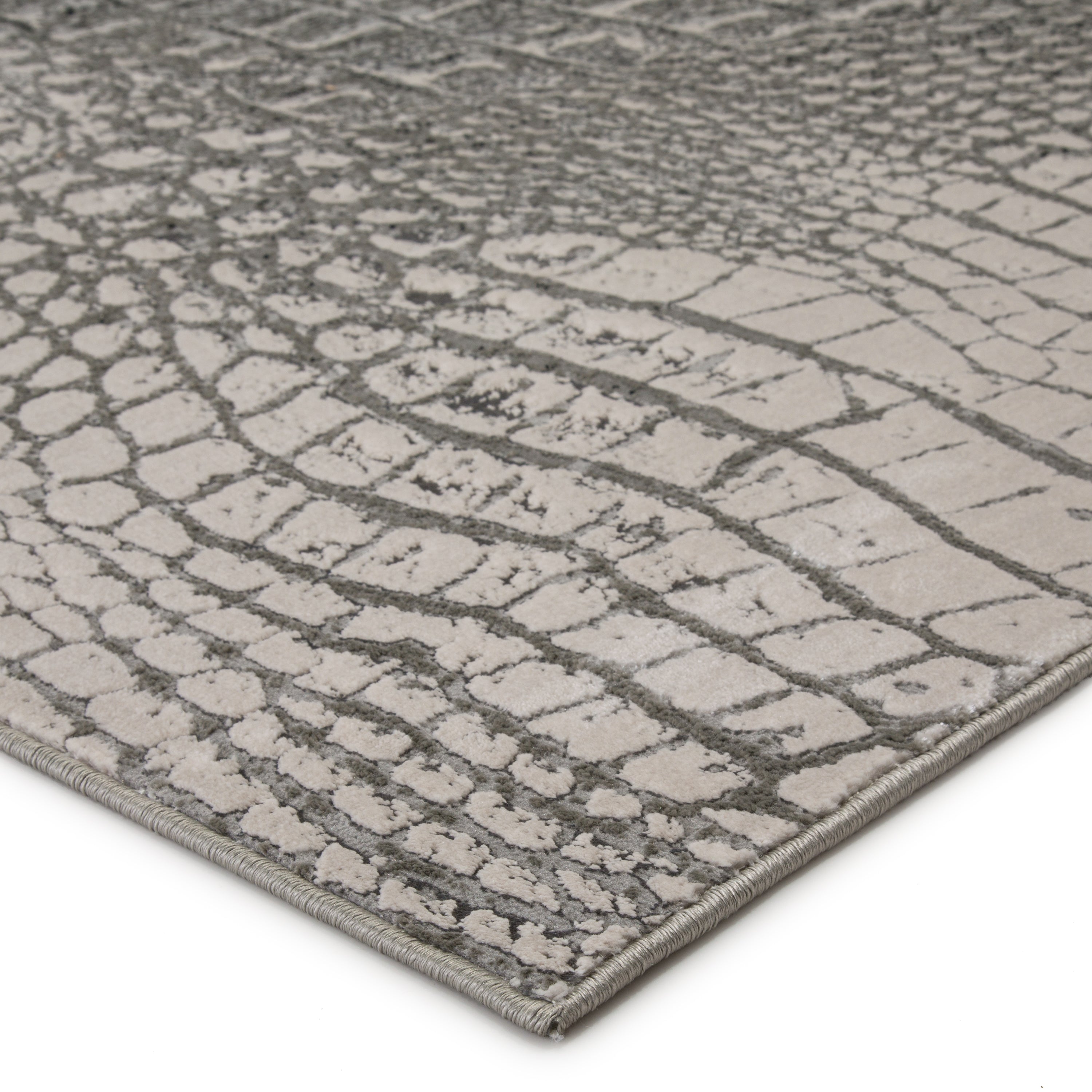The show-stopping yet surprisingly versatile appeal of the Catalyst collection brings contemporary edge to any home. The sleek and stunningly eclectic Canberra rug boasts a beige, silver, and grey reptilian motif that lends the perfect touch of exotic style to on-trend spaces. This wildly textured power-loomed rug features metallic polyester fibers blended with stain-resistant polypropylene for a brilliant sheen from various perspectives.