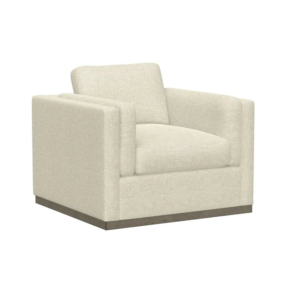 Cecily draws quiet attention with its balanced blend of structural and tailored shapes. Starting with a solid wood floating base, soft, cream-colored fabric covers the uncluttered lines and clean silhouette of the sofa, loveseat, and chair. Swivel chairs in floral and windowpane patterns are trimmed on all edges with shapely wood for stylish accessories. Completing the ensemble is a coordinating ottoman with hidden storage and castors to glide with ease. The Cecily collection will be the belle of your room with its transitional appeal.