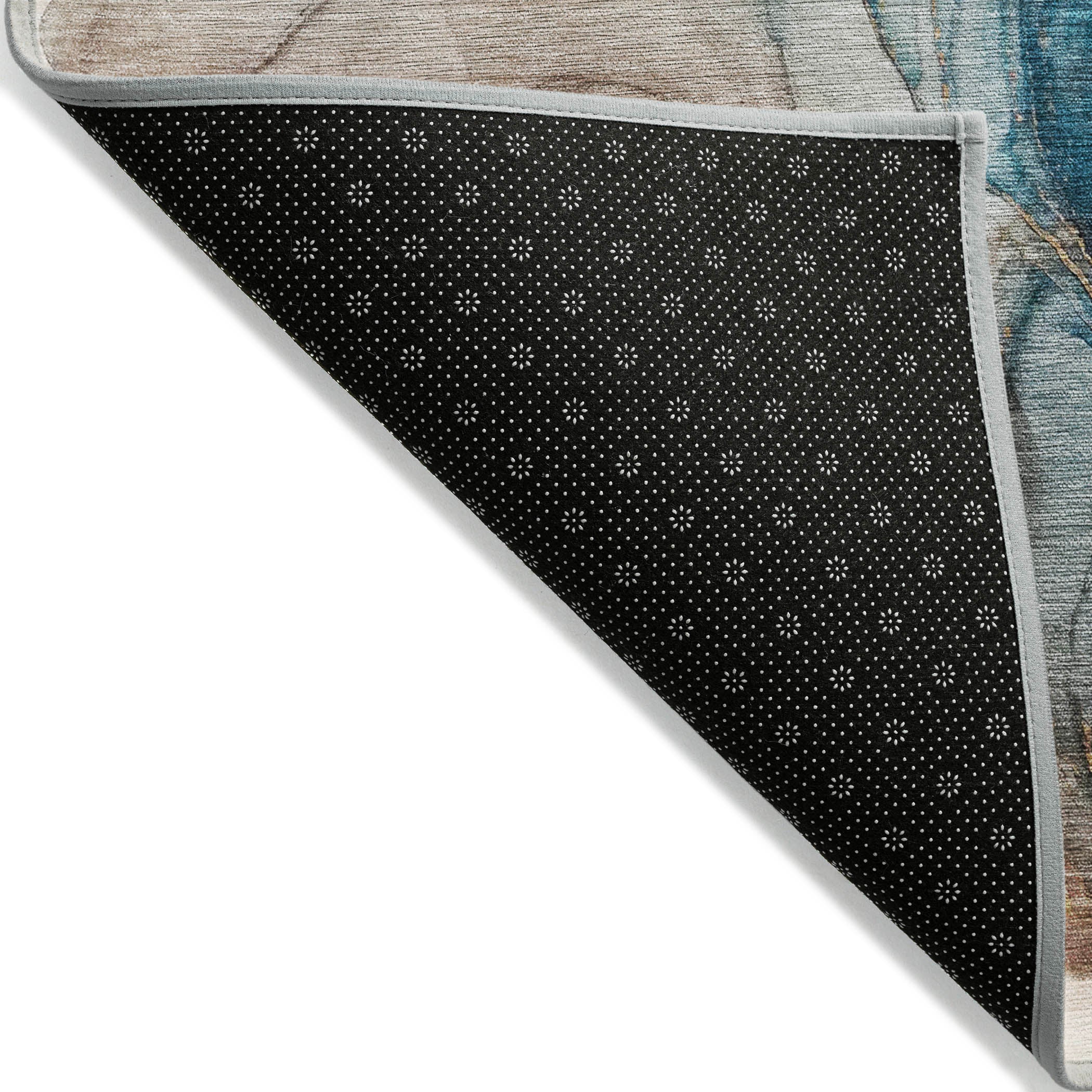 Experience the serene beauty of our transitional area rug, featuring soft organic shapes that create a modern flared pattern. Ideal for indoor or outdoor use, this UV stabilized rug is designed with an ultra-thin construction and a built-in non-skid backing, eliminating the need for a separate rug pad. It's machine-washable and family and pet-friendly, providing convenience alongside style.