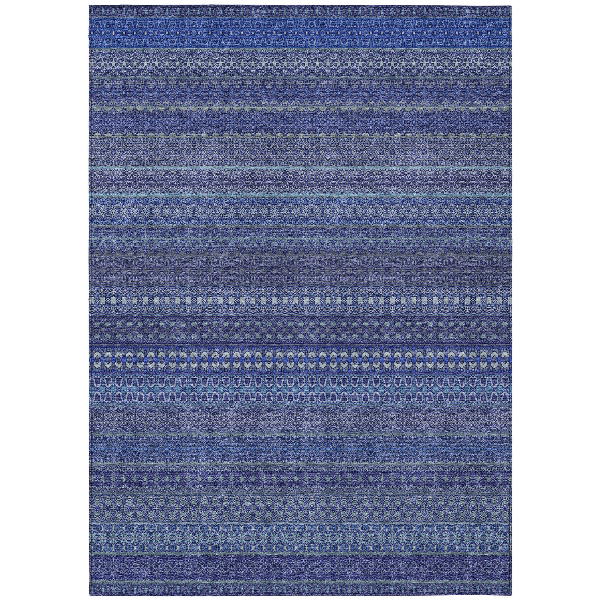 Step into a world of whimsy with our area rug, featuring an eclectic mix of shapes and motifs that add a touch of playfulness to your floor. This transitional striped rug is a true statement piece. With UV stabilization, it can be confidently placed indoors or outdoors. The ultra-thin construction includes an incorporated non-skid backing, ensuring stability and removing the need for a separate rug pad. It's machine-washable and designed to withstand the demands of a family-friendly home.