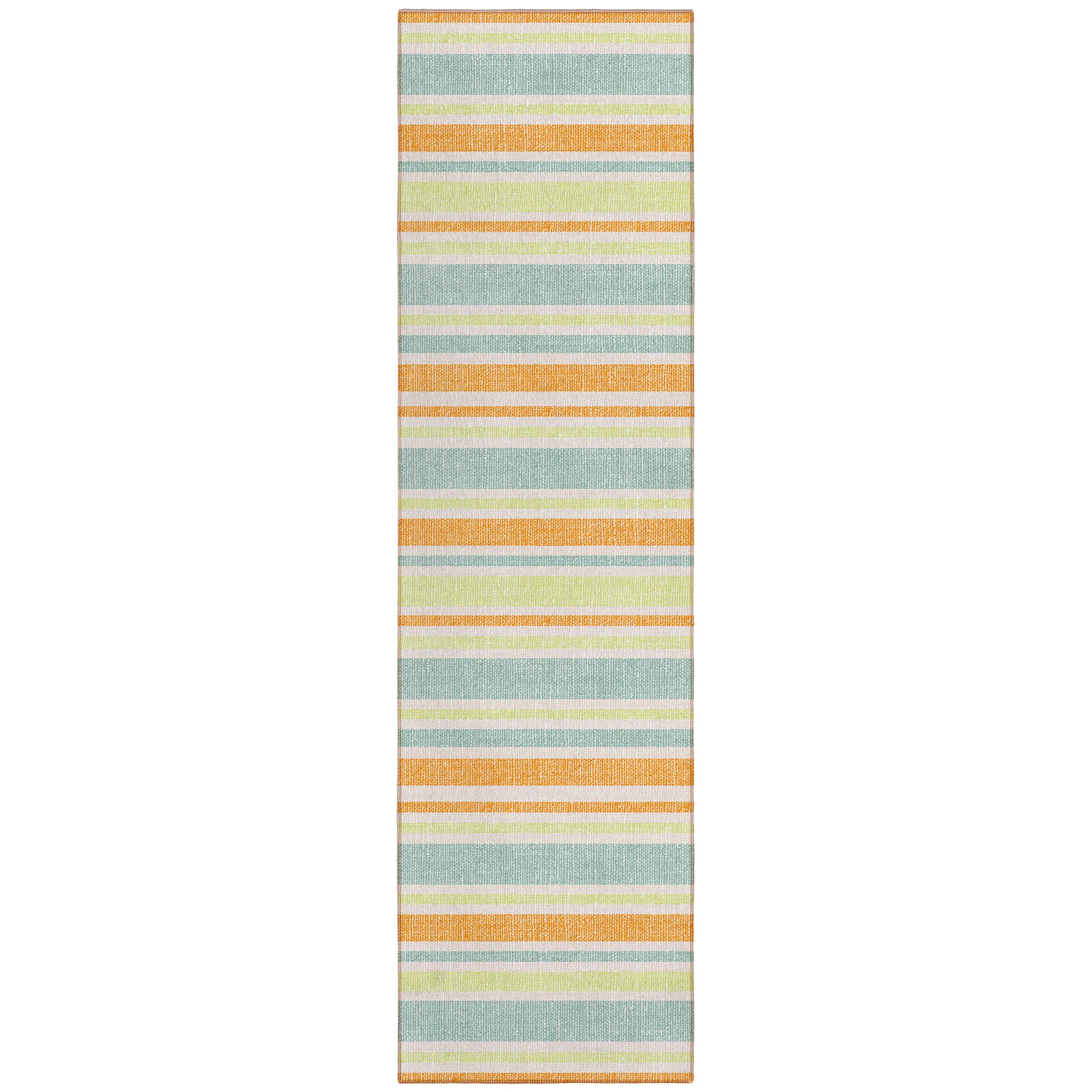 Make a bold statement in your space with our area rug featuring stripes that offer complementing colors to catch the eye and add energy to the room. This transitional striped rug effortlessly enhances any décor. It is UV stabilized for indoor or outdoor use, and its ultra-thin construction with an incorporated non-skid backing eliminates the need for a separate rug pad. Machine-washable and family and pet-friendly, this rug offers convenience and versatility.