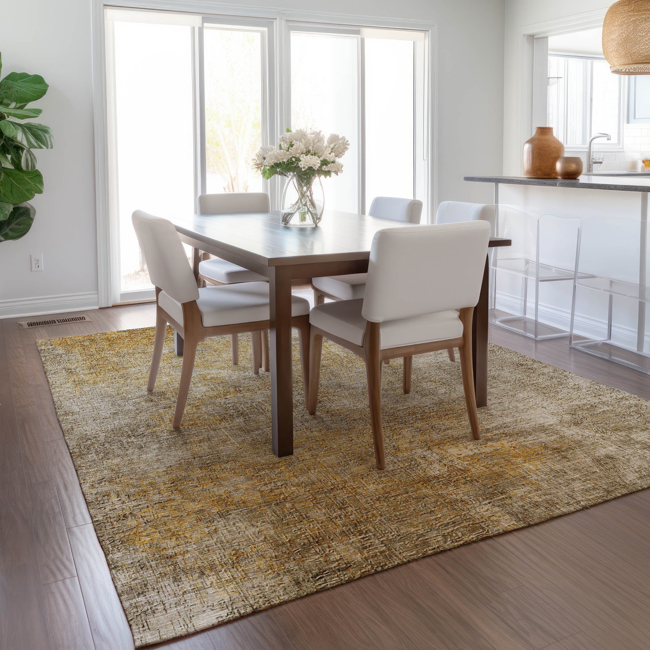 Elevate your living space with our transitional area rug featuring a modern stucco-like texture that adds depth and visual interest. This unique design blends seamlessly with both modern and traditional decor, providing a versatile style solution for any room. The rug is UV-stabilized to preserve its vibrant hues in indoor or outdoor settings. Its ultra-thin construction boasts an incorporated non-skid backing, so there's no need for a separate rug pad. Family and pet-friendly, this machine-washable rug offers the ultimate in convenience and durability.