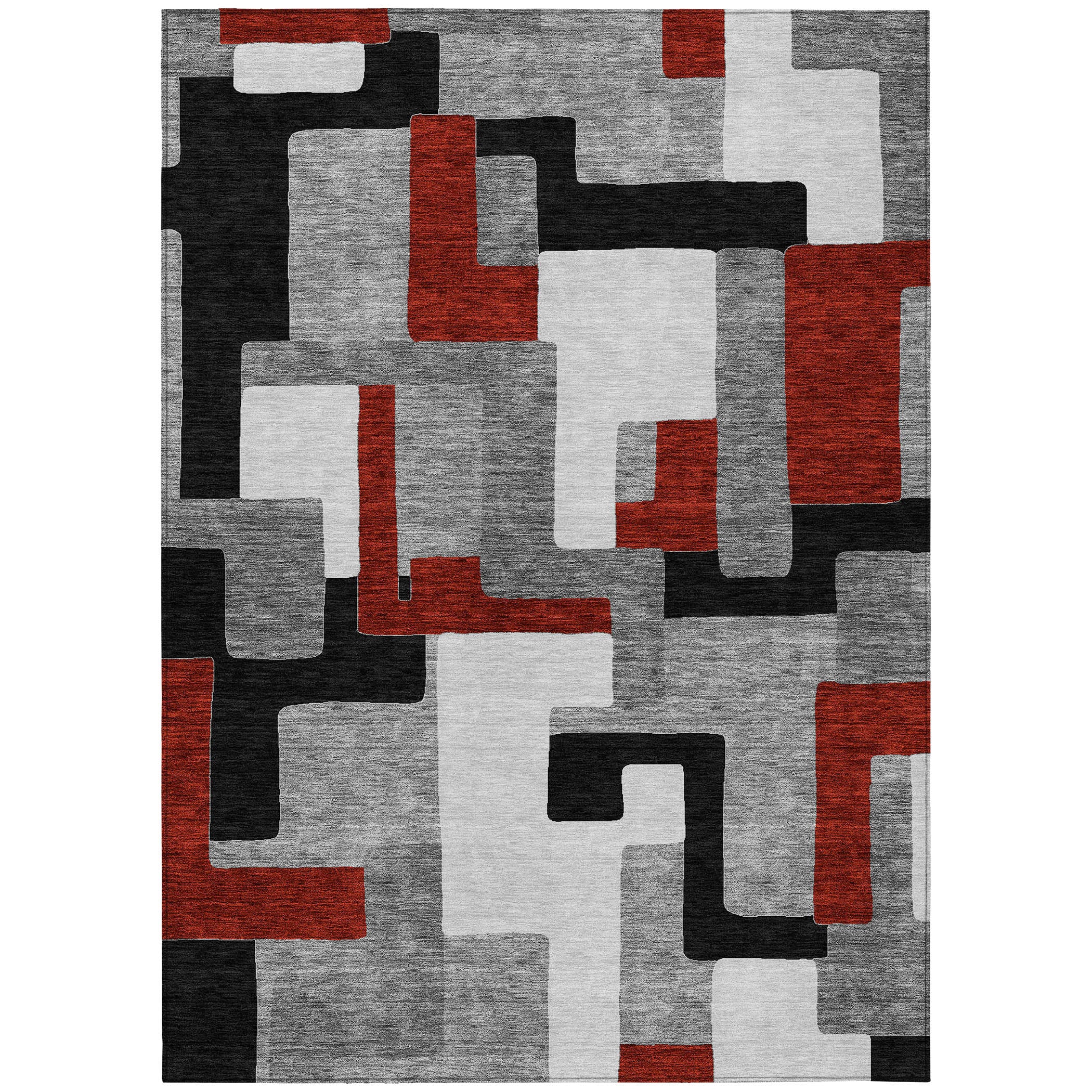 The clean geometry of our area rug's random rectangle shapes is complemented by straight lines, making it a seamless addition to transitional decor. Crafted for practicality, it offers UV stabilization for use anywhere around your home, an ultra-thin design for a neat fit, and machine-washability for stress-free upkeep in a family and pet-friendly environment.