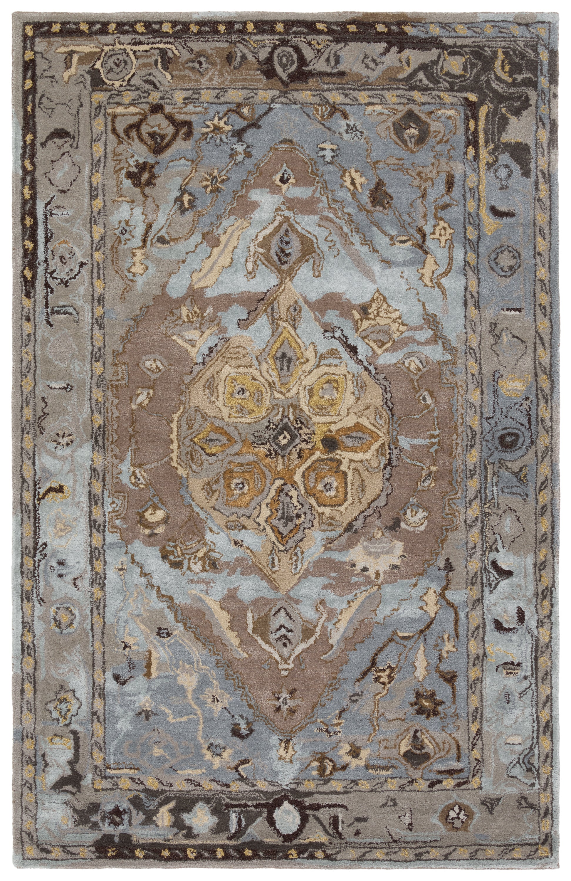The Citrine collection is an assortment of distressed Old World patterns reinterpreted for modern design. The hand-tufted Raisa rug features an antiqued center medallion in elegant, neutral hues of light grey, light blue, gold, and taupe. Made of wool and viscose, this timeless rug boasts an ultra-soft feel and elegant sheen.