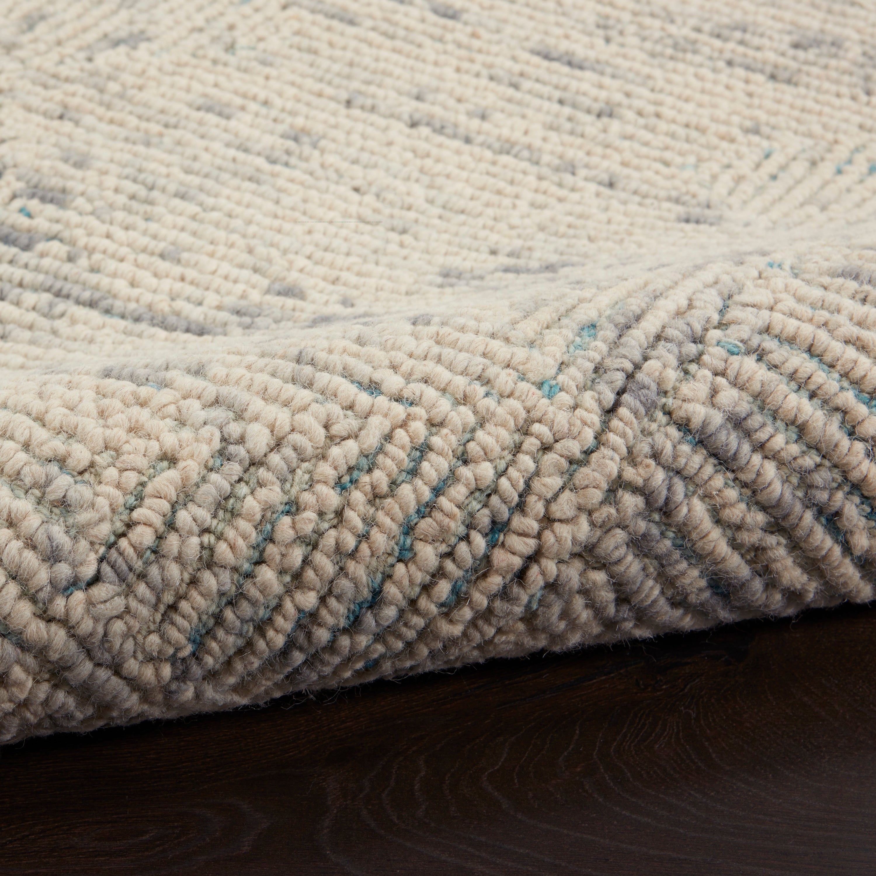 Hypnotic rectangular rhythms are shaped into the hand-tufted, loop pile of this Colorado area rug. Its richly textured surface presents a subtle shadow-play that invites admiration. Engaging and versatile for decorating in a modern color combo of ivory and grey touched with teal.