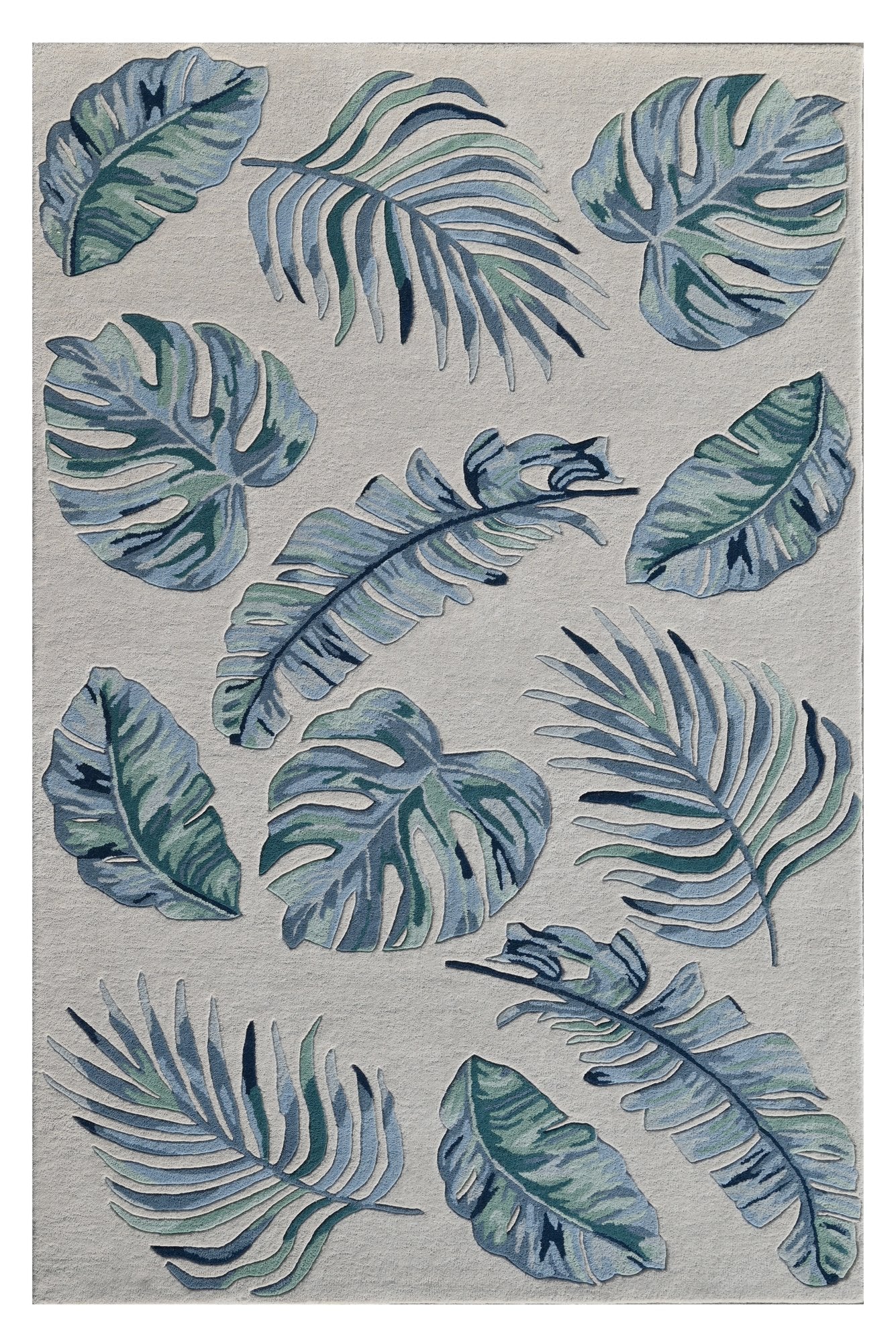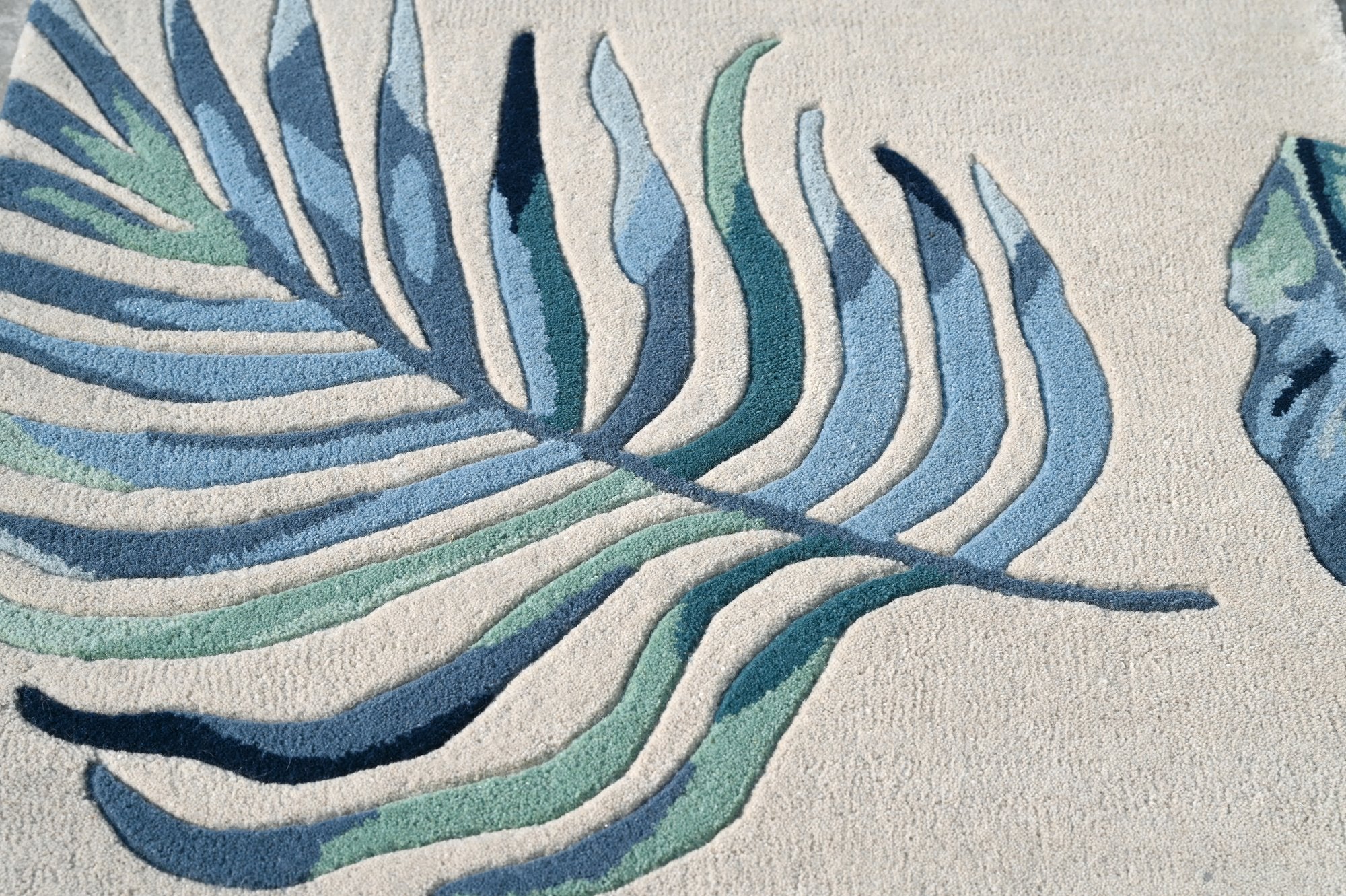 Journey on a tropical getaway to a bright, lush Cove! Cove's vivid tropical and floral palm design rugs are hand tufted of dense fine wool with hand carved dimensional details. This beautifully bold collection is made in India and has a ¾" pile height. Cove 3005 Ivory/Blue Leaves 2'3" x 7'6" Runner. Hand Tufted of Wool with Cotton Backing. Made in India. Vacuum regularly & spot clean stains. Professional cleaning recommended periodically.