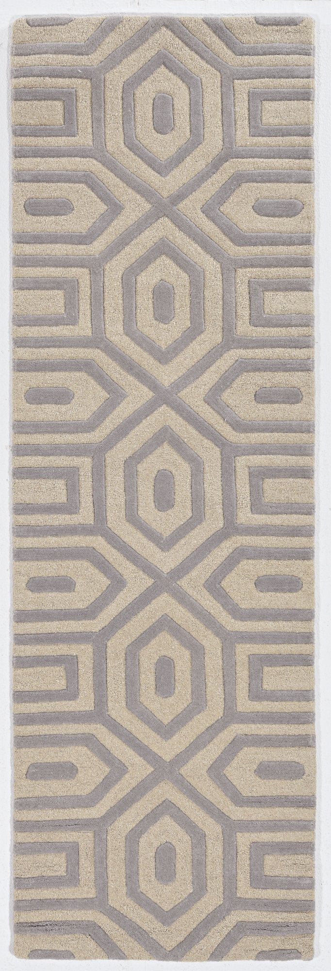 Step into our world and experience a multi-textured masterpiece from our Eternity Collection. Hand- tufted in India of 100% quality wool, these rugs are woven using multi-textured wool, a versatile color palette and a Hi/Lo effect, bringing modern simplicity into our lives. The combination of timeless colors and a variety of textures will create an everlasting presence in any room while setting the foundation for any decorating style. Eternity 1062 Grey Escape 2'3" x 7'6" Runner. Hand Tufted of Multi-Textured Wool with Cotton Backing. Made in India. Vacuum regularly & spot clean stains. Professional cleaning recommended periodically.