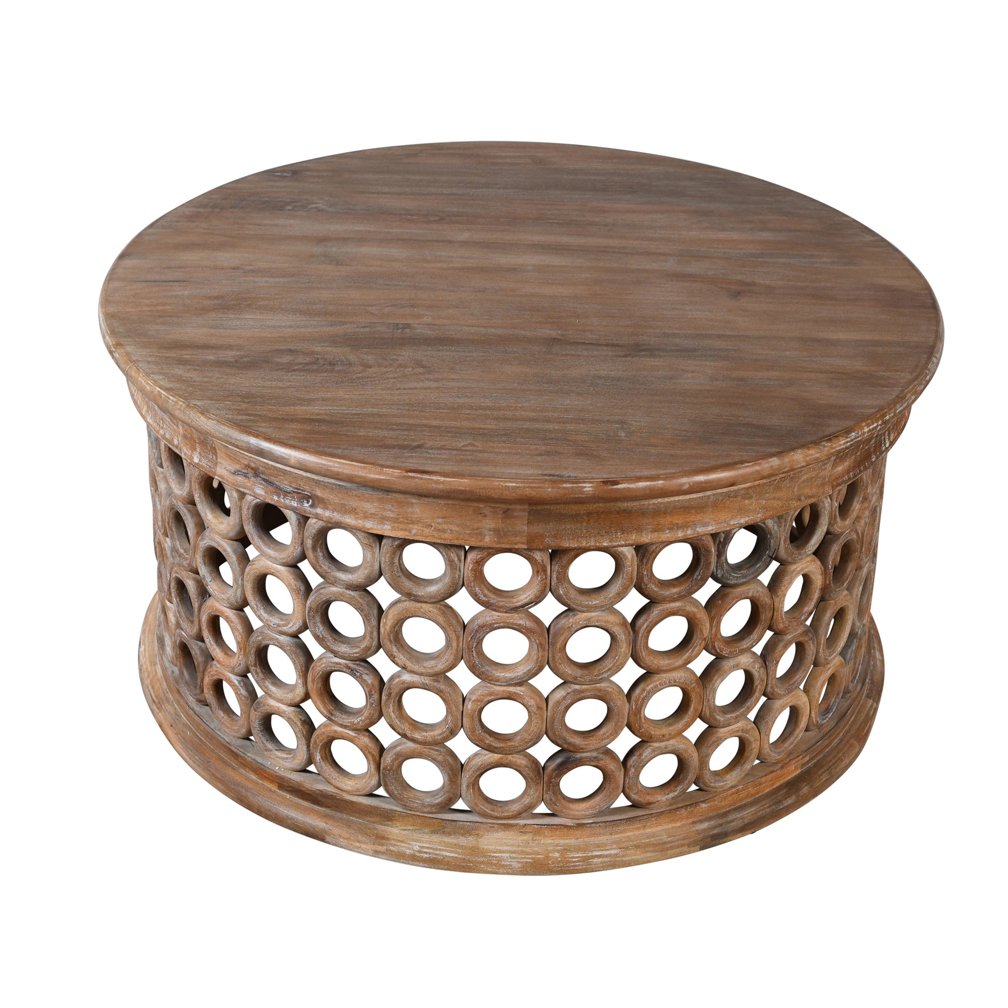 Introduce a touch of natural charm to your living space with our handmade solid wood lattice table. This unique piece, handcrafted in India, is made from 100% mango wood, ensuring a durable and distinctive addition to your home. Its round design and rich brown finish perfectly compliments the natural wood grain making it a standout centerpiece in any room. The modern farmhouse style brings a classic, warm, and inviting atmosphere. Perfect for casual gatherings or displaying your favorite décor items, this table combines functionality with visual aesthetic. Bring elevated style to your space with this beautiful hand-crafted table.