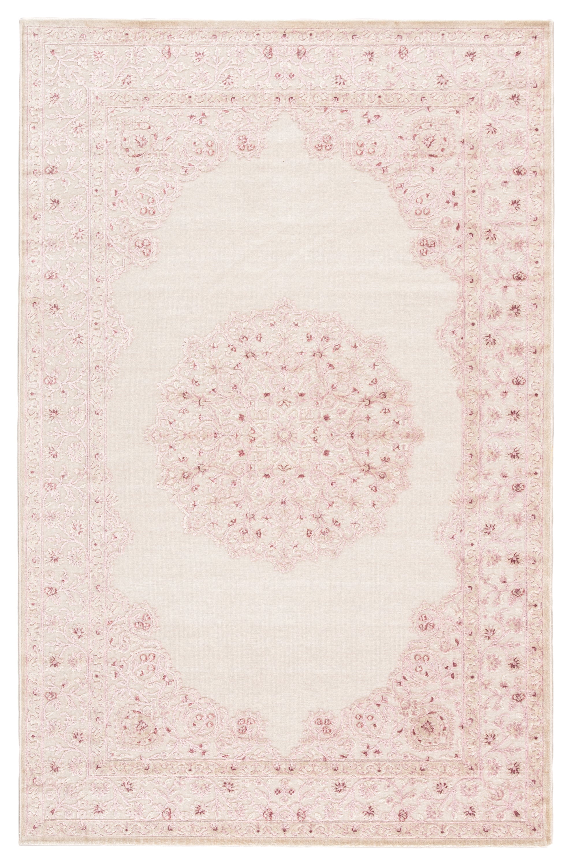 Soft to the touch and alluring with a distinctive high-low texture, this rayon and acrylic blend area rug lends the perfect accent to bedrooms. A feminine pink and white colorway offers contemporary glamour to the global-inspired center medallion and scrolling border detail of this elegant layer.