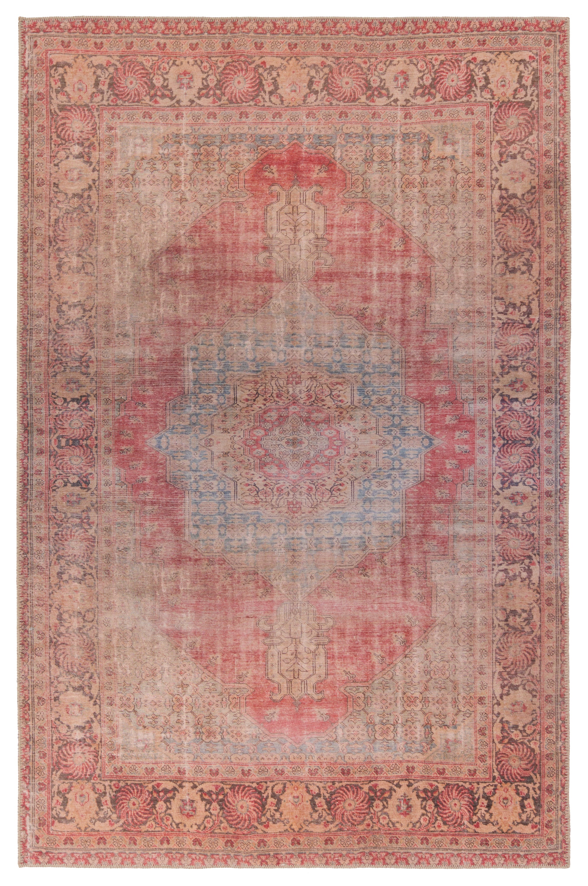 Inspired by well-traveled vintage designs, Kate Lester has joined with Jaipur Living to launch the Harman collection. This impressive assortment of antique textile designs lends heirloom-quality looks and livable style to any space. The Leonine area rug showcases a vibrant medallion pattern emphasized by hues of red, tan, and blue. This digitally printed rug boasts a perfectly distressed effect for effortless charm that is matched with durability to stand up to heavily trafficked spaces such as entryways, halls, kitchens, and living rooms.