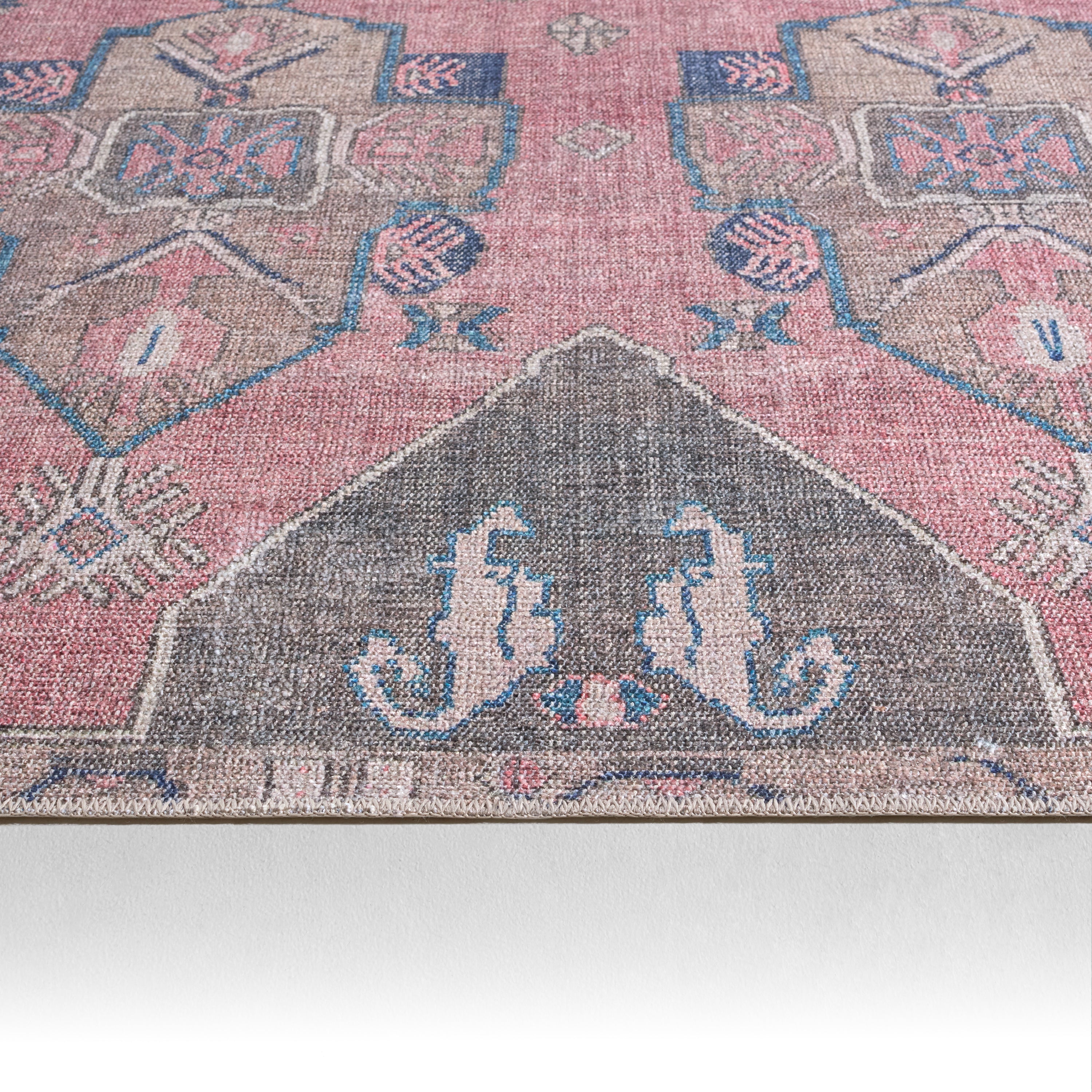 The vintage-inspired Kairos collection brings a playful and warm vibe to contemporary spaces. The Lani rug features an ornate medallion design in saturated tones of pink, tan, and dark blue. This printed style offers the timelessness of a classic Turkish motif with the versatility and affordability of a power-loomed rug.