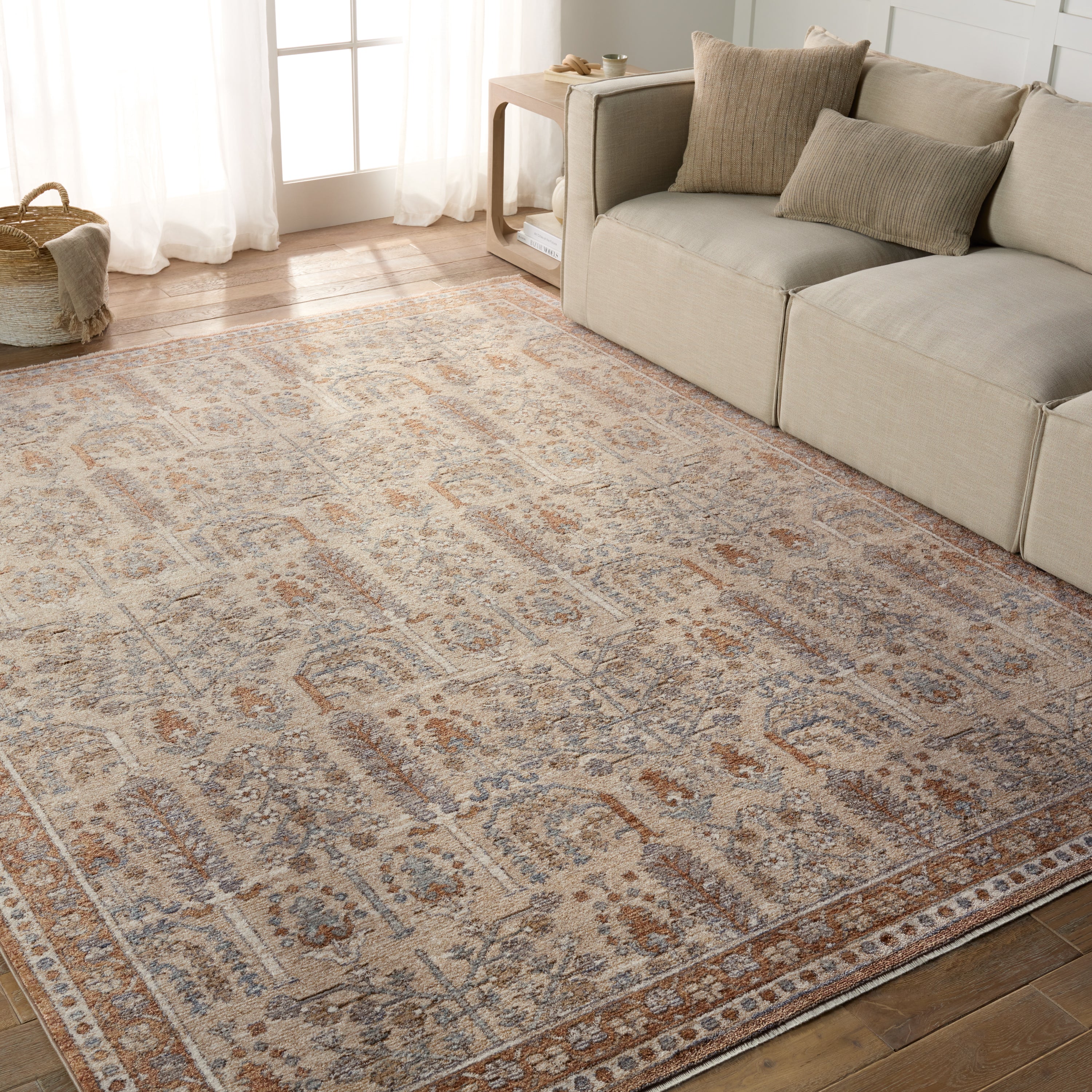 Inspired by the distressed perfection of antique textiles, the Lark collection is warm and inviting with rich, updated hues. The updated traditional Regard area rug showcases an intricate, floral design paired with short, cream fringe. The nature-inspired details spring to life in hues of slate, bronze, cream, and taupe. This indoor rug thrives in high and low trafficked areas of the home such as living rooms, halls, entryways, bedrooms, and dining areas.