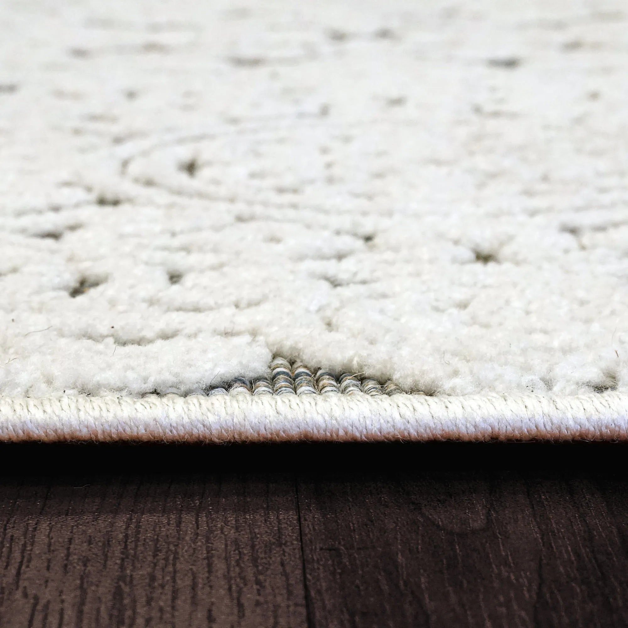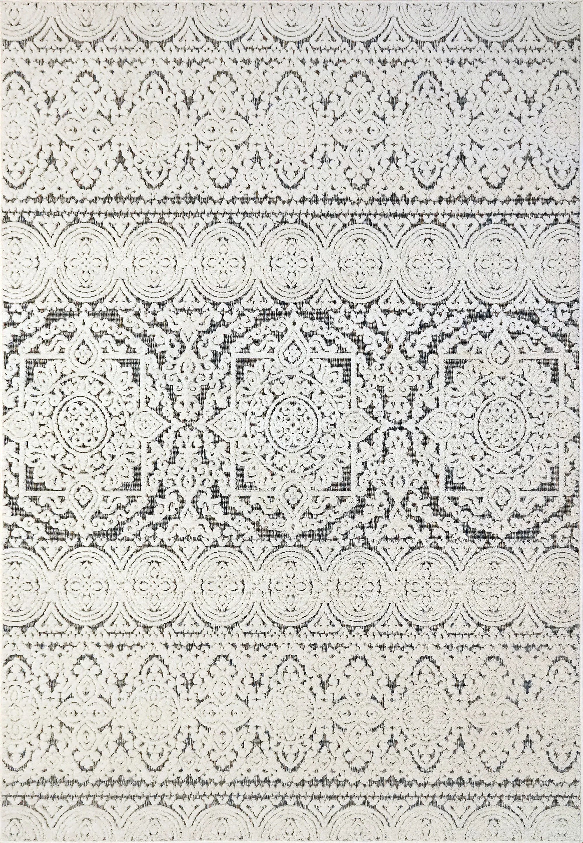 Lotus displays intricate contemporary designs that embolden any modern aesthetic. The detailed weaving in these rugs exists in three facets: the high-low texture, the changing yarn colors as a backdrop, and the designs. The color palette is more than meets the eye with these rugs, with ivory overlaying a more complex color scheme underneath, including black, blue, and multicolored yarns. Tightly woven and firm in their composure, these rugs are both durable and practical in their maintenance.