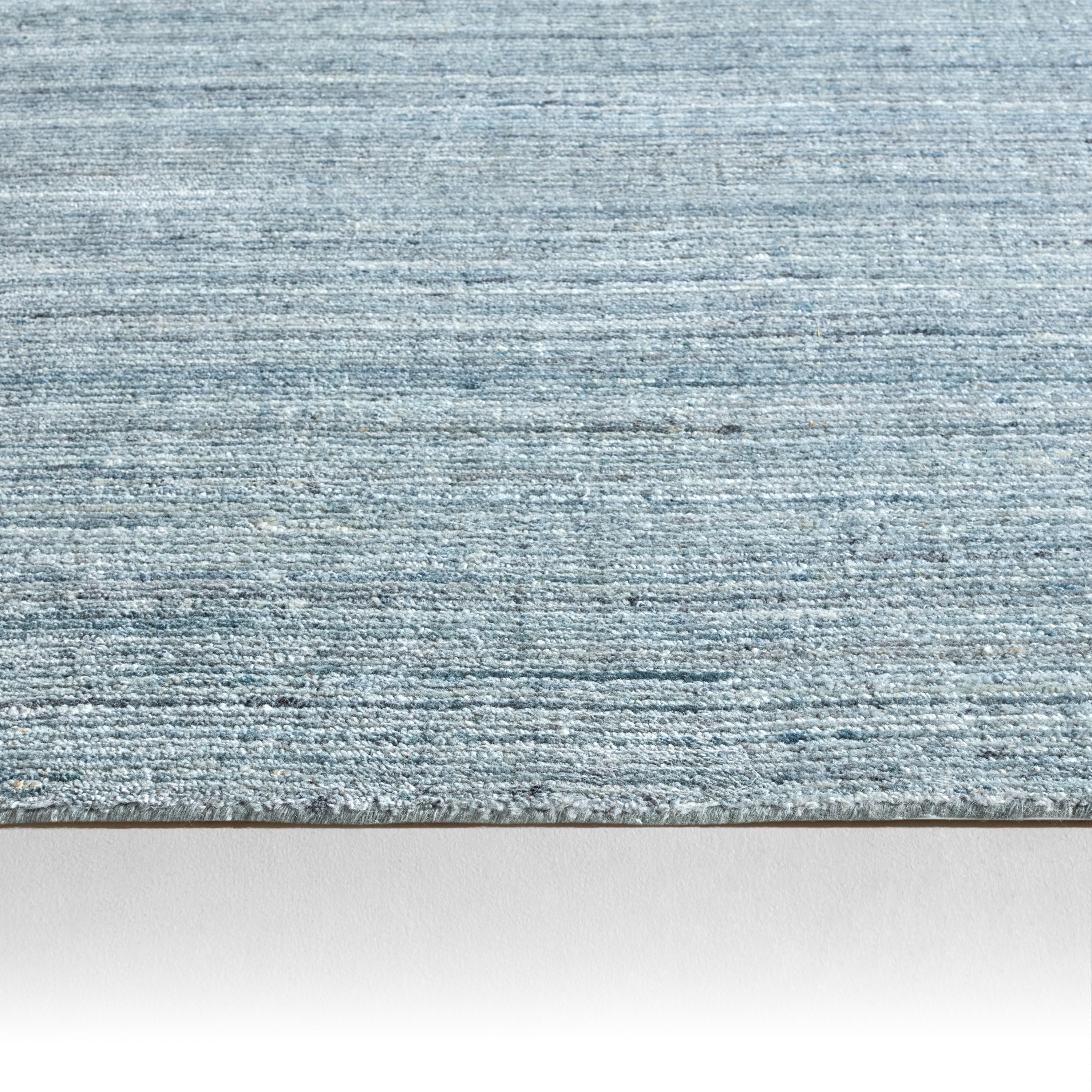 The Madras collection features handsome heathered designs and versatile modern appeal. Hand-loomed of viscose and wool, the Vassa area rug showcases a striated patterns of casually chic neutrals. This blue, grey, and ivory rug lightens any space while adding subtle dimension and rich natural texture.