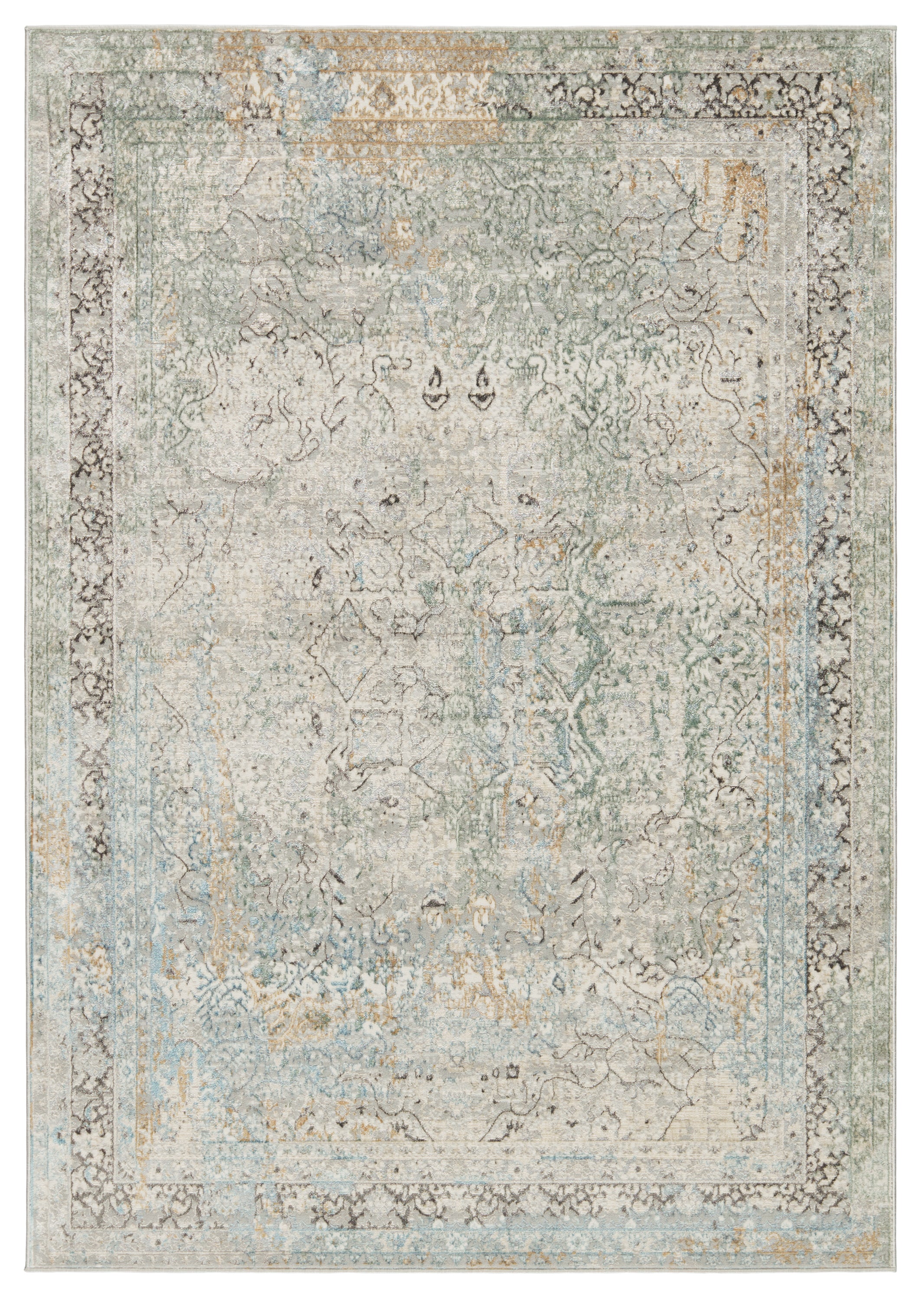 The glamorous yet versatile style of the Melo collection offers a chic, contemporary edge to any home. The Thayer rug boasts an elegant traditional motif in tones of green, light grey, cream, gold, light blue, and a hint of dark charcoal. This power-loomed collection features a stunning lustrous sheen and texture-rich, varied pile height for added dimension and depth.