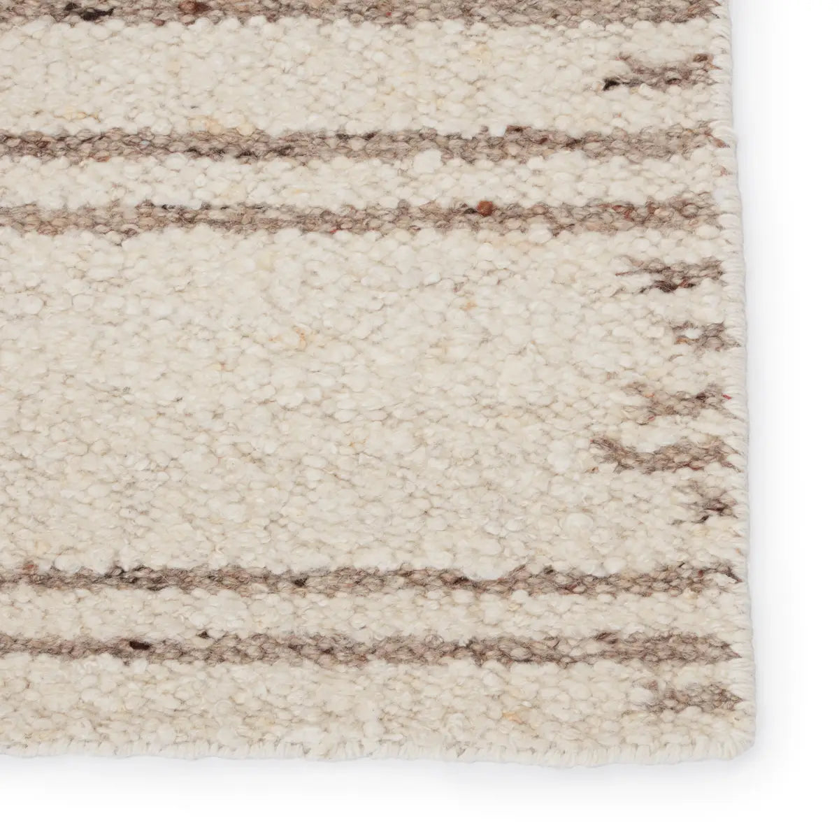 Rich with texture, the Mendoza collection expresses modern simplicity and inviting appeal. This rug boasts a re-invented kilim look with an on-trend shearling style and relaxed, neutral hues. Hand-loomed of soft and durable wool, this cozy rug features a colorway of ivory and tan with flecks of deep brown. The unique ticking stripe design offers clean-lined yet eye-catching pattern to any space.
