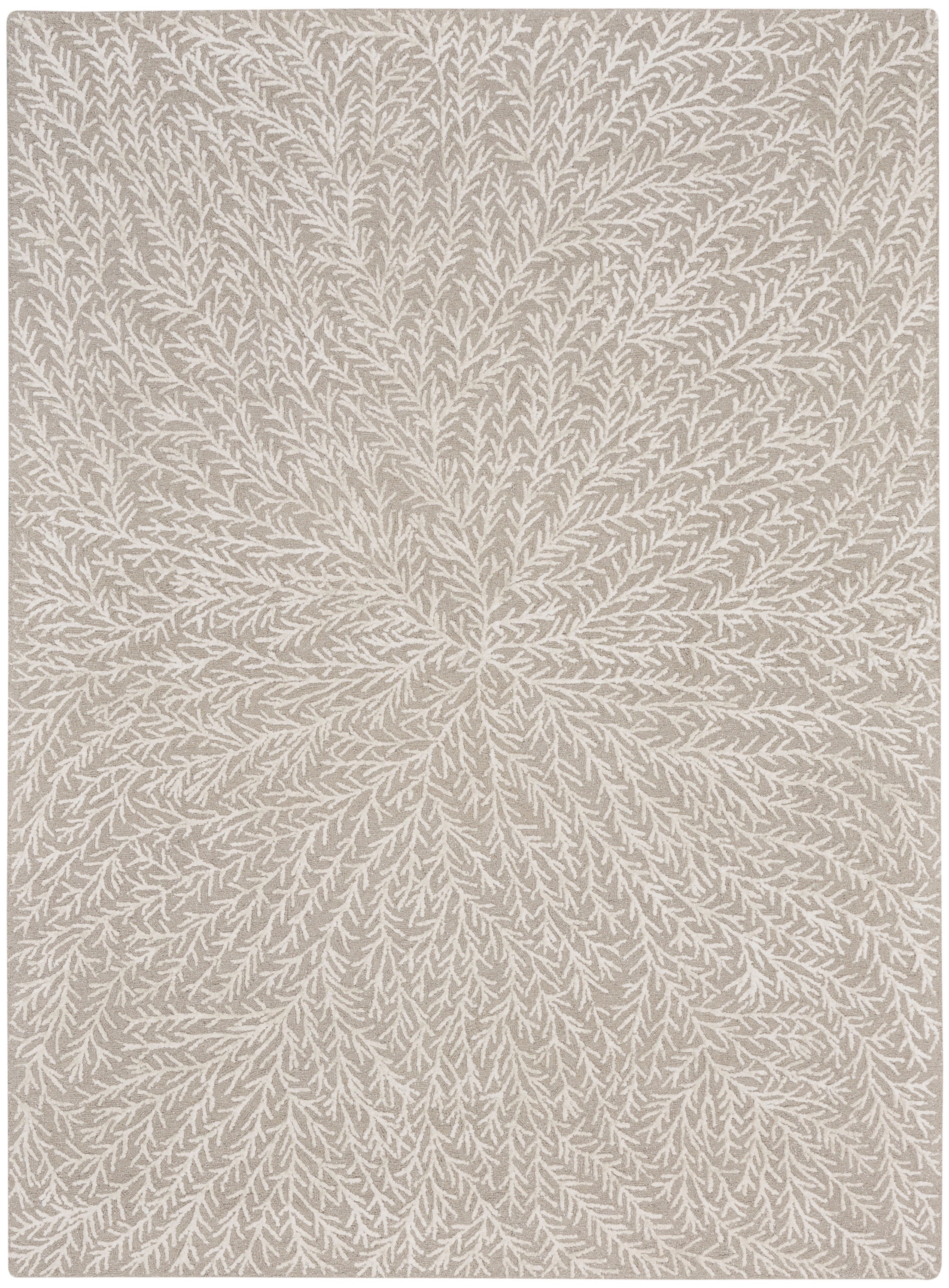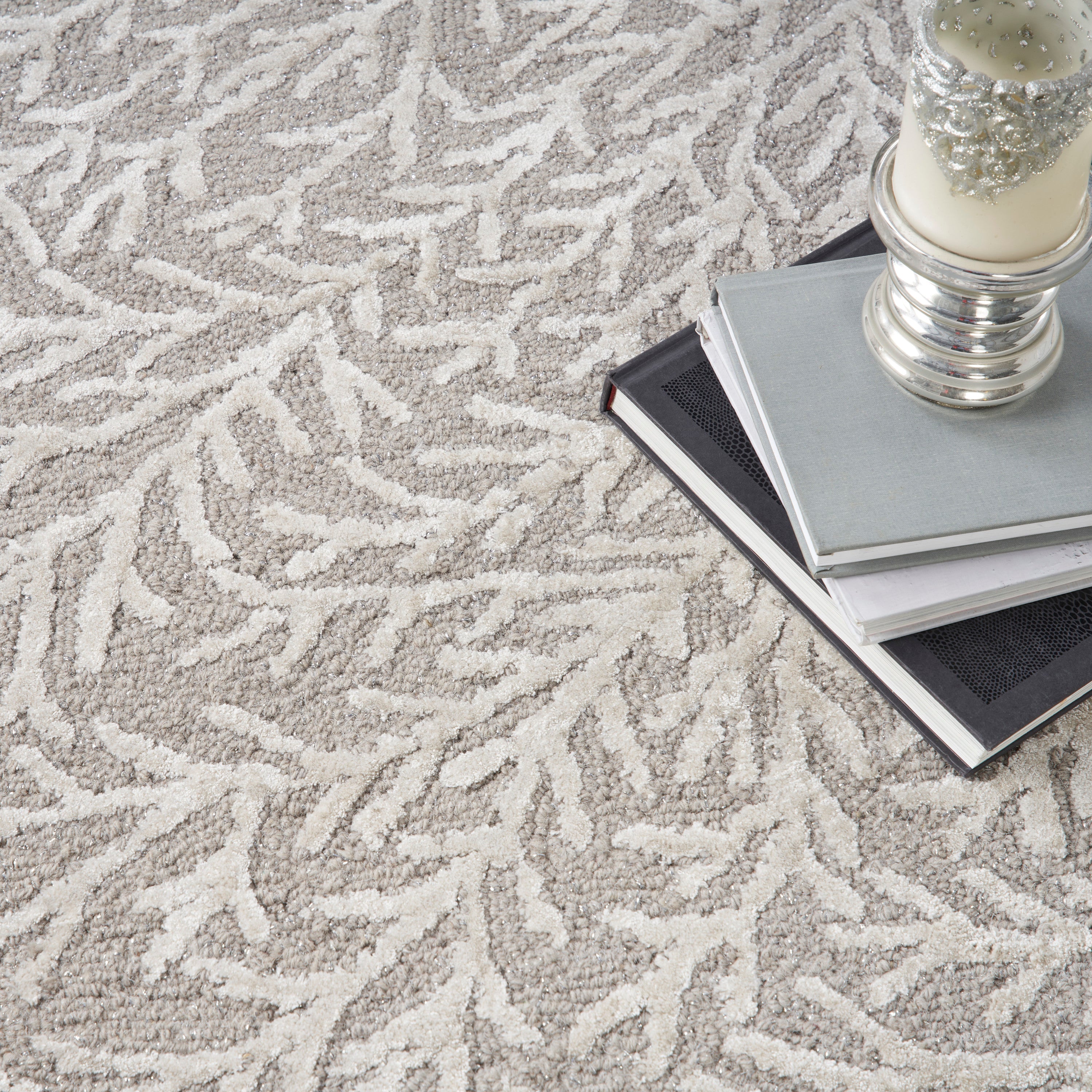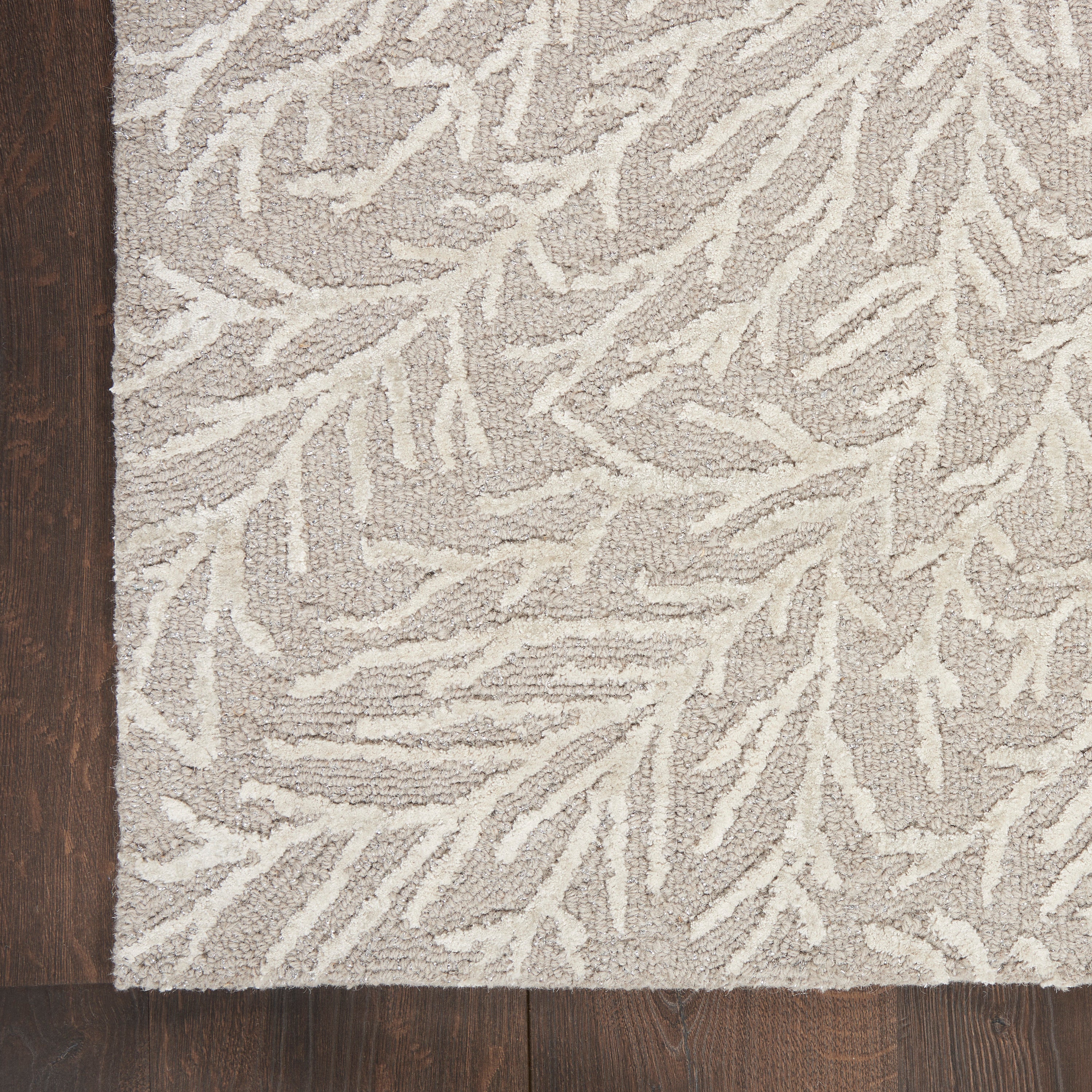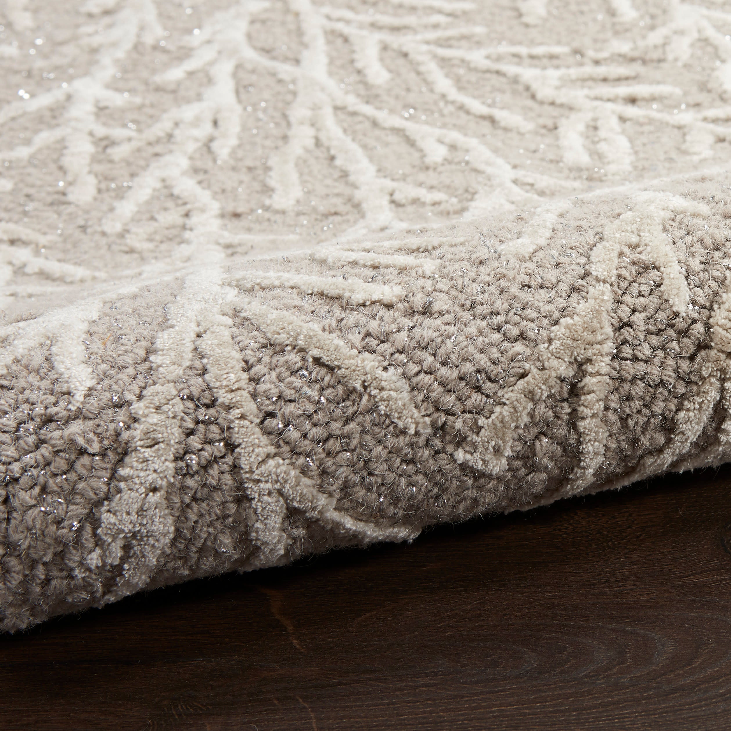 An elegantly understated addition to your décor, this abstract rug from the Michael Amini Star Collection by Nourison draws on the simple beauty of nature. A raised, radial pattern of fir branches in taupe grey is enhanced by shimmering accents that stand out stunningly against its solid ground. Handmade from a blend of wool, lurex, and silk-like Luxcelle for delightful texture and lasting style.