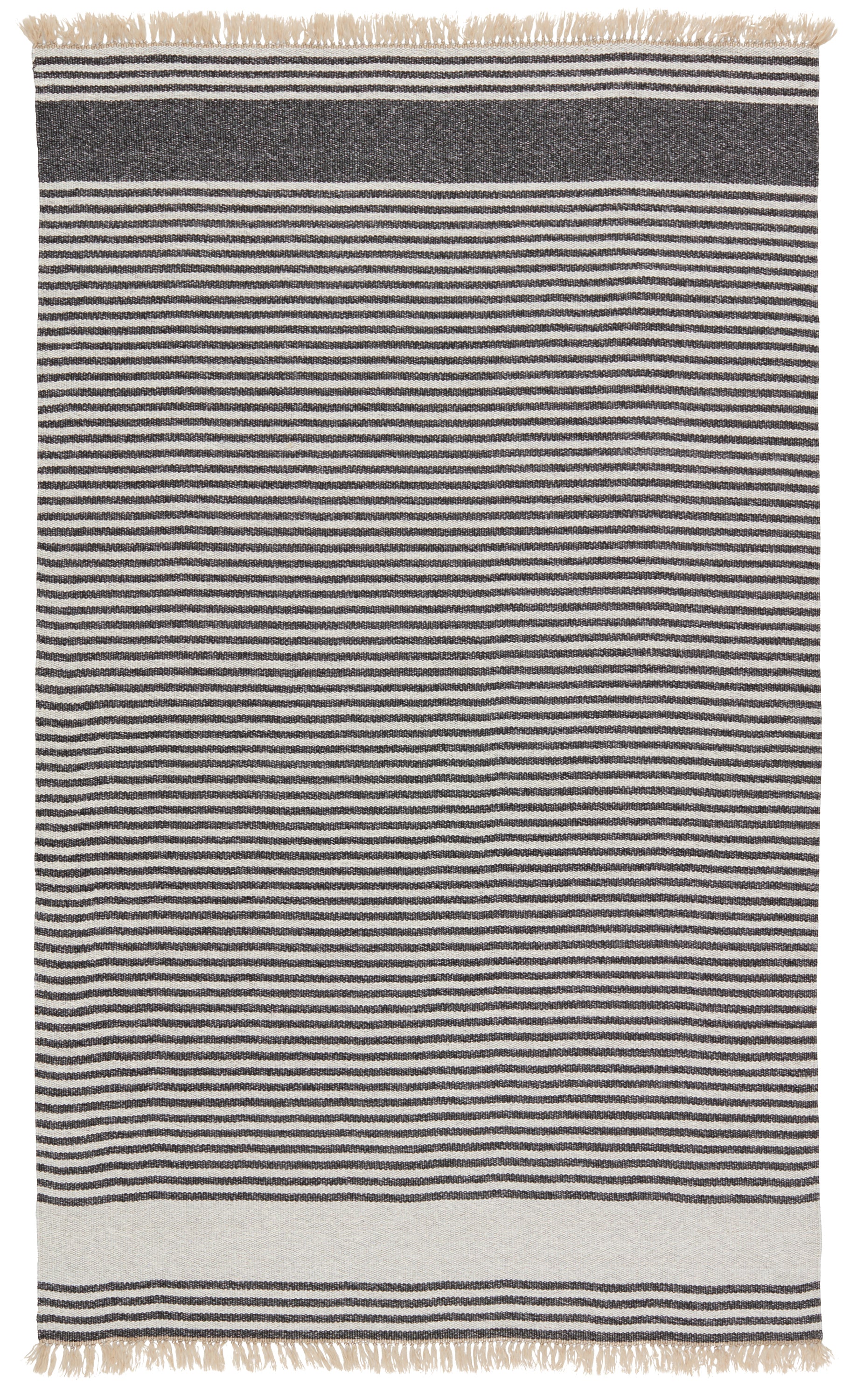 Relaxed and sophisticated in the same moment, the Morro Bay collection is a chic assortment of coastal-inspired dhurrie designs. The ticking stripe Strand rug complements both indoor and outdoor spaces with a versatile colorway of dark grey and beige. Handwoven of durable polypropylene, this low-profile rug is easy to clean and perfect for high-traffic areas.