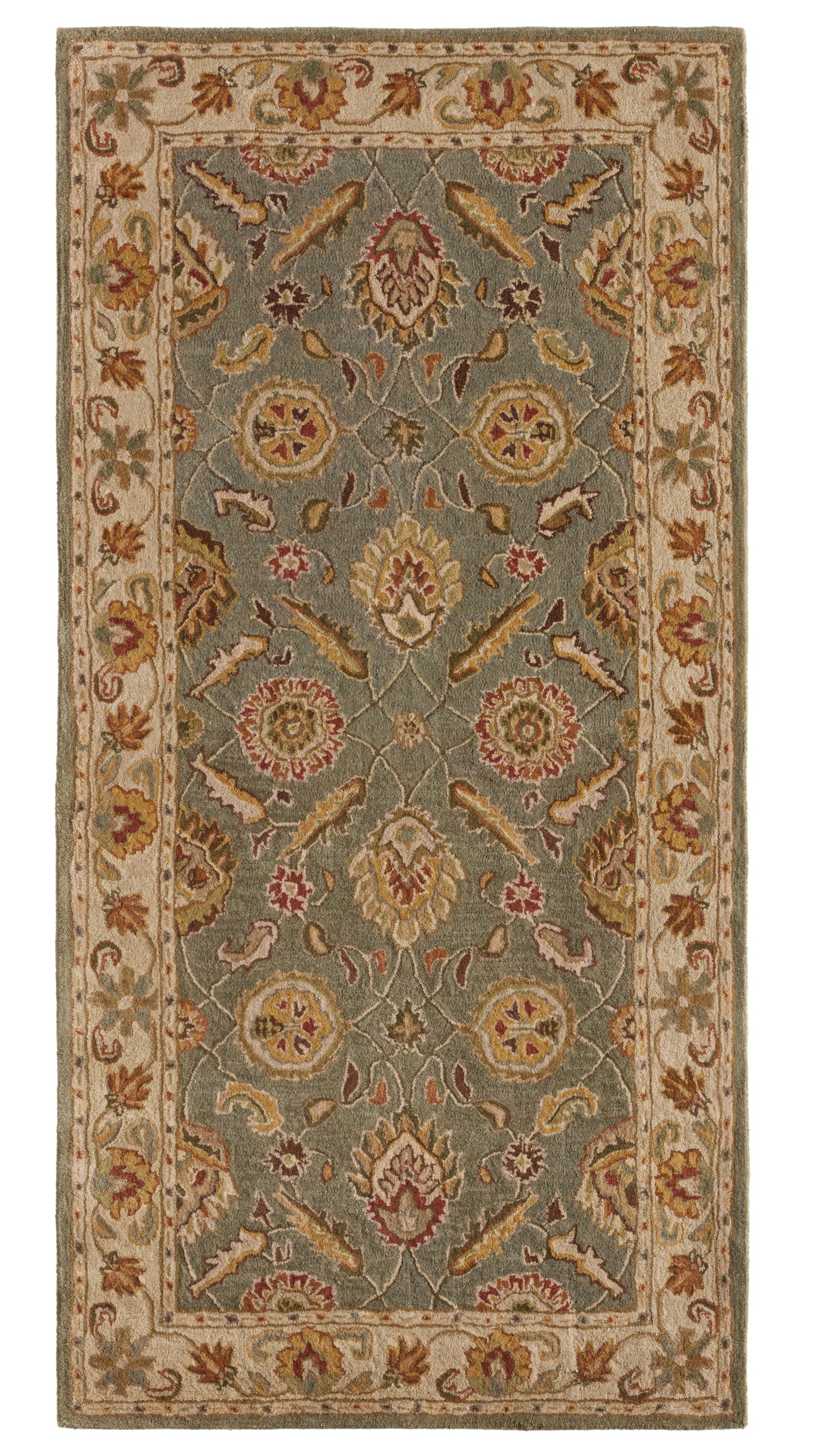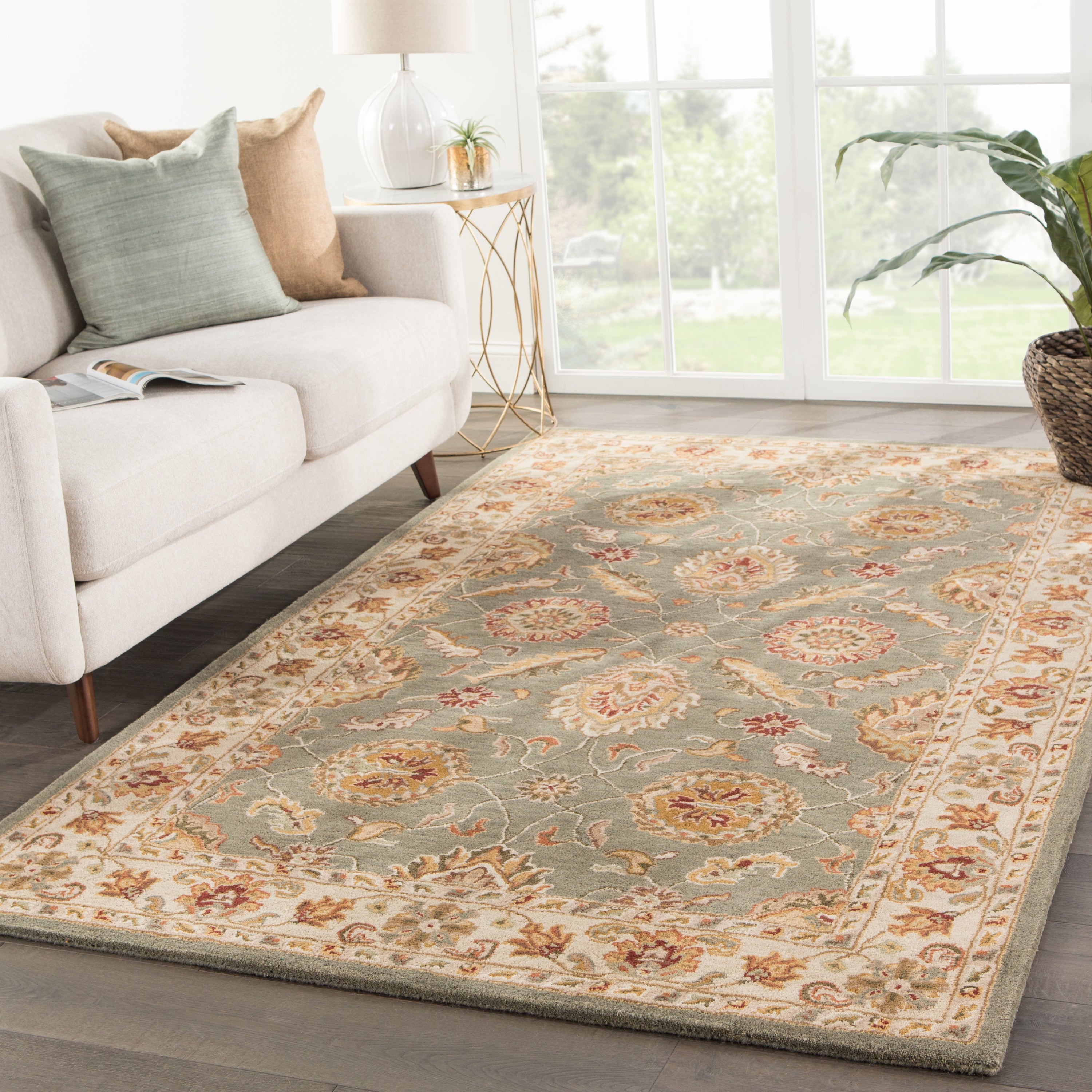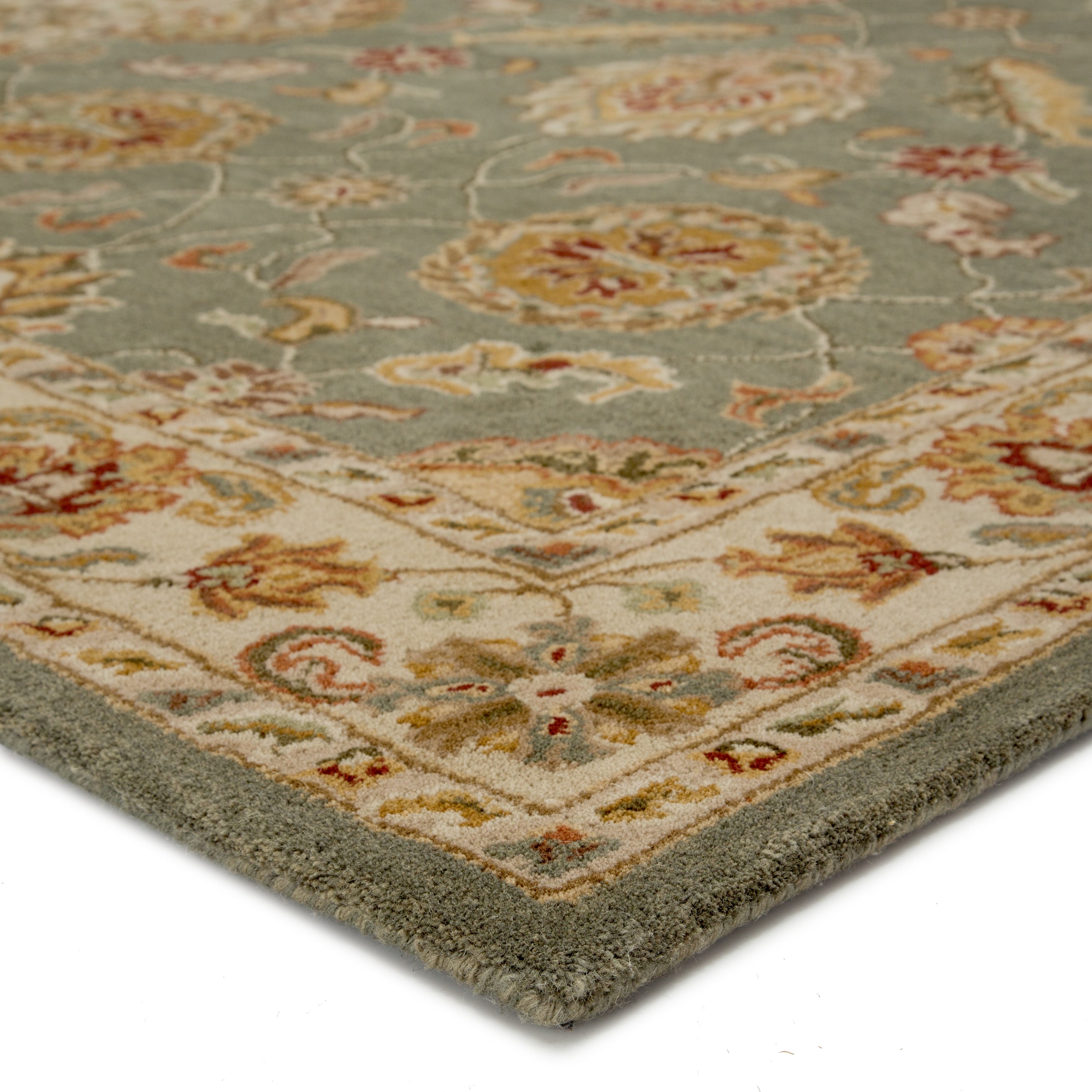 This hand-tufted area rug offers vintage elegance to traditional homes. Scrolling vines and floral medallions gracefully cover this classic wool layer in sage green, warm beige, and rusted red-brown.