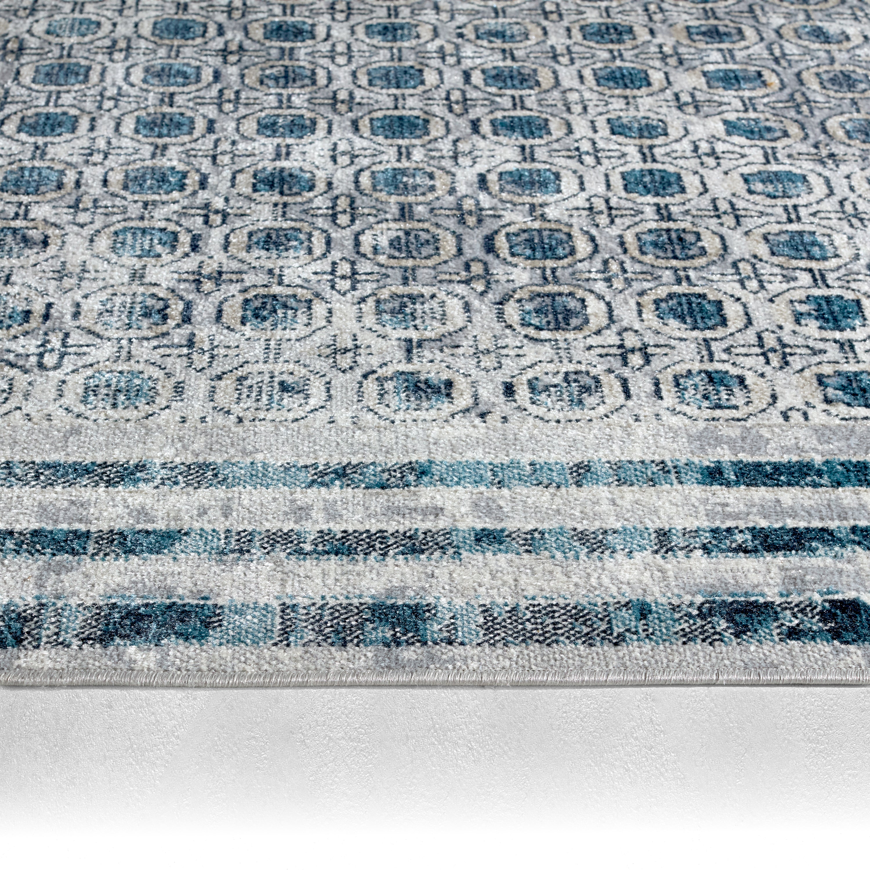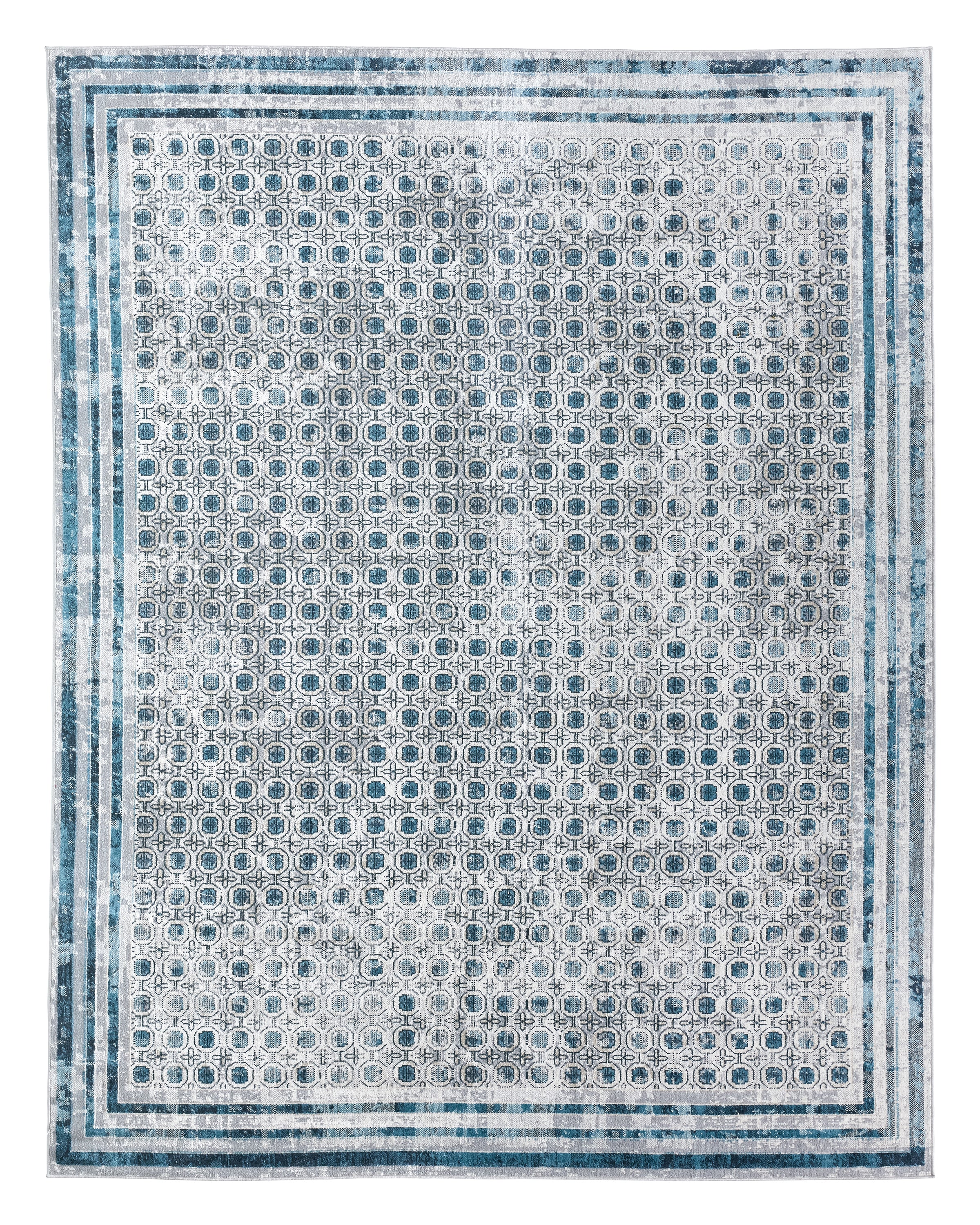 The incredibly chic Nadine collection offers durability and easy-care without compromising one bit on the style. This kid and pet-friendly assortment of rugs features a washable quality and a range of globally inspired designs that anchor rooms with eye-catching appeal. The Allora rug showcases a distressed trellis pattern in blue on a light grey background with hints of gold and cream. The 100% polyester fibers provide a slight sheen and lasting quality that thrives in high traffic areas of the home such as kitchens, bathrooms, living rooms, bedrooms, and halls.
