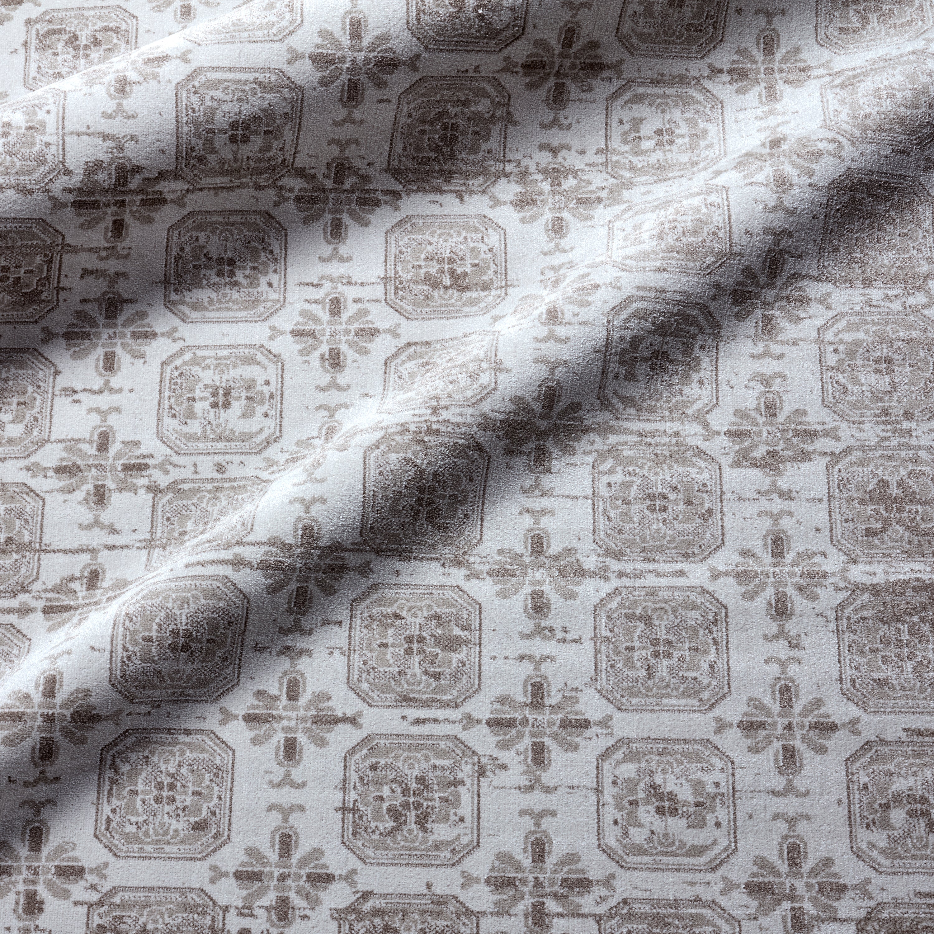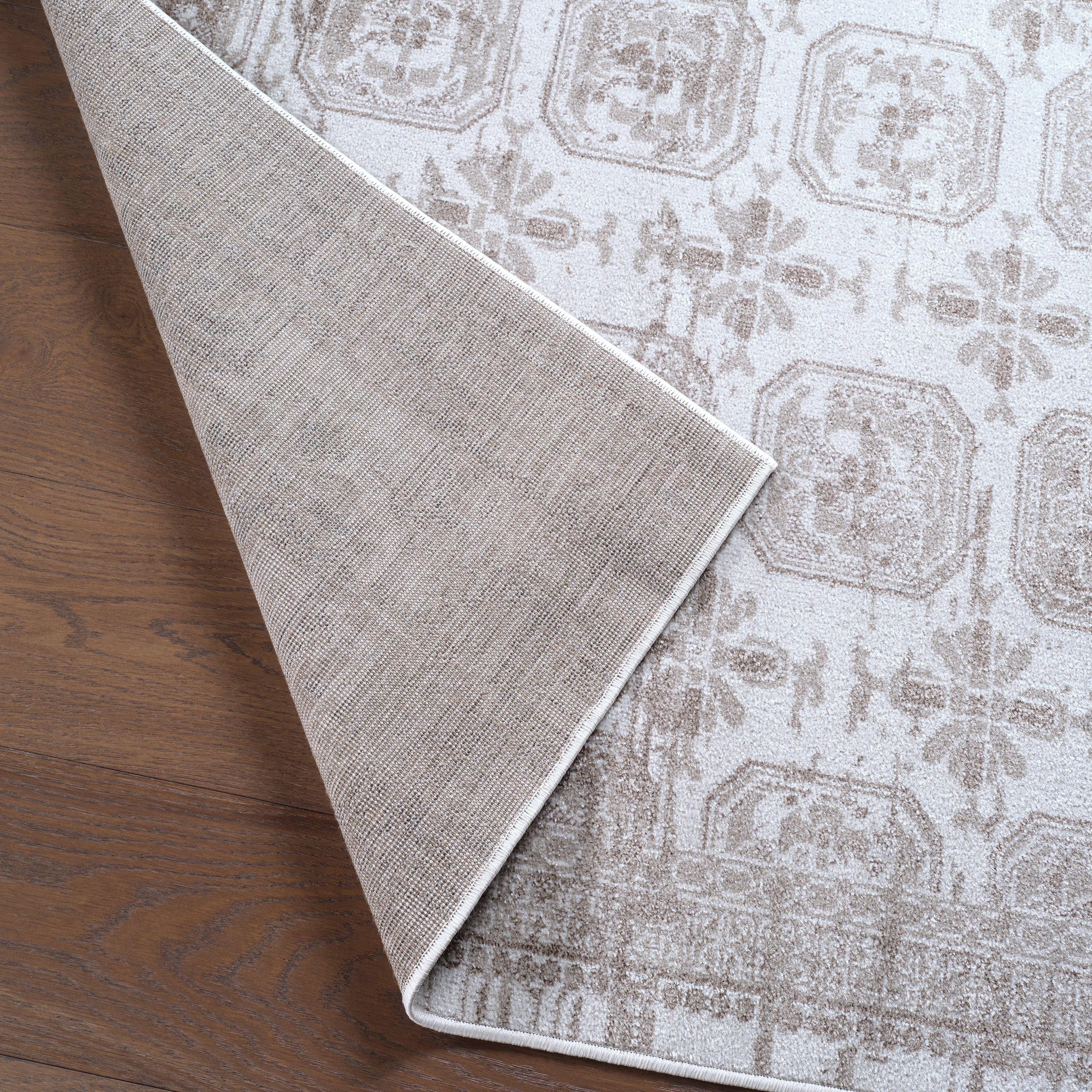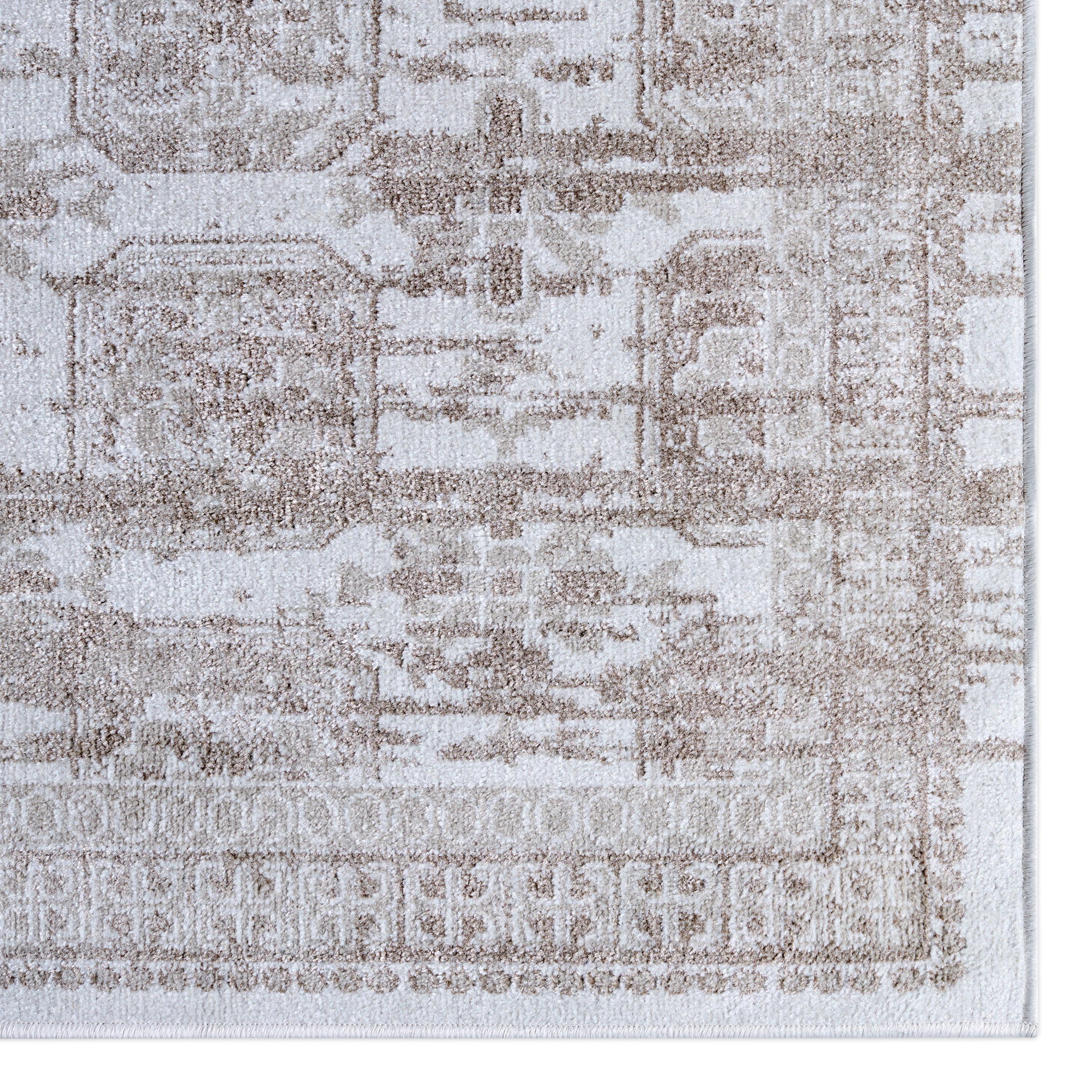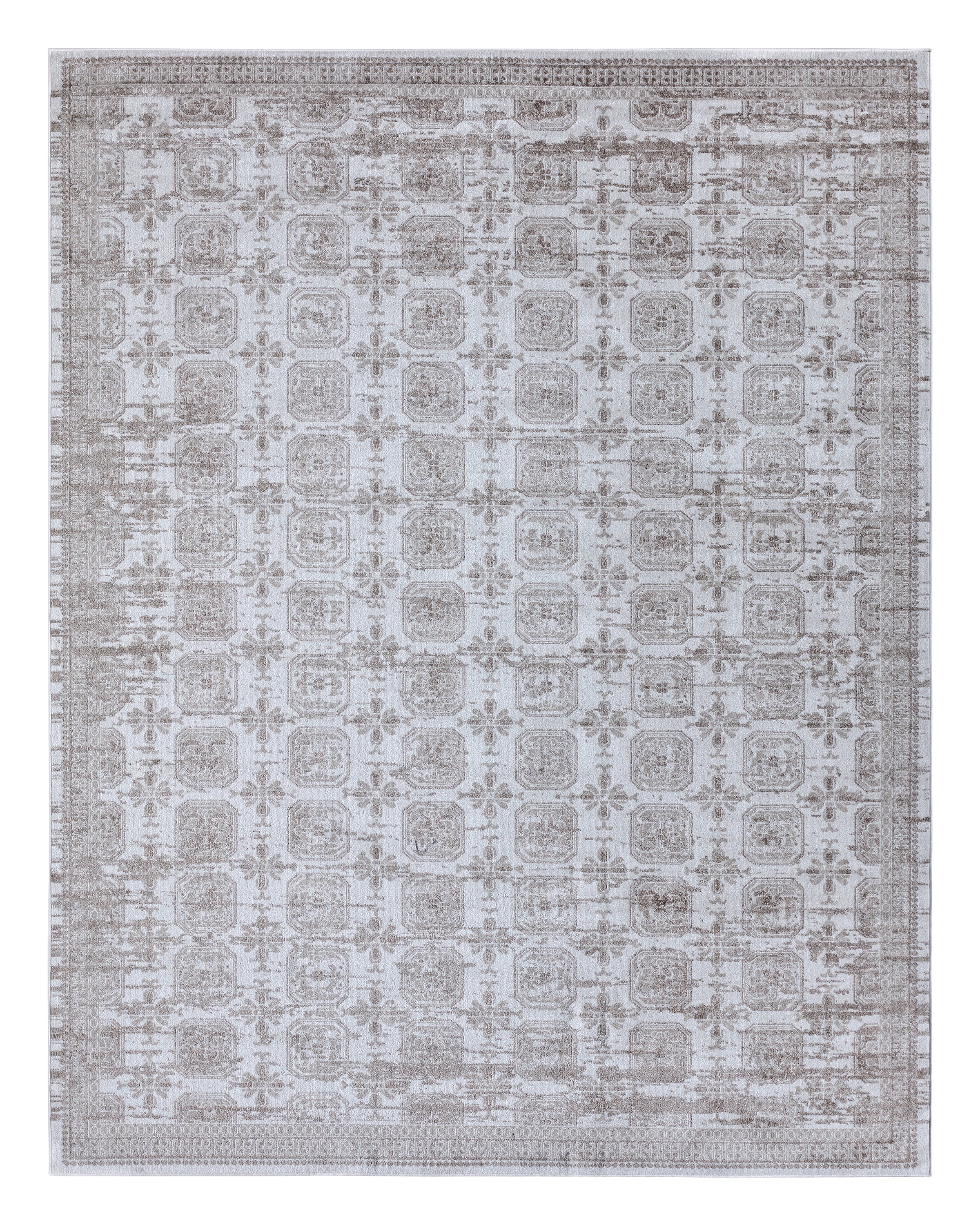 The incredibly chic Nadine collection offers durability and easy-care without compromising one bit on the style. This kid and pet-friendly assortment of rugs features a washable quality and a range of globally inspired designs that anchor rooms with eye-catching appeal. The Milea rug showcases a slightly distressed trellis pattern in tan on a cream and beige striated background. The 100% polyester fibers provide a slight sheen and lasting quality that thrives in high traffic areas of the home such as kitchens, bathrooms, living rooms, bedrooms, and halls.