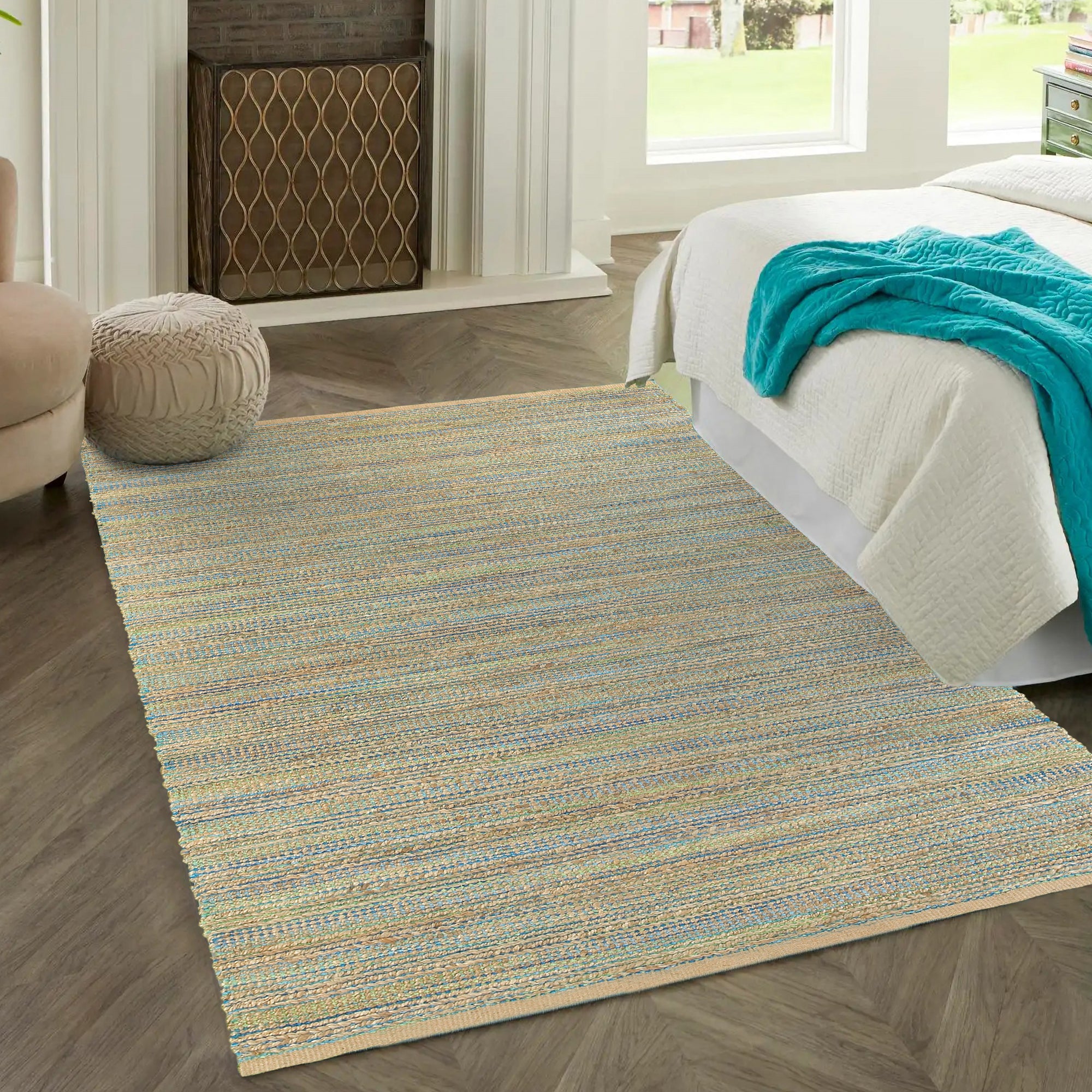 Bring natural texture and color into your home with this beautiful handmade jute area rug. This piece features intricately woven stripes of jute and soft chenille in shades of blue and green creating an eye-catching foundation for entryways, hallways, bedrooms, and kitchens. Available in multiple color and size options to accomodate any space in your home, apartment, or dorm. Each rug is hand-woven using traditional techniques out of chenille and natural jute fibers with a cotton backing, which allow you to enjoy high-end design without sacrificing comfort or durability. The resilient materials and tightly woven construction ensure that this rug will maintain its shape and appearance for years to come.