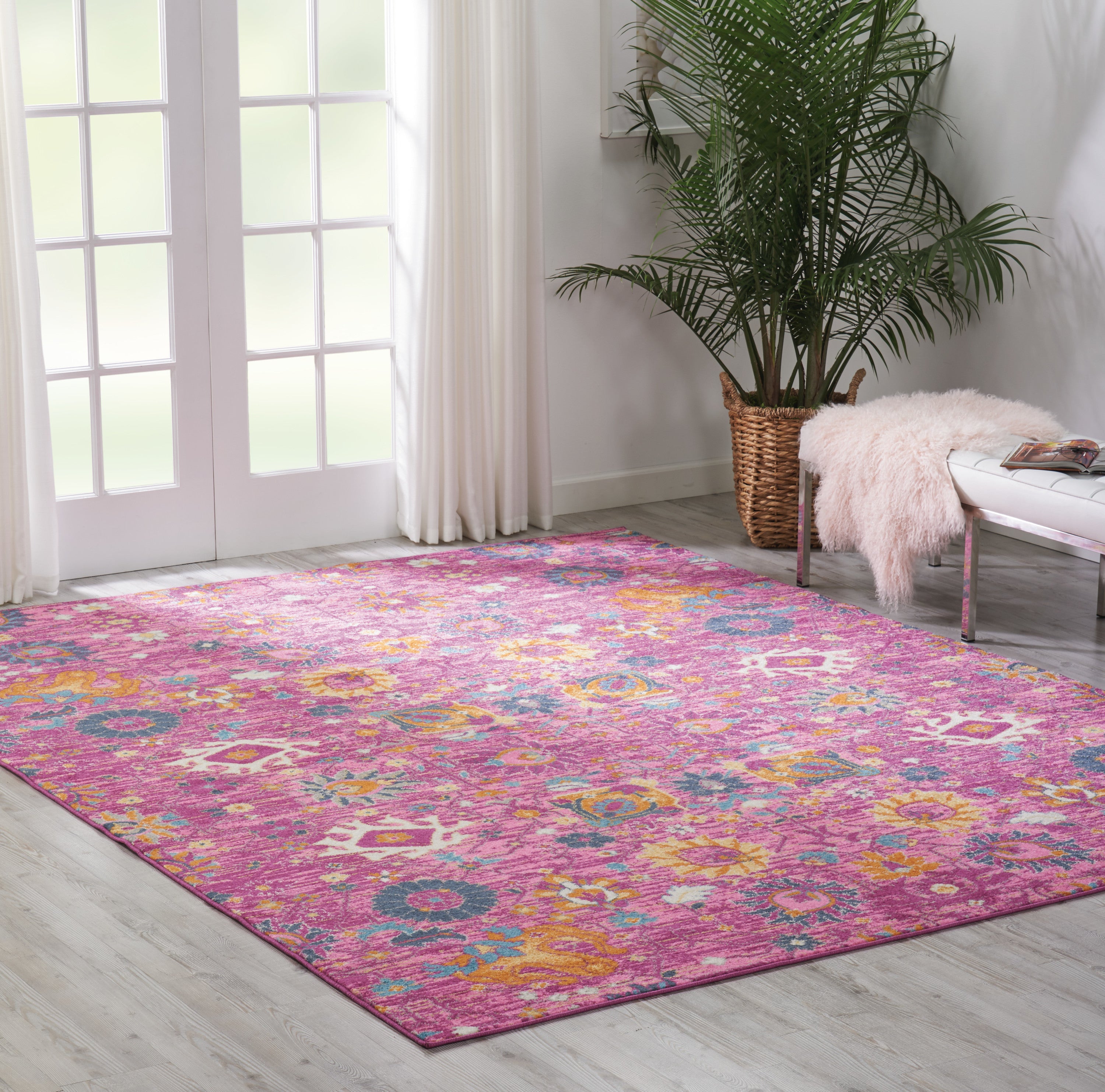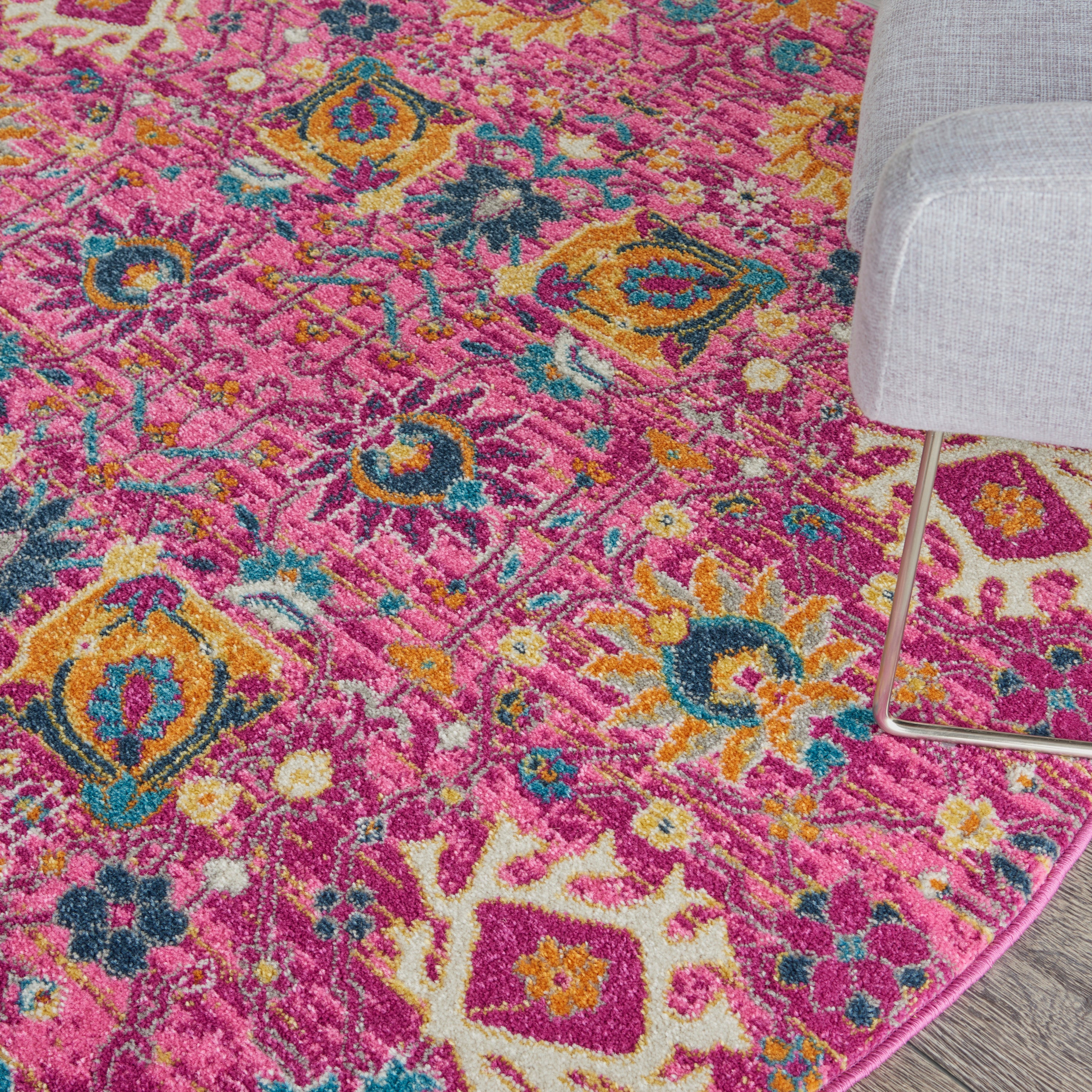 Imaginative flowers in lush, saturated pigments grace this Passion Collection runner rug with a beautifully colorful presence. The artful palette mixes pink, apricot, lemon and denim blues on a patinated background of brilliant fuchsia. Hints of Persian antiquity in a modern interpretation makes this stunner a versatile statement piece that brings Passion to your lifestyle.