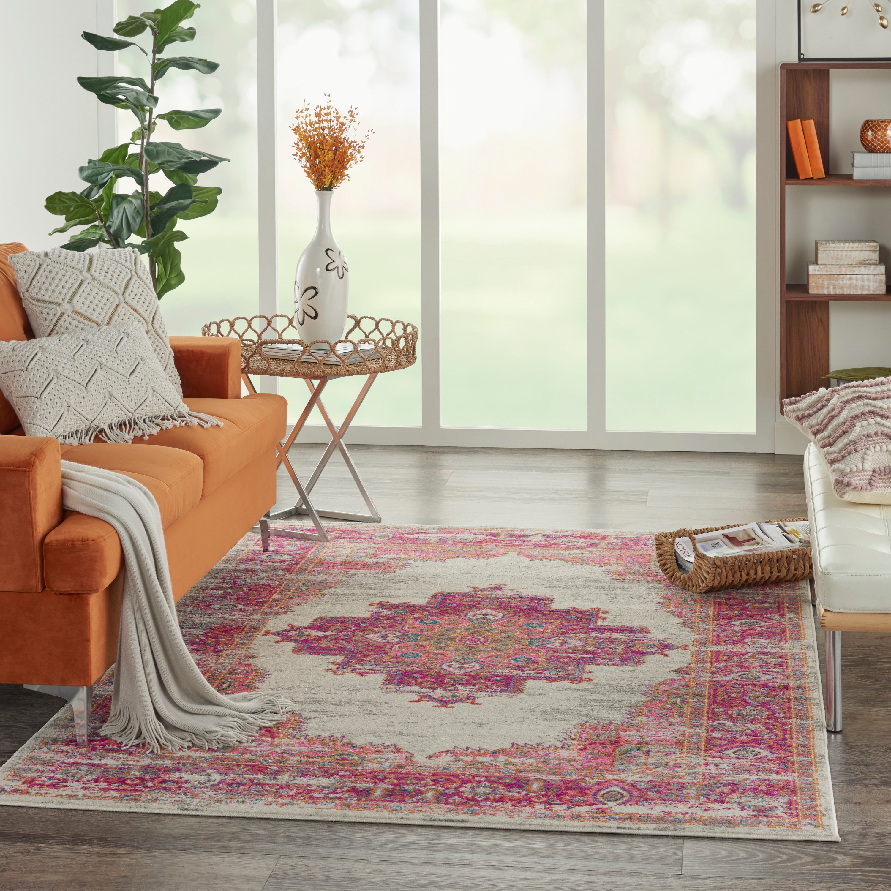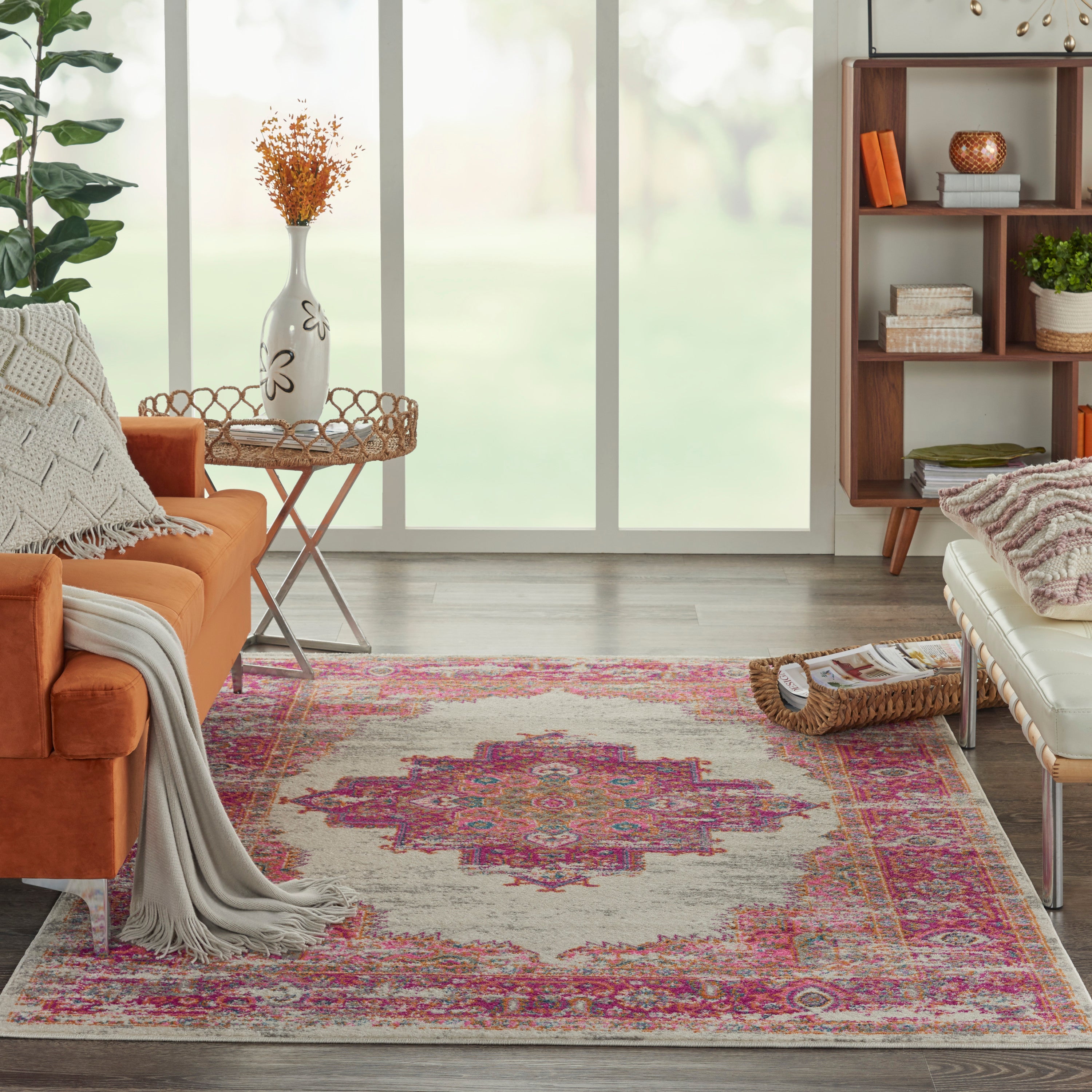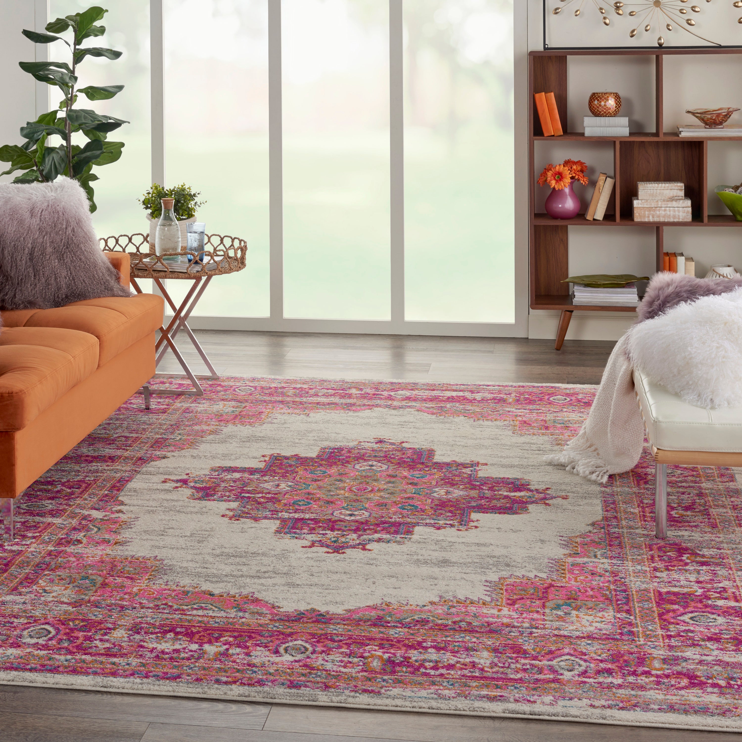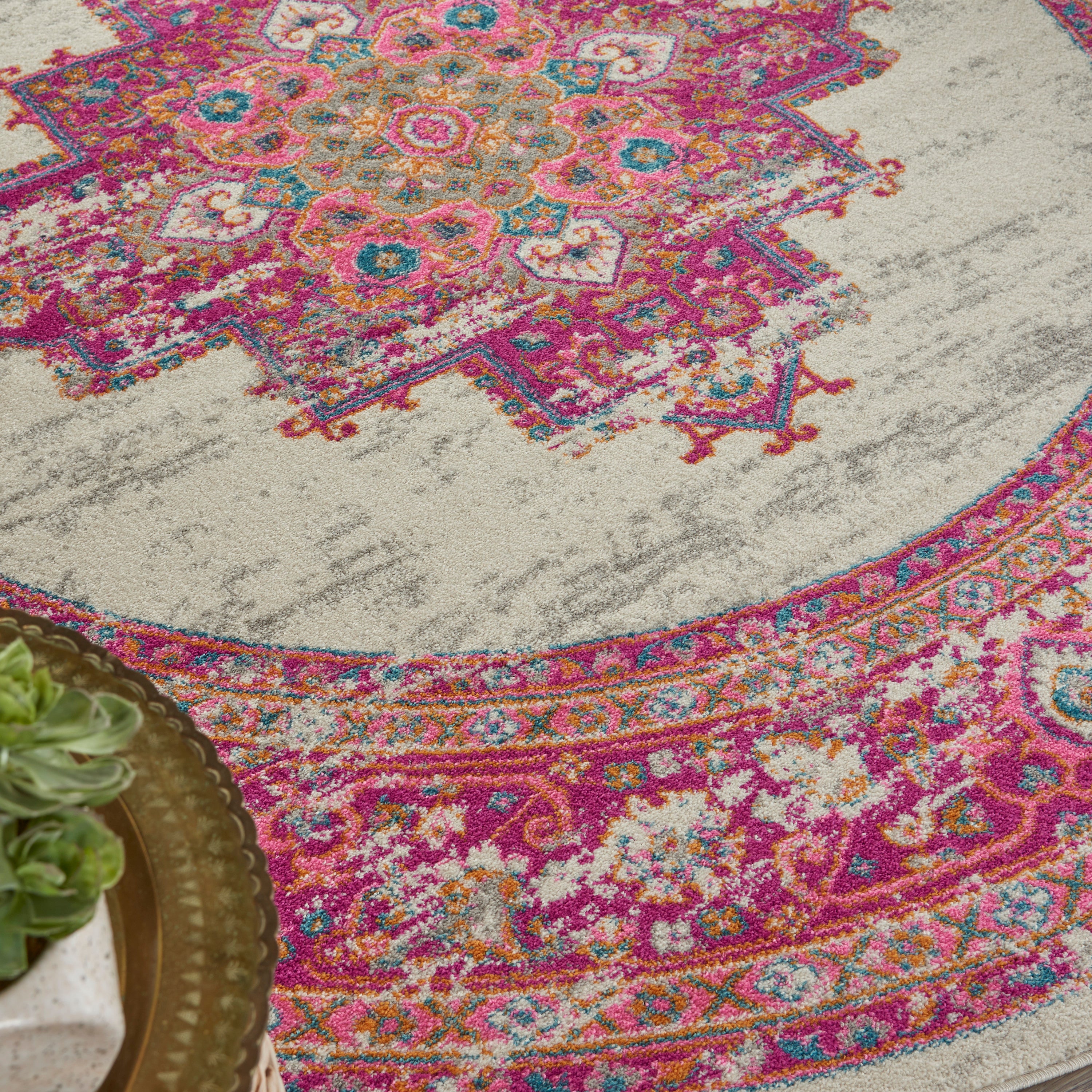 This beautifully distressed Persian medallion rug merges traditional bordered rug style with a contemporary vibrance. Multiple pink hues are accented with traditional Persian designs in blue, orange, and green, while the brilliant tones are balanced by a distressed effect for a vintage vibe that's perfectly at home in relaxed, Bohemian room decor. The soft, cut pile shimmers with a beautiful glossy sheen, and combines comfort with modern easy cleaning.