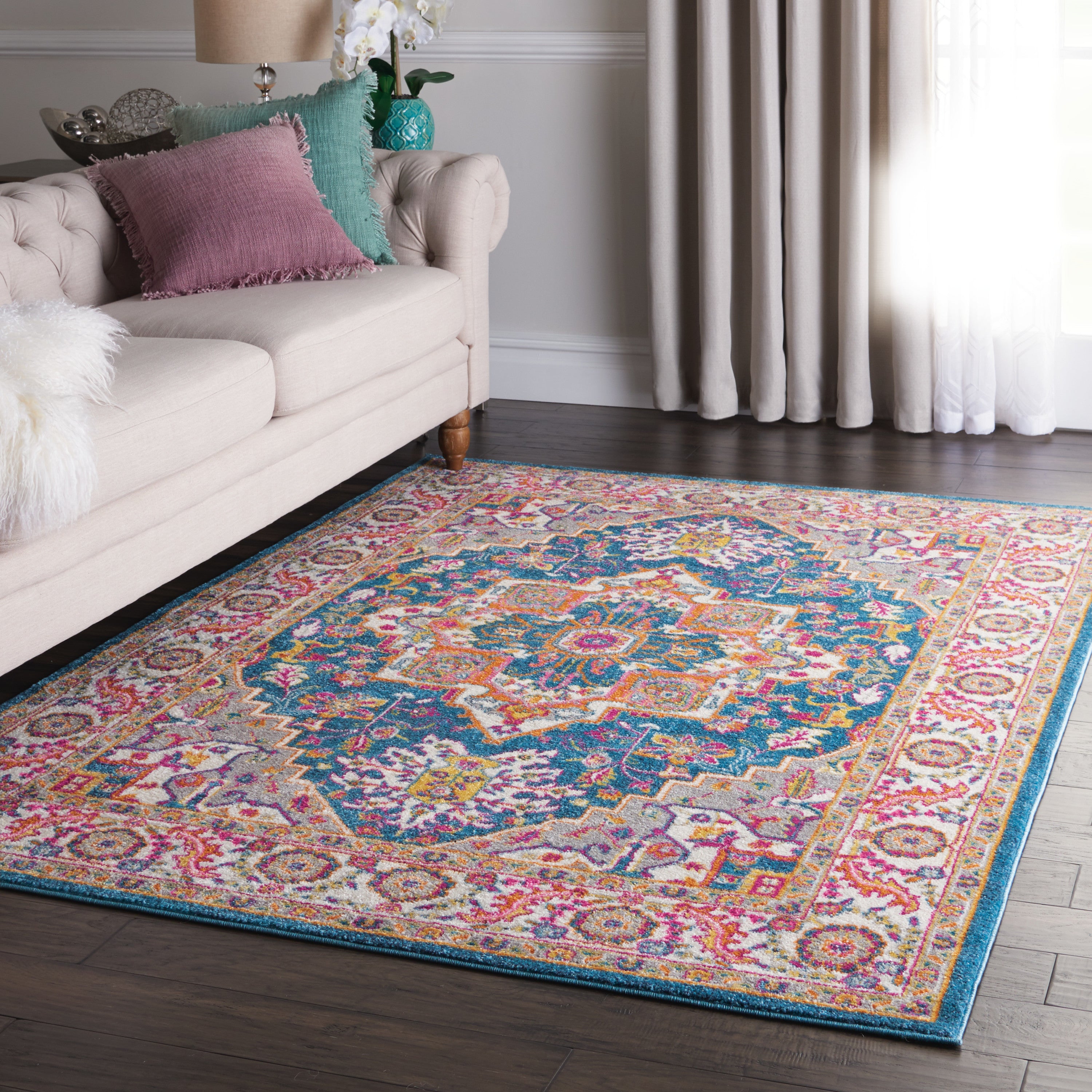 This timeless Oushak star medallion rug design takes on a contemporary tone with brilliant shades of teal on a grey multicolor field. With easy-care fibers, it's the perfect infusion of Boho charm for any space in your home or dorm room.