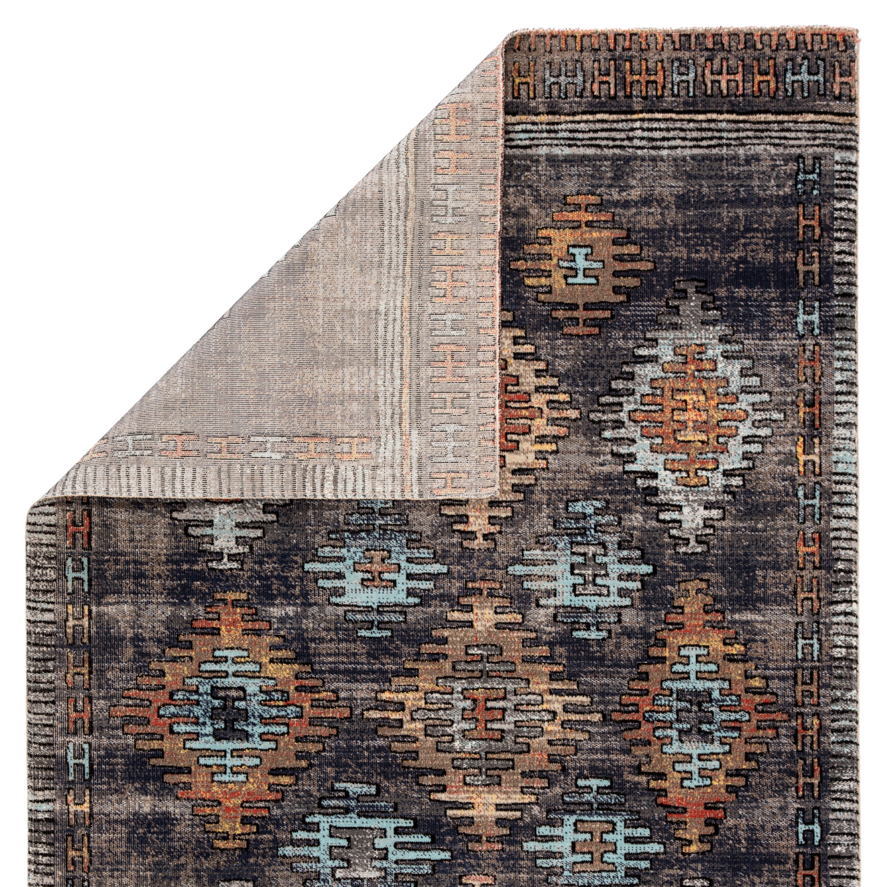 The indoor-outdoor Polaris collection combines admired traditional designs with a durable, light-weight polypropylene construction. The Dez area rug boasts whimsical diamond tribal design, bringing a Southwest vibe to contemporary spaces. Accents of blue, orange, and yellow pop on the dark ground color for a fun, updated look in kitchens, living rooms, or on patios.