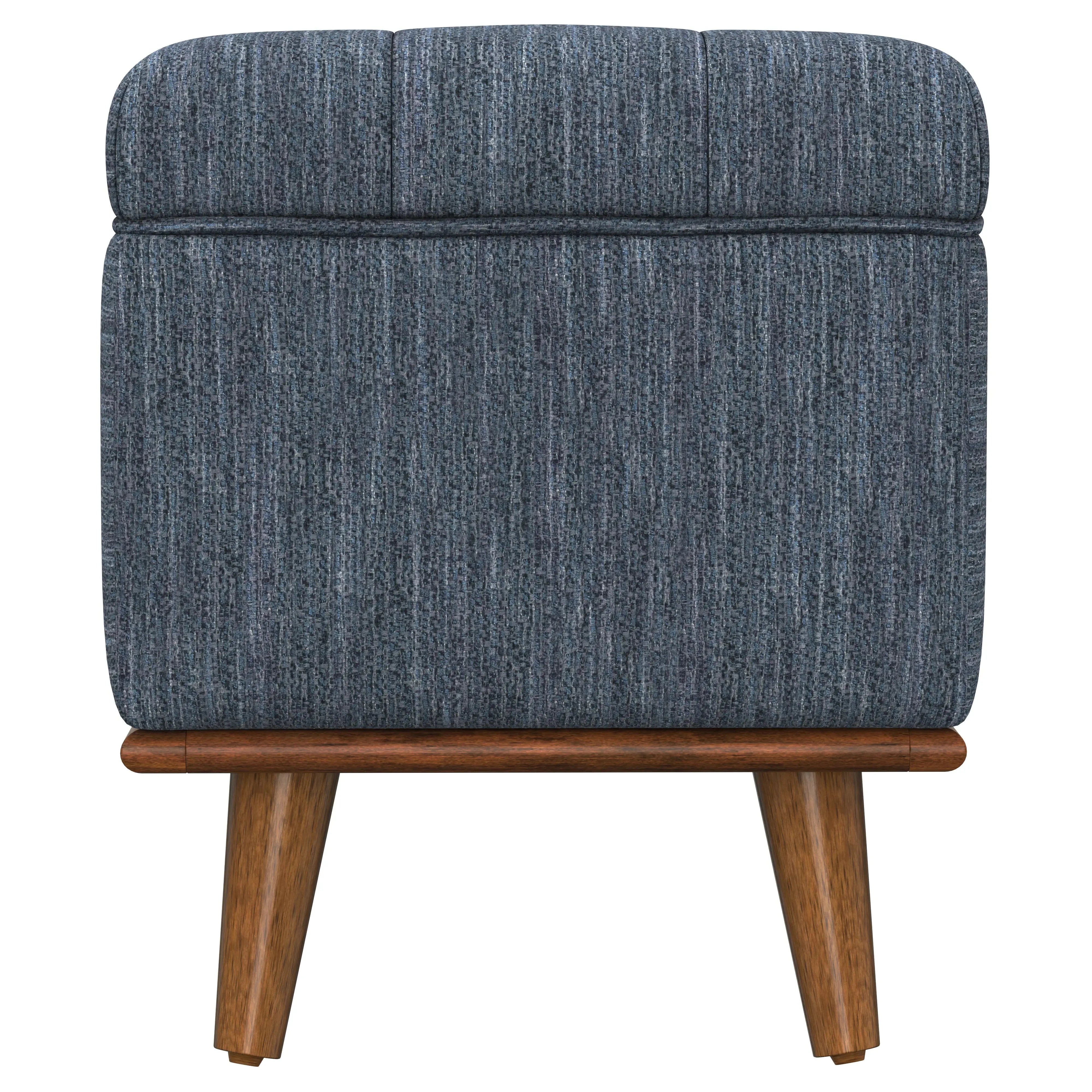 For a cool blend of modern style and practical function, look to the Rory storage ottoman. With its dark walnut-toned solid wood exposed frame and tapered legs, this piece brings a solid beat to any room. The tufted top, upholstered in dark blue fabric with flecks of gray, adds just the right touch of sophistication. Hidden storage keeps your essentials under wraps, while its classic nod to midcentury designs add just the right tune to your living room, entryway, or bedroom.