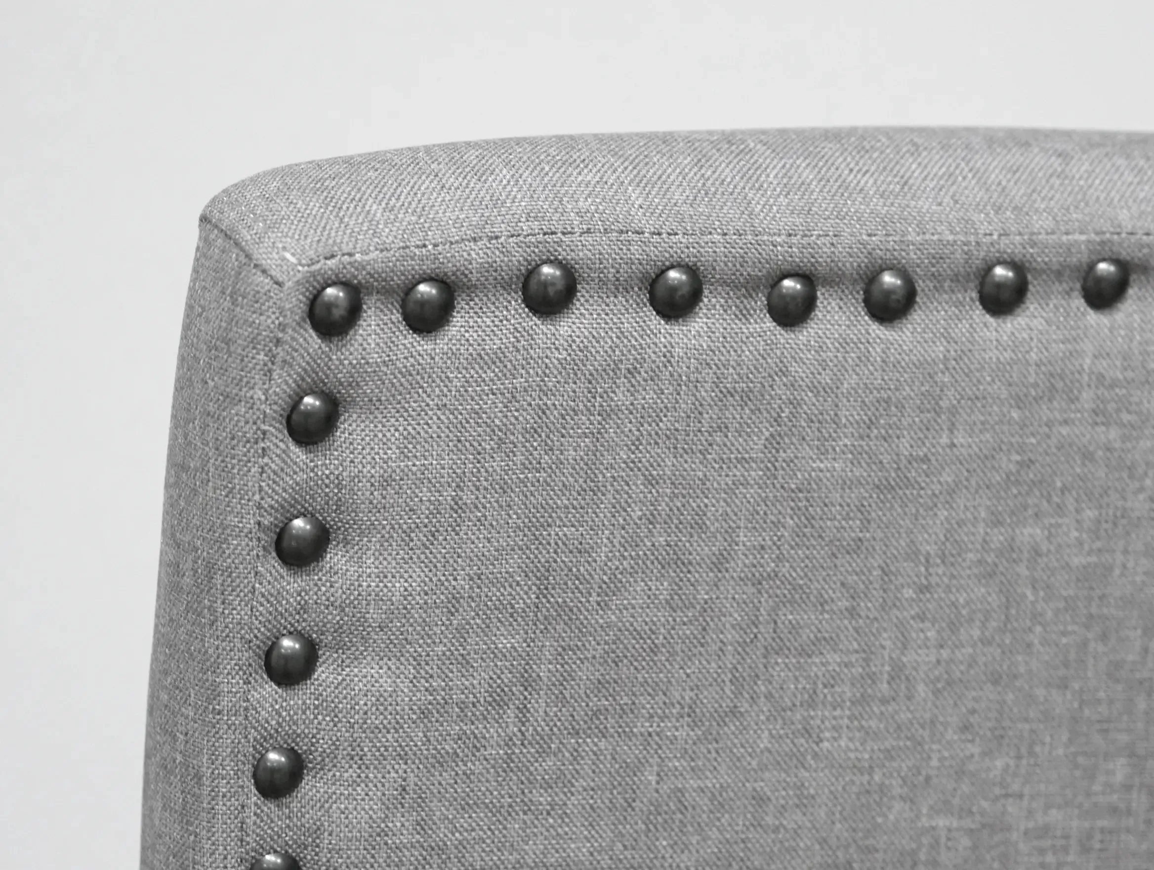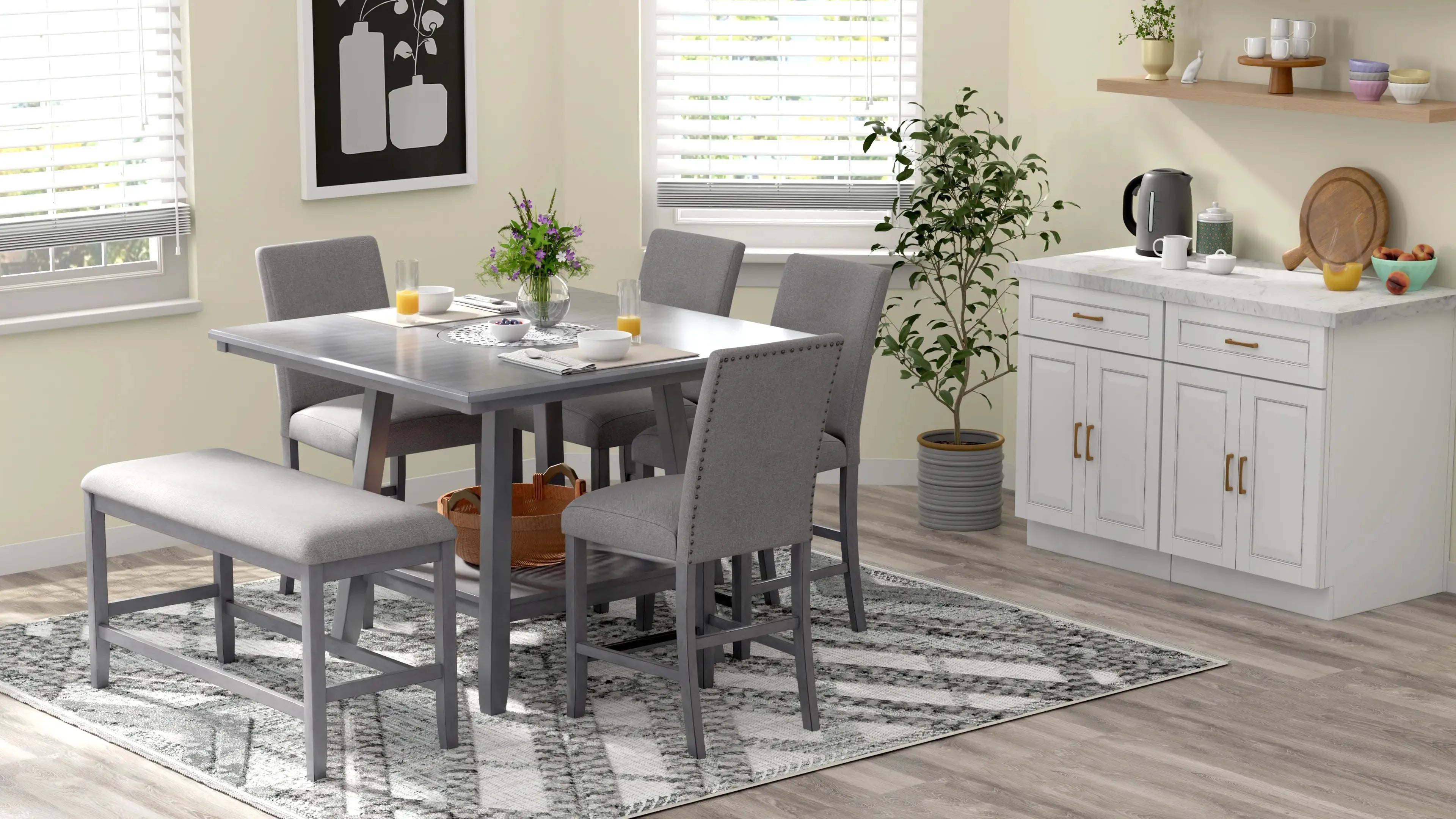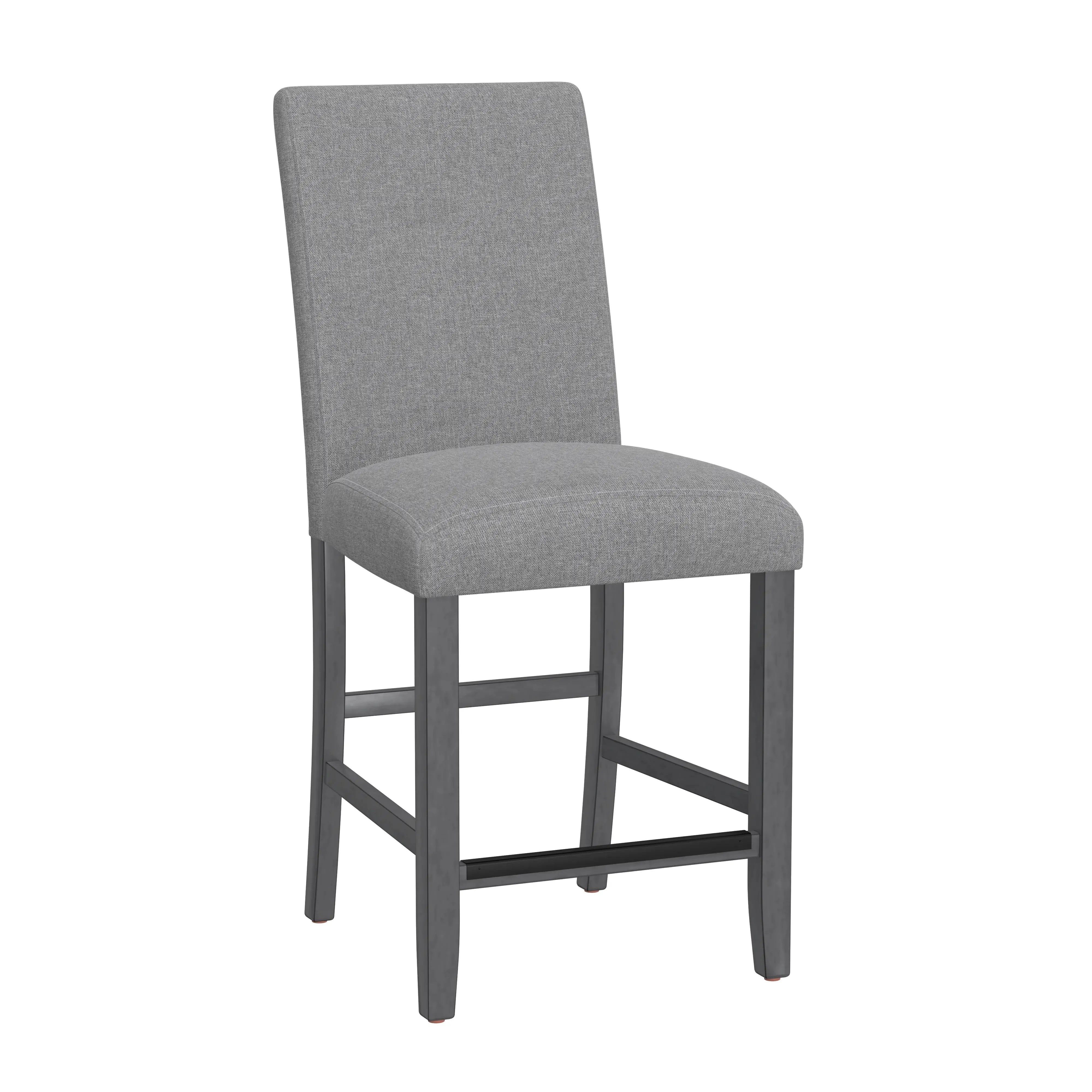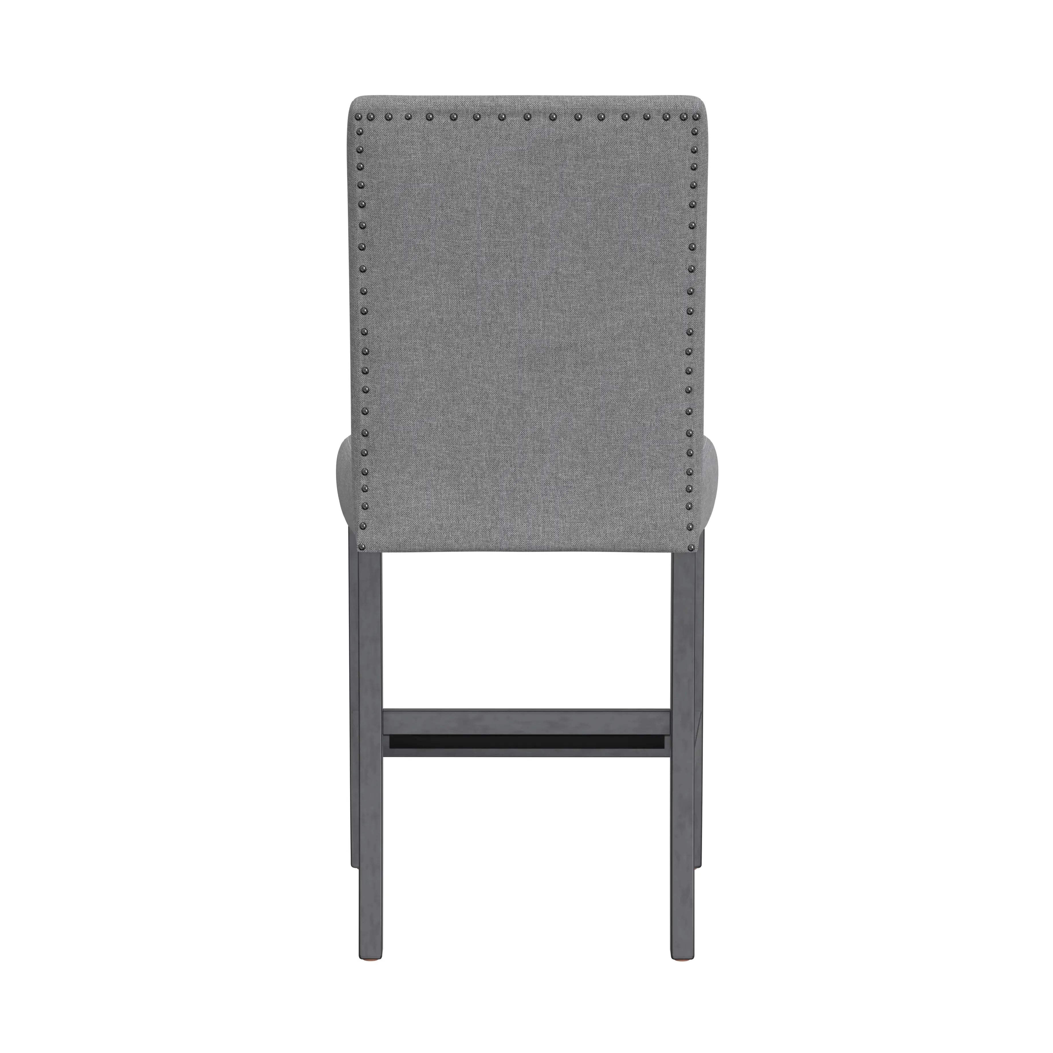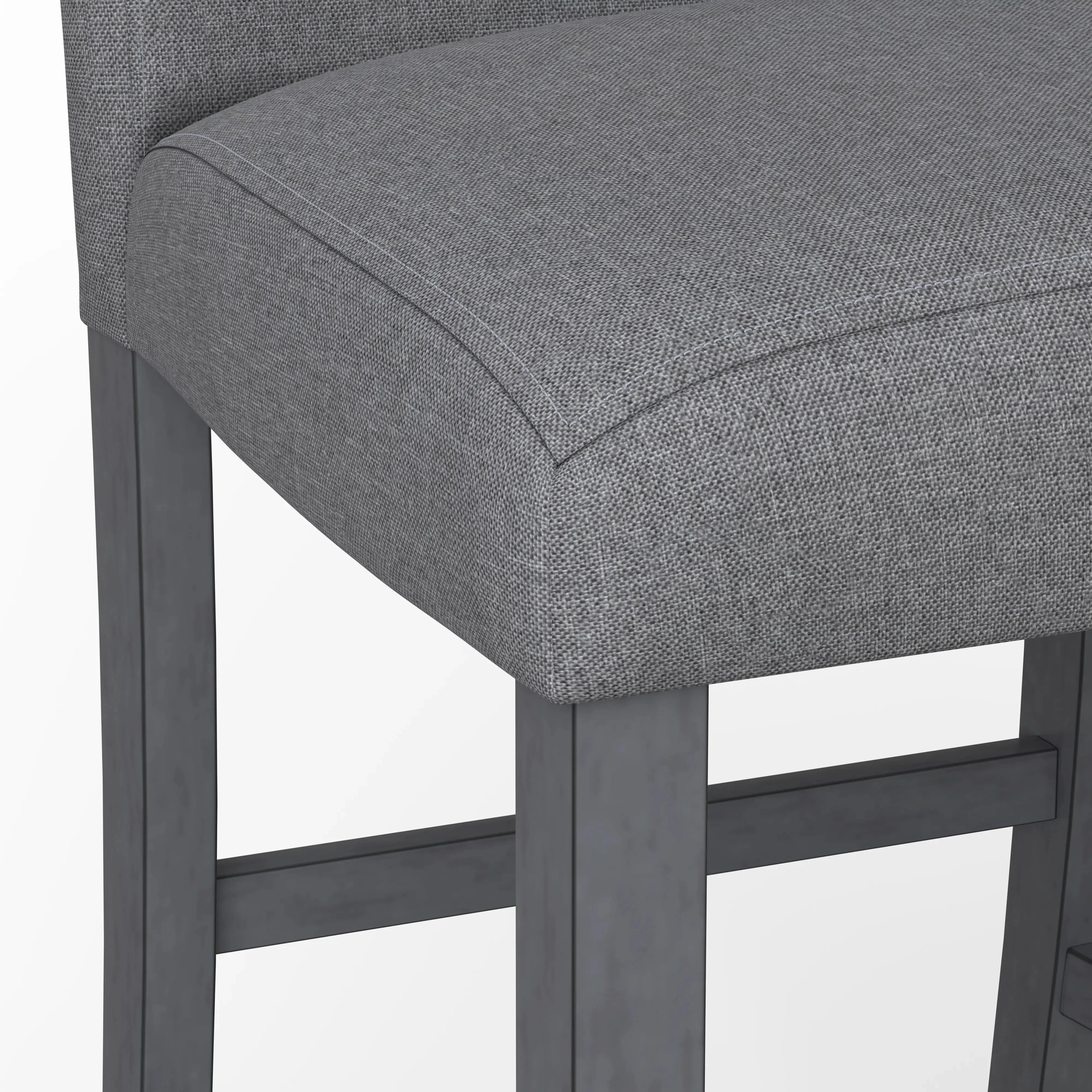 The transitional Seneca collection hosts a unique blend of features and seating options. A delightful medium gray finish on walnut veneers forms a quarter-turned pattern on the tabletop, culminating in the built-in 18” lazy Susan. The tapered frame spreads out to encompass a lower shelf for extra storage. Seating with light gray upholstery and gently curved backs decorated with dark pewter nailhead trim, you can stay more traditional with just stools or more casual by mixing in a bench or two. A special corner bench converts the look into a banquette perfect for nestling in corners. Accentuate your personal style and give the Seneca a whirl.