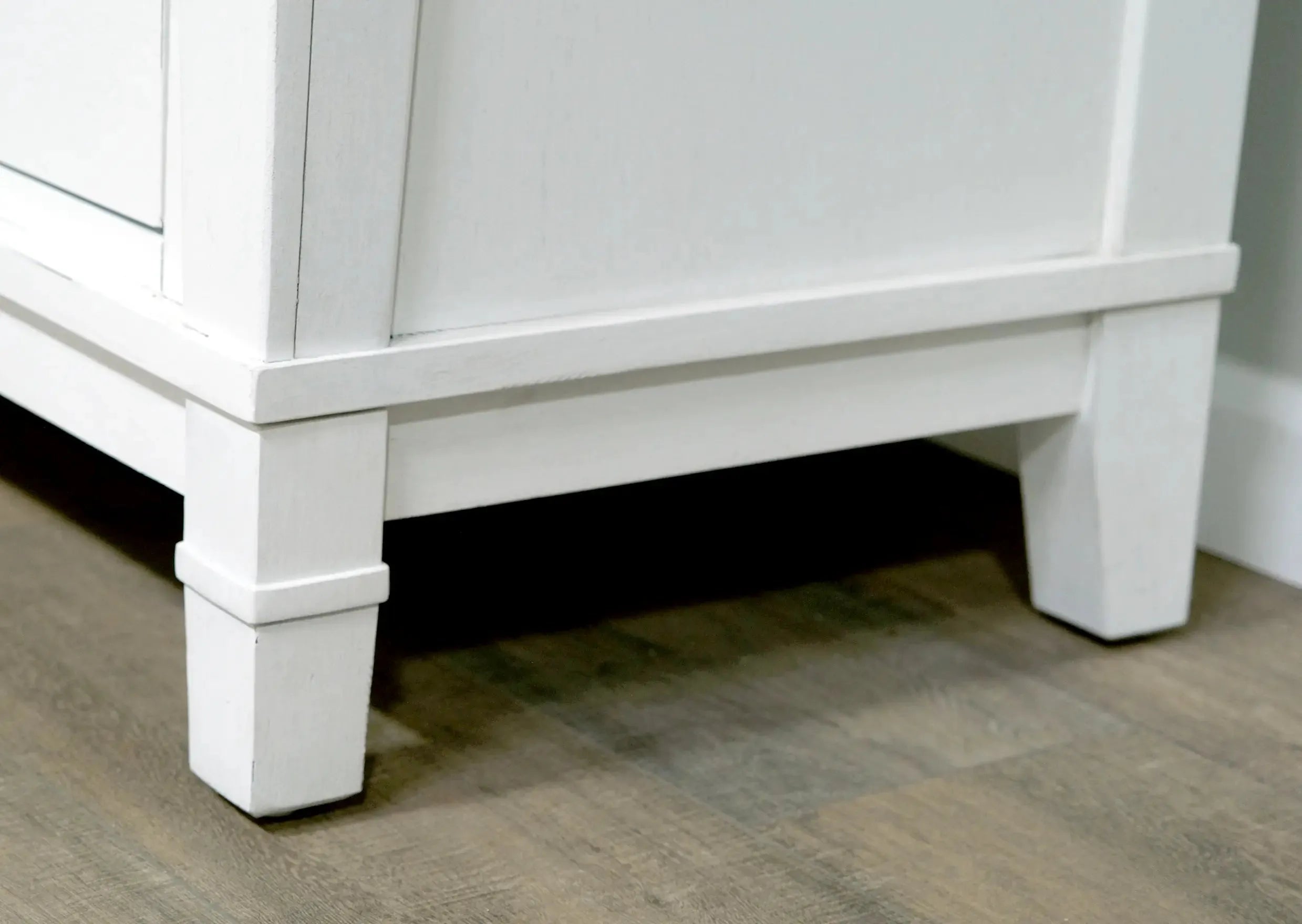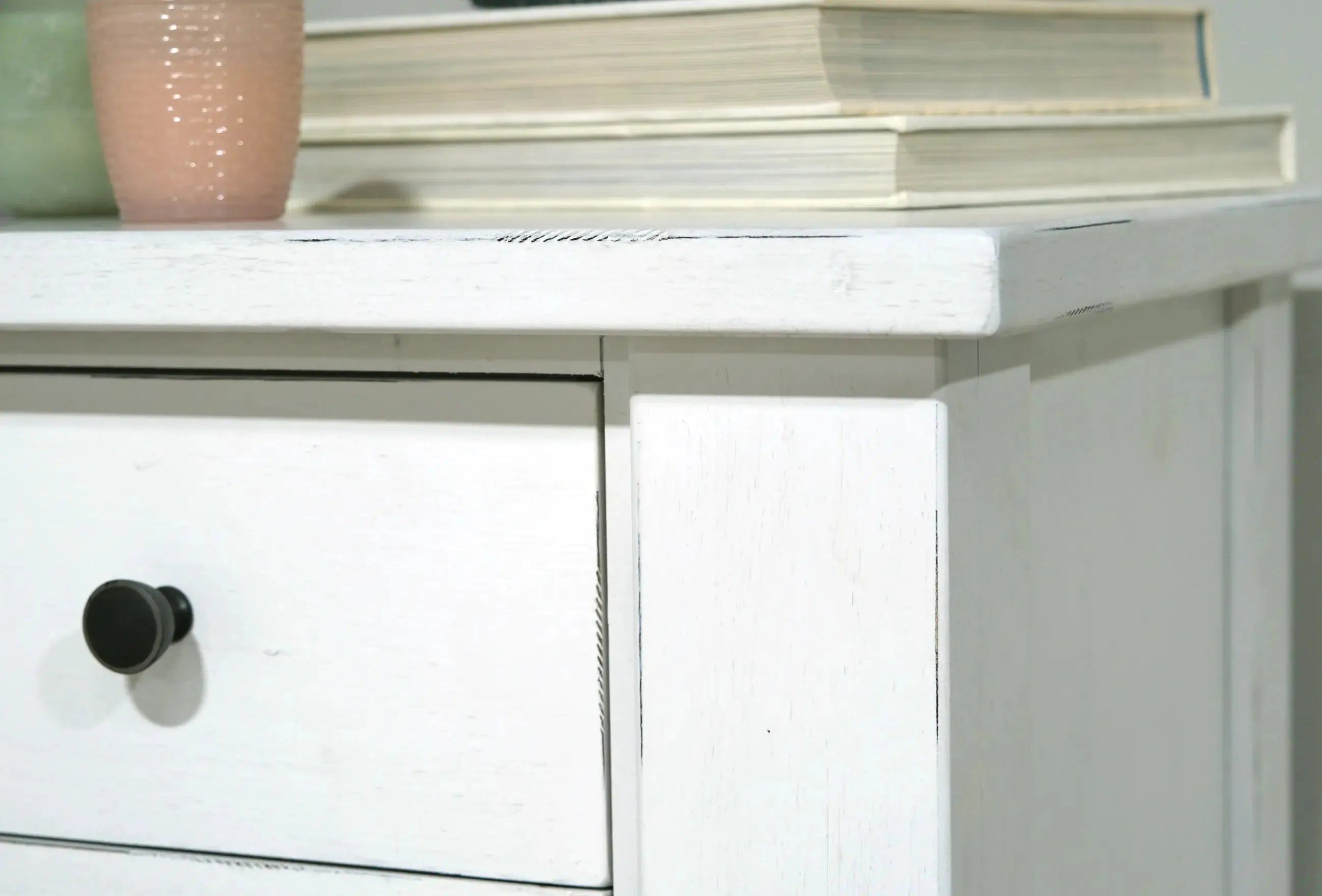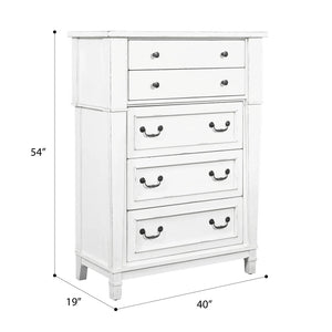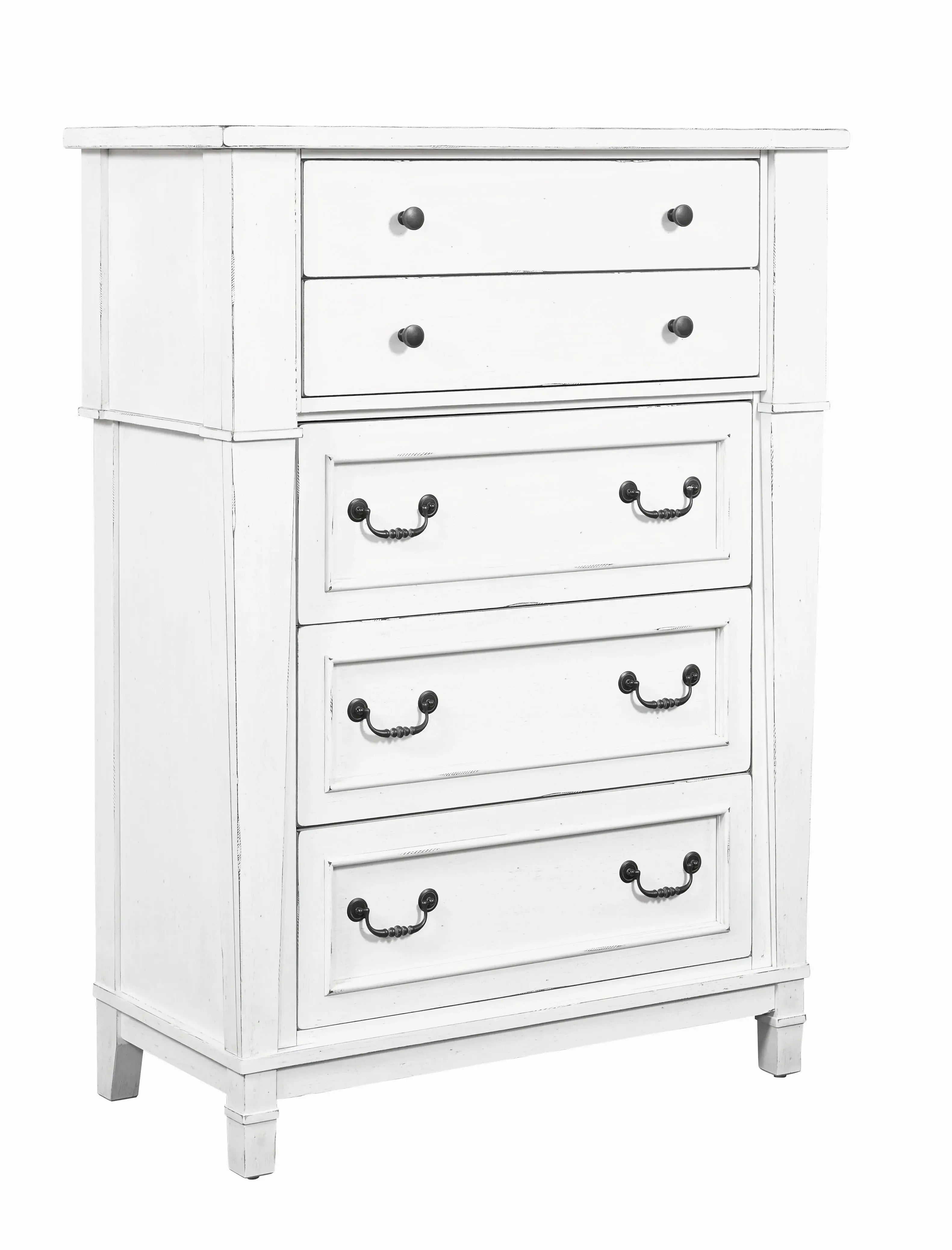 Complete your relaxing retreat with the Stoney Creek bedroom collection. This traditional bedroom set offers large-scale designs with a textured, antique white finish. Antiqued, blackened metal hardware and tapered leg detailing adds a little modern farmhouse charm to your home.