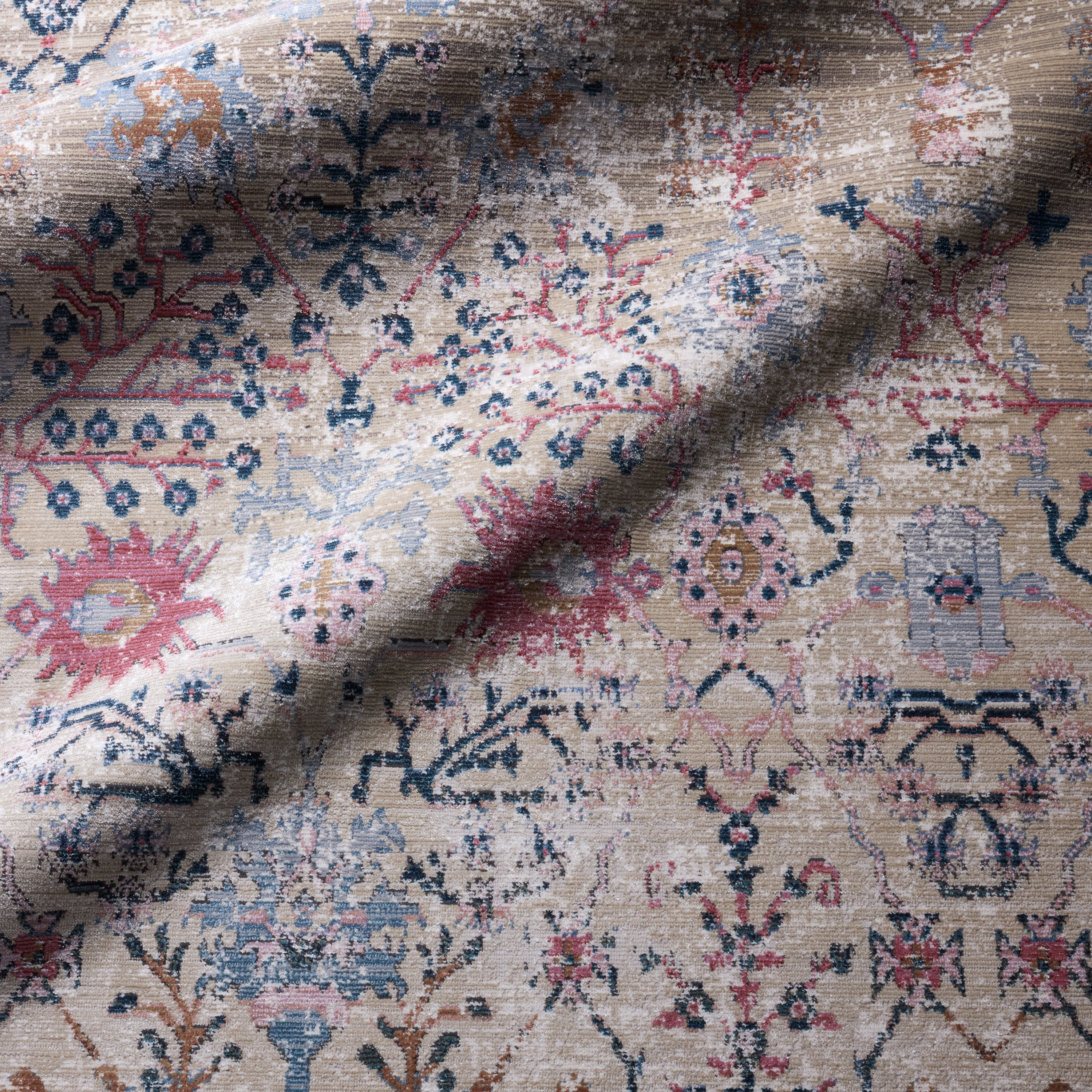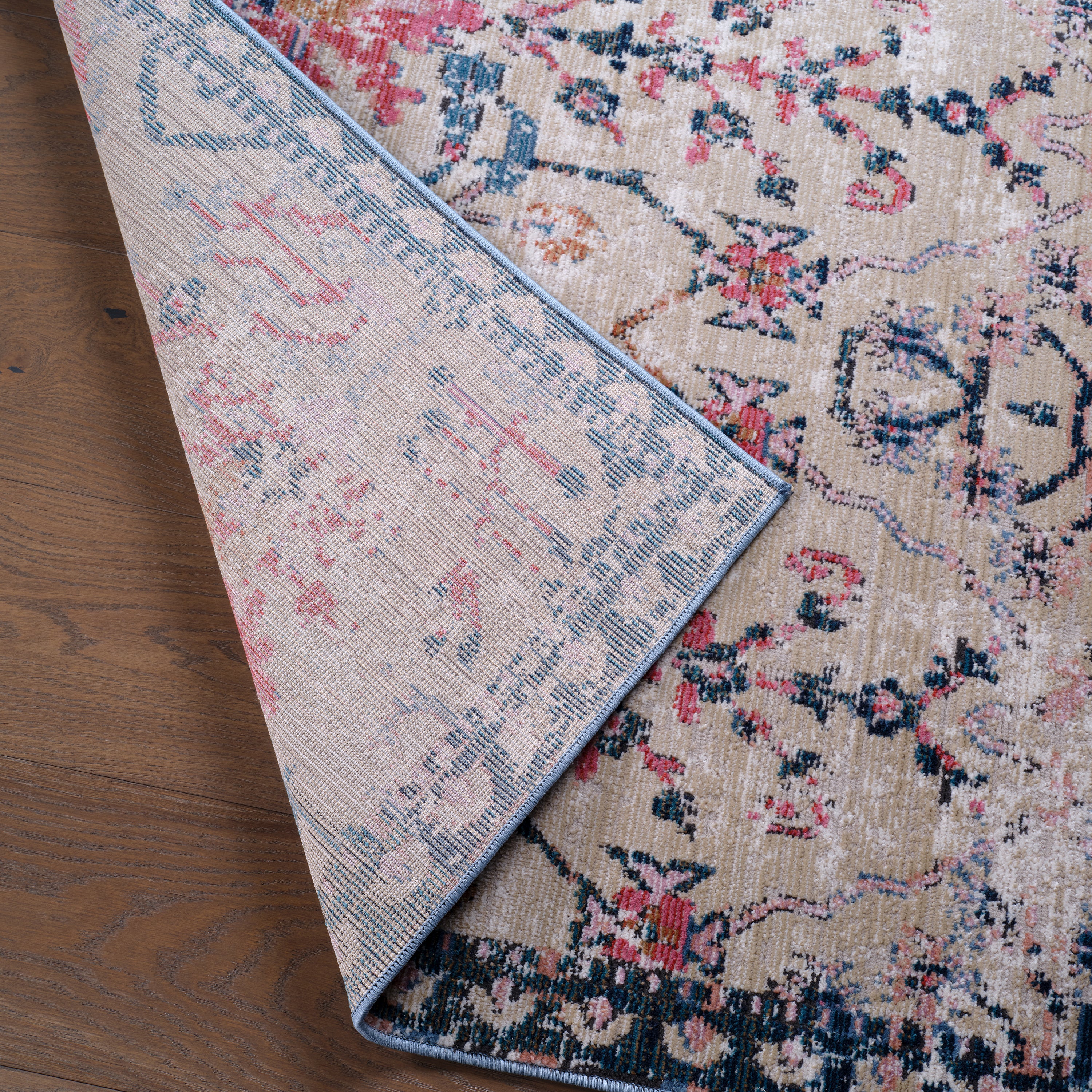 Bringing to life an enchanting and truly captivating style, the Swoon collection boasts whimsical color combinations that are vibrant and inspired by traditional Turkish textiles that have been aged in the sun for a faded and timeless look. The Elva design features grounding hues of blue, pink, gold, beige, and grey for a rich colorway. Crafted of a soft, high-low polyester, this performance-driven rug is perfect for homes with pets and kids or as a durable accent in outdoor seating areas.