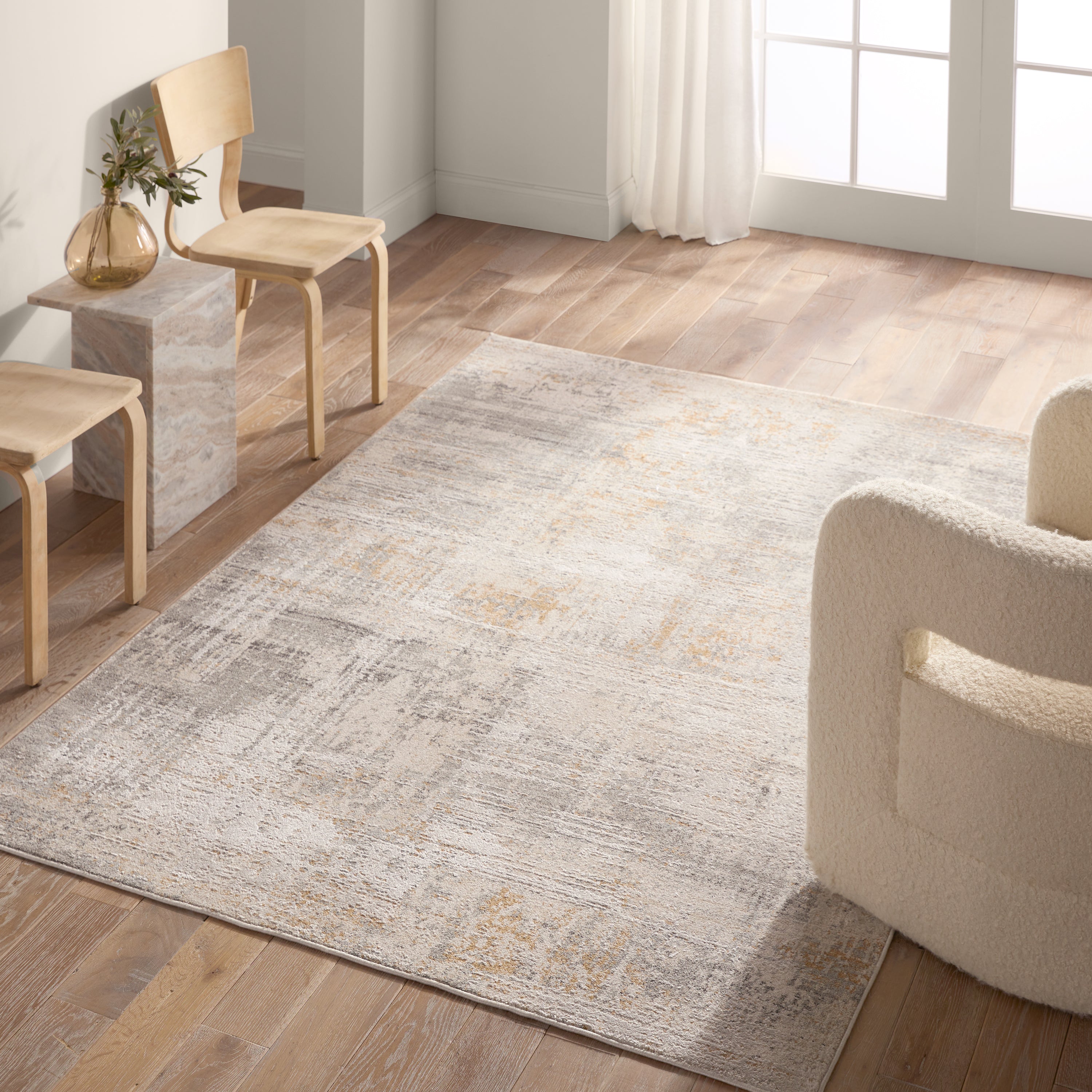 From ethereal abstract motifs to elegant scrolling florals, the Thalia collection boasts a soft, tonal touch that complements an array of interior styles. The distressed, abstract design of the Alister area rug pairs effortlessly with the grey, cream, and tan colorway. Both water and stain-resistant, the high-low polyester and polypropylene fibers are easy to clean while maintaining a plush feel underfoot. This power loomed piece can endure high traffic areas, children, and pets, creating a perfect accent for any modern home.