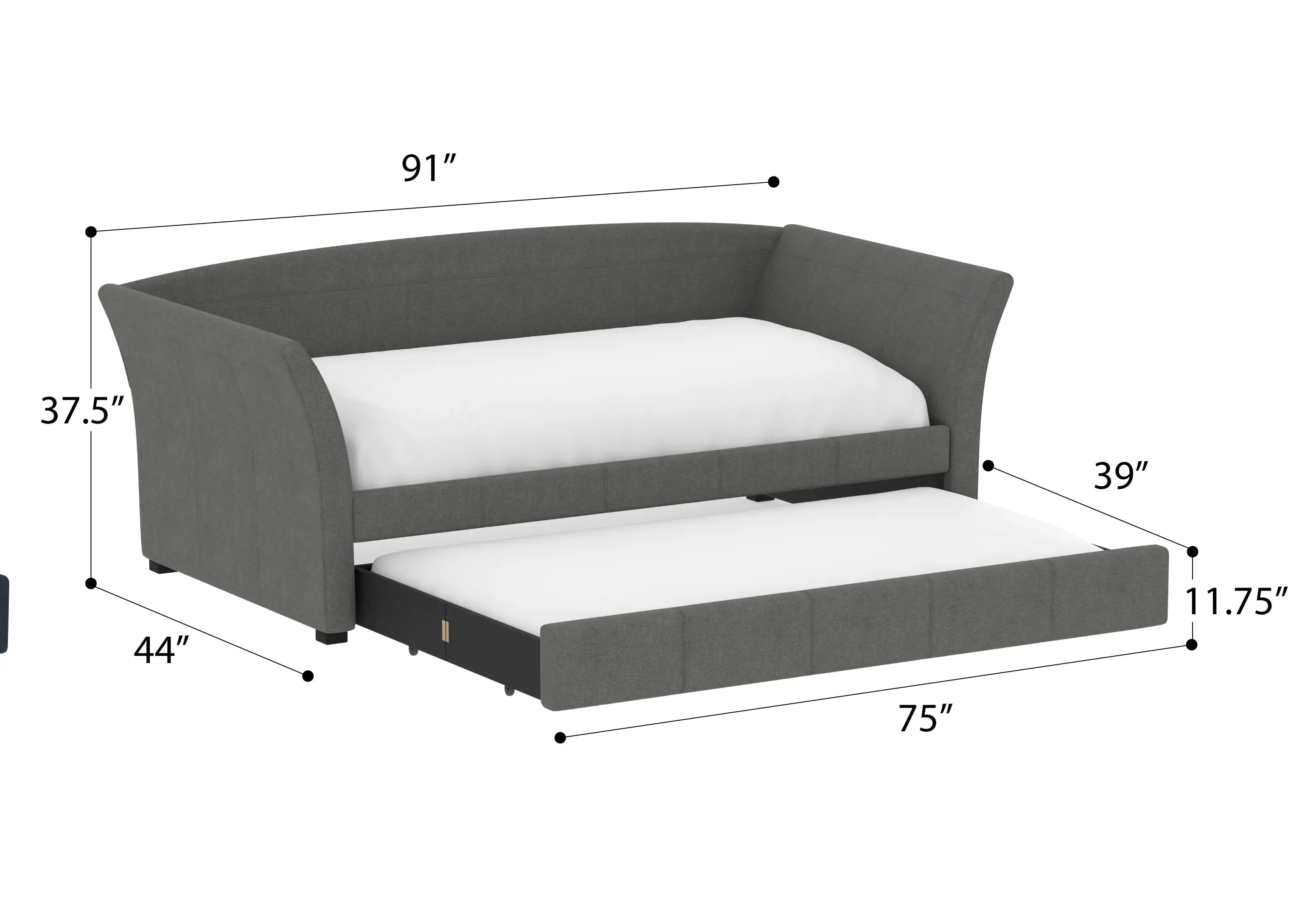 The Vienna daybed is a versatile addition to any space, whether it's a home office or a studio apartment. Its flared arms and gently curved back are upholstered in a gray woven fabric, offering a stylish look. By day, pile on the pillows to create the perfect lounging spot; by night, pull back the covers for a cozy bed. The convenient trundle pulls out effortlessly, serving as hidden storage with a divider bar or accommodating a second twin mattress for overnight guests. Enjoy the extra functionality and charm the Vienna daybed will bring to your home.
