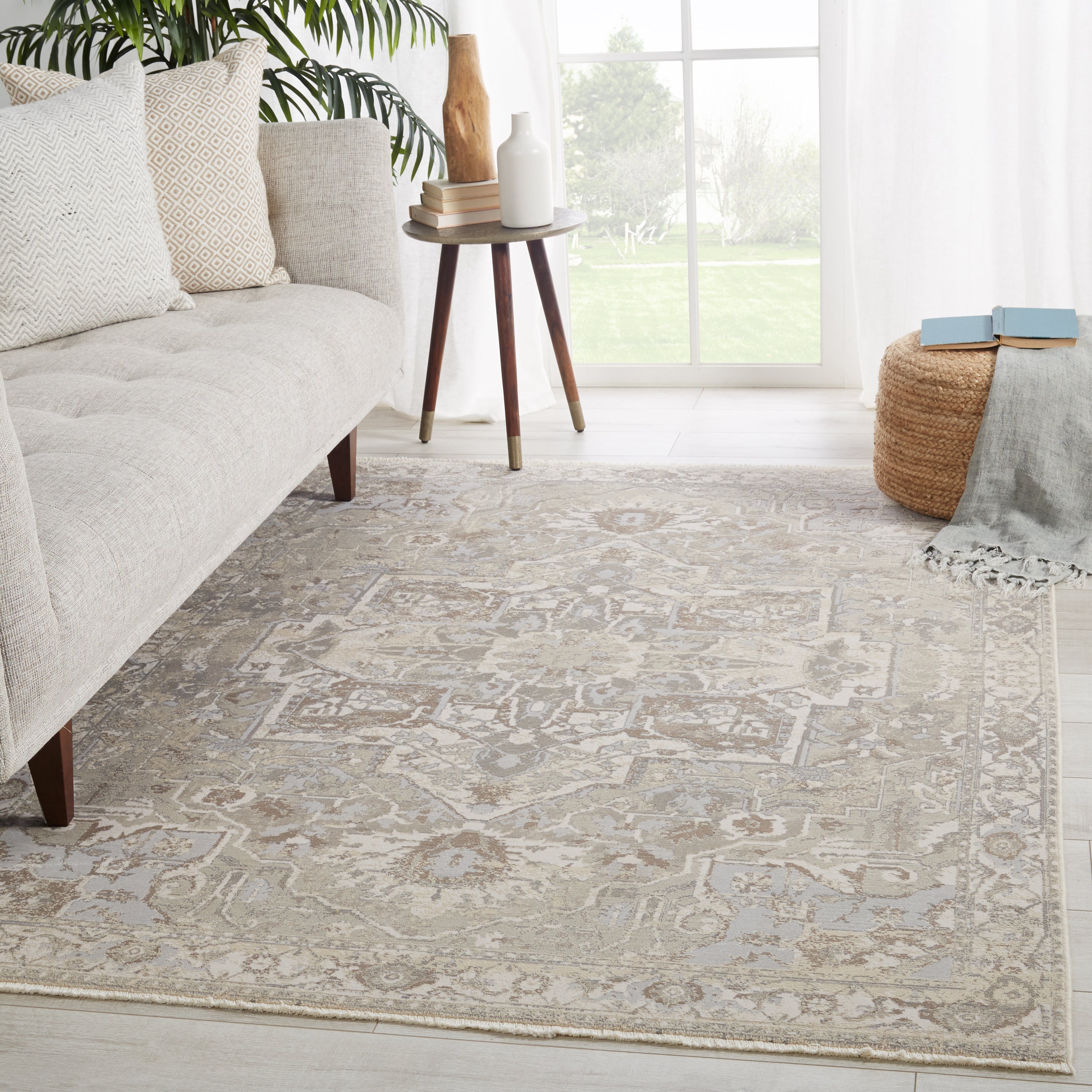 The elegant Vienne collection showcases the on-trend blanc de blanc look for an effortless and luxuriously vintage statement. The Alain rug boasts a subtly distressed center medallion motif in tonal hues of cream, silver, cool grey, and light taupe. Soft and lustrous, this chameleon-like design emulates the timeless style of a Turkish hand-knotted rug, but in an accessible polyester and viscose power-loomed quality.