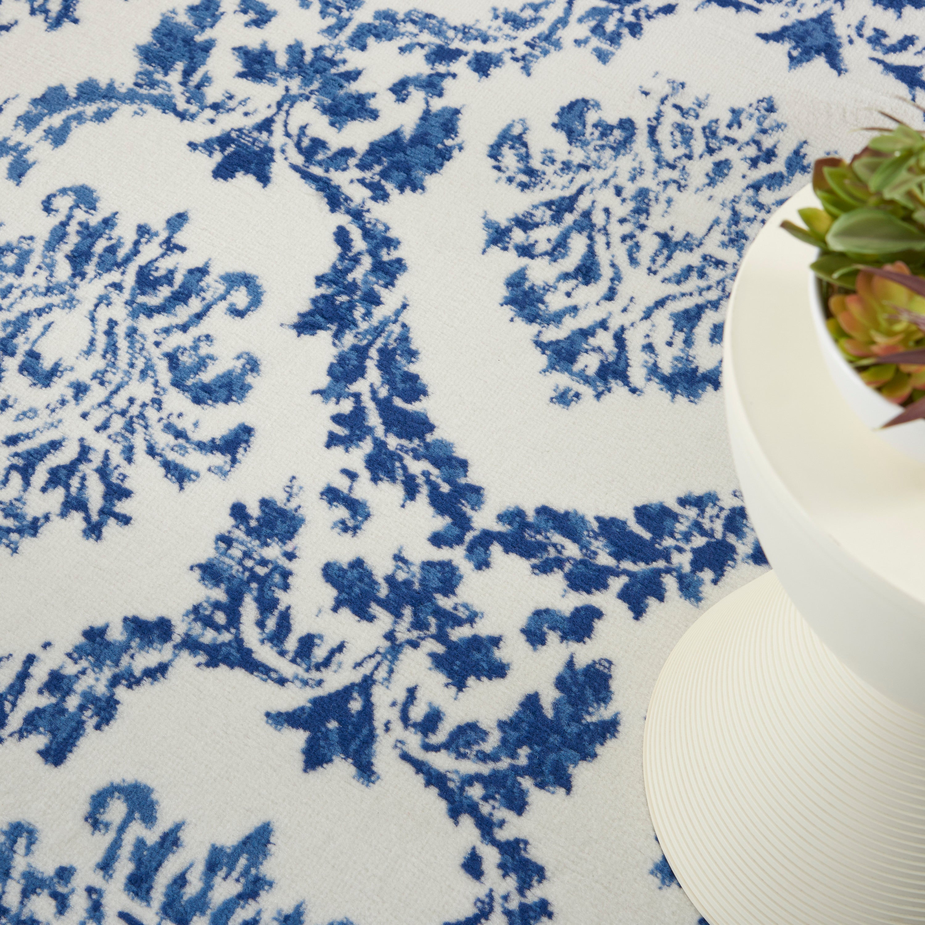 In a striking balance between rustic and elegant, this Whimsicle Collection area rug channels classic French country charm with its oversized damask pattern. A subtly distressed patina in a neutral blend of ivory and navy creates a comfortably lived-in effect that is at once welcoming and pleasing. Power Loomed of soft polyester with a low profile for a seamless fit under your sofa, dining room table, or near areas that need door clearance.