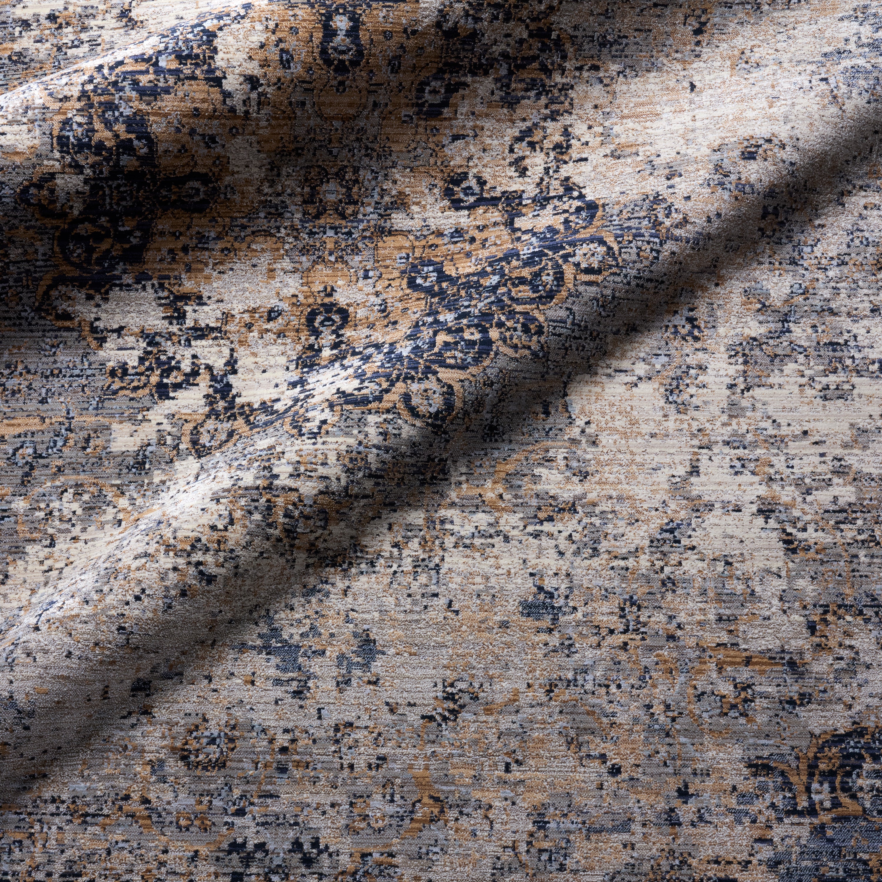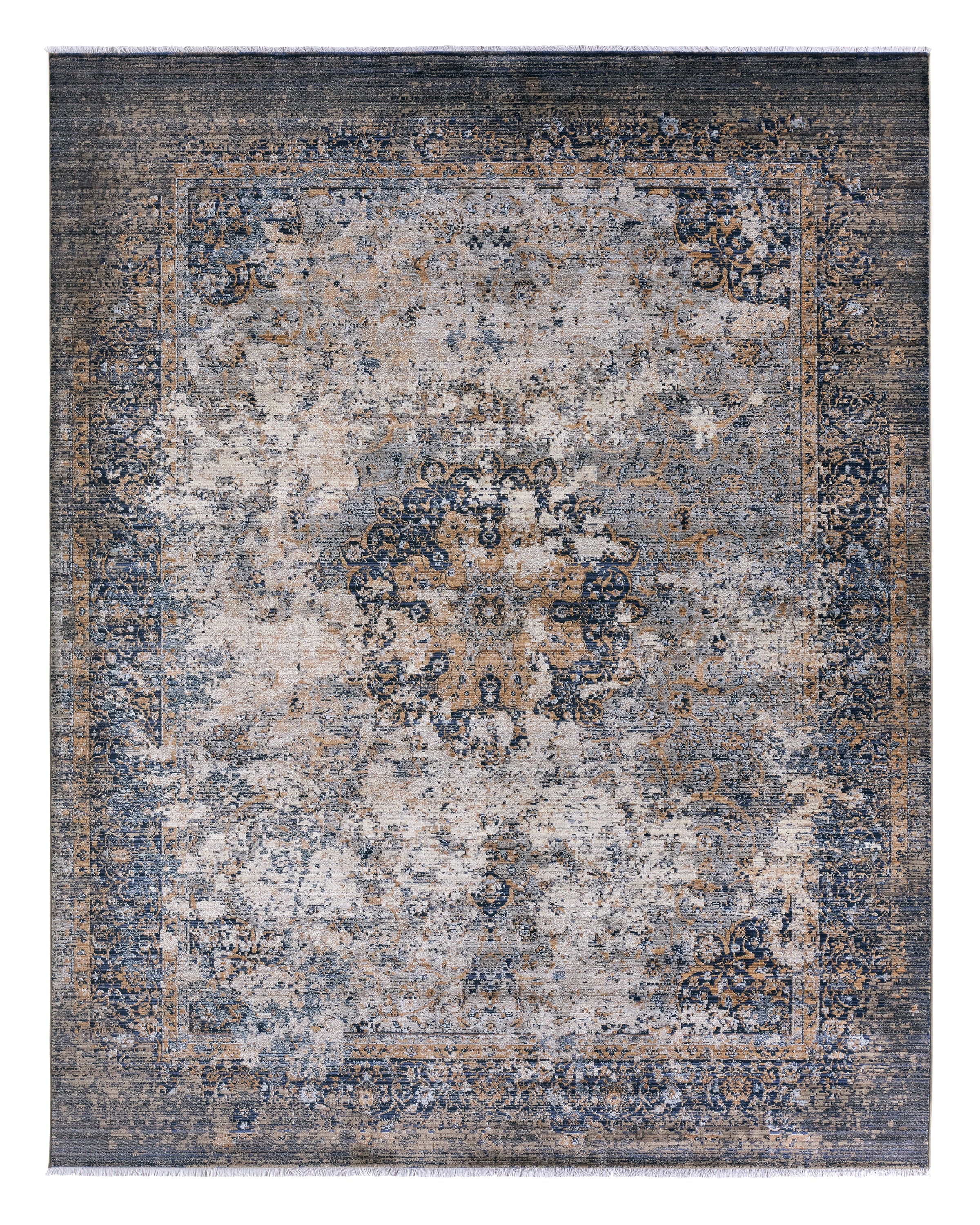 Inspired by the vintage perfection of sun-bathed Turkish designs, the Zefira collection showcases detailed traditional motifs that have been updated with on-trend, saturated colorways. The Enyo rug boasts an erased medallion in deep, moody tones of blue, black, ivory, grey, and gold. This power-loomed rug features cotton fringe detailing, a natural result of weft yarns, that echoes hand-knotted construction and adds brilliant texture to the plush, durable polypropylene pile.